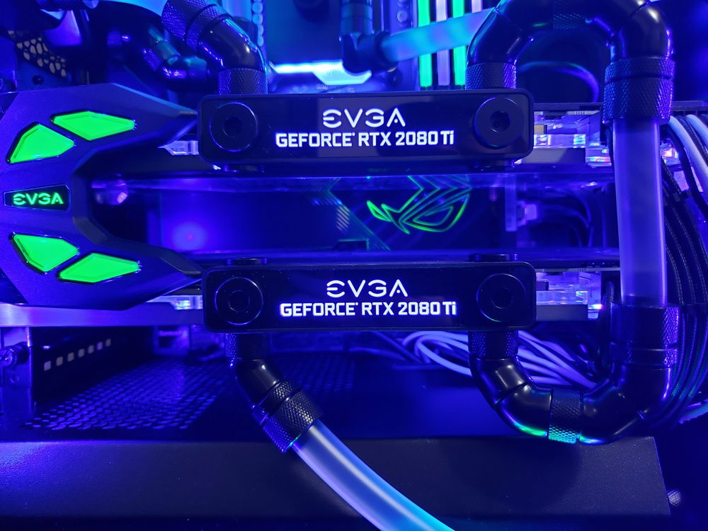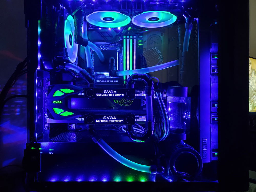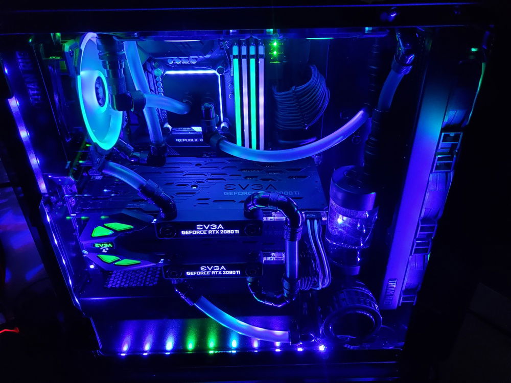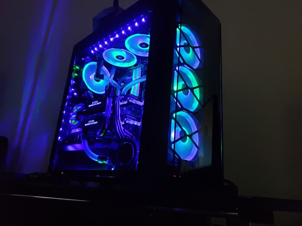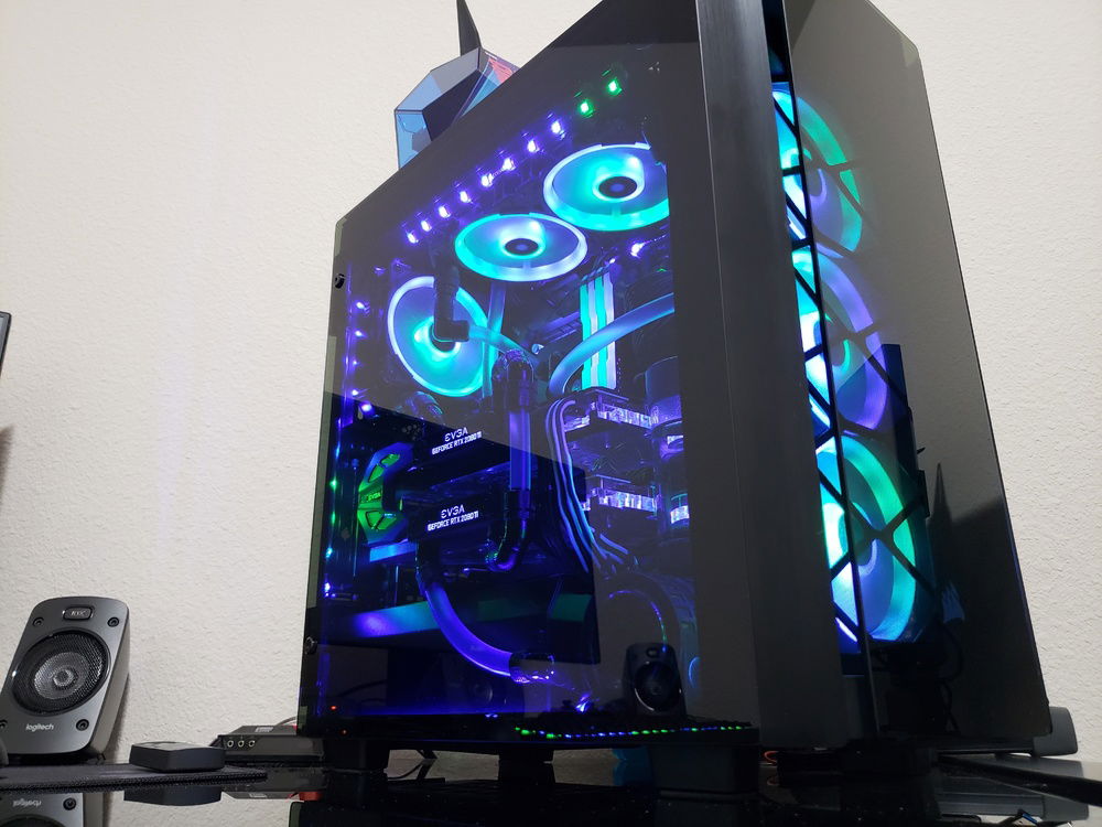 This build started off with 2 EVGA 1080 TI FTW3 Hybrids then I broke down and got the 2080 TI FTW3 Hybrids, and then something inside me snapped and I bought the Hydro Copper blocks and put in a full custom loop. I also started out with a Corsair H150i Pro, which actually cooled the CPU better than my custom loop because I had a push/pull setup on it, but I don't have the room for that now and I don't think the LL120 fans are capable of pulling in the amount of air that I need. I might need to change out my fans come summer. The 9900K is overclocked to 5.1ghz across all cores at 1.335v. I also have the 2080 TI's overclocked to 2085mhz.