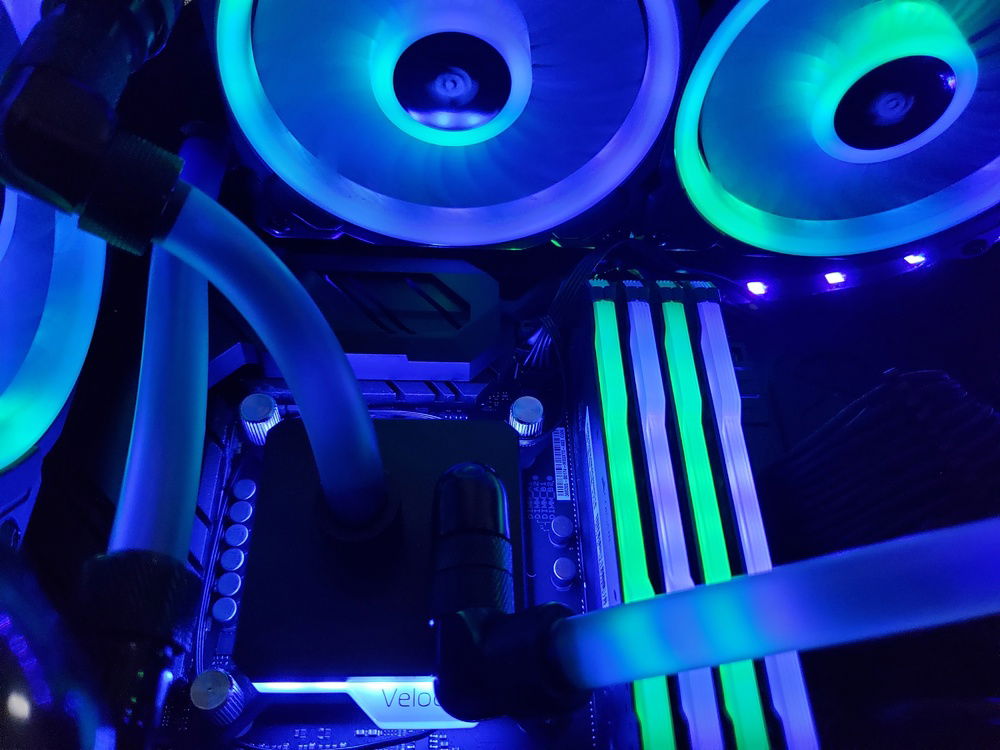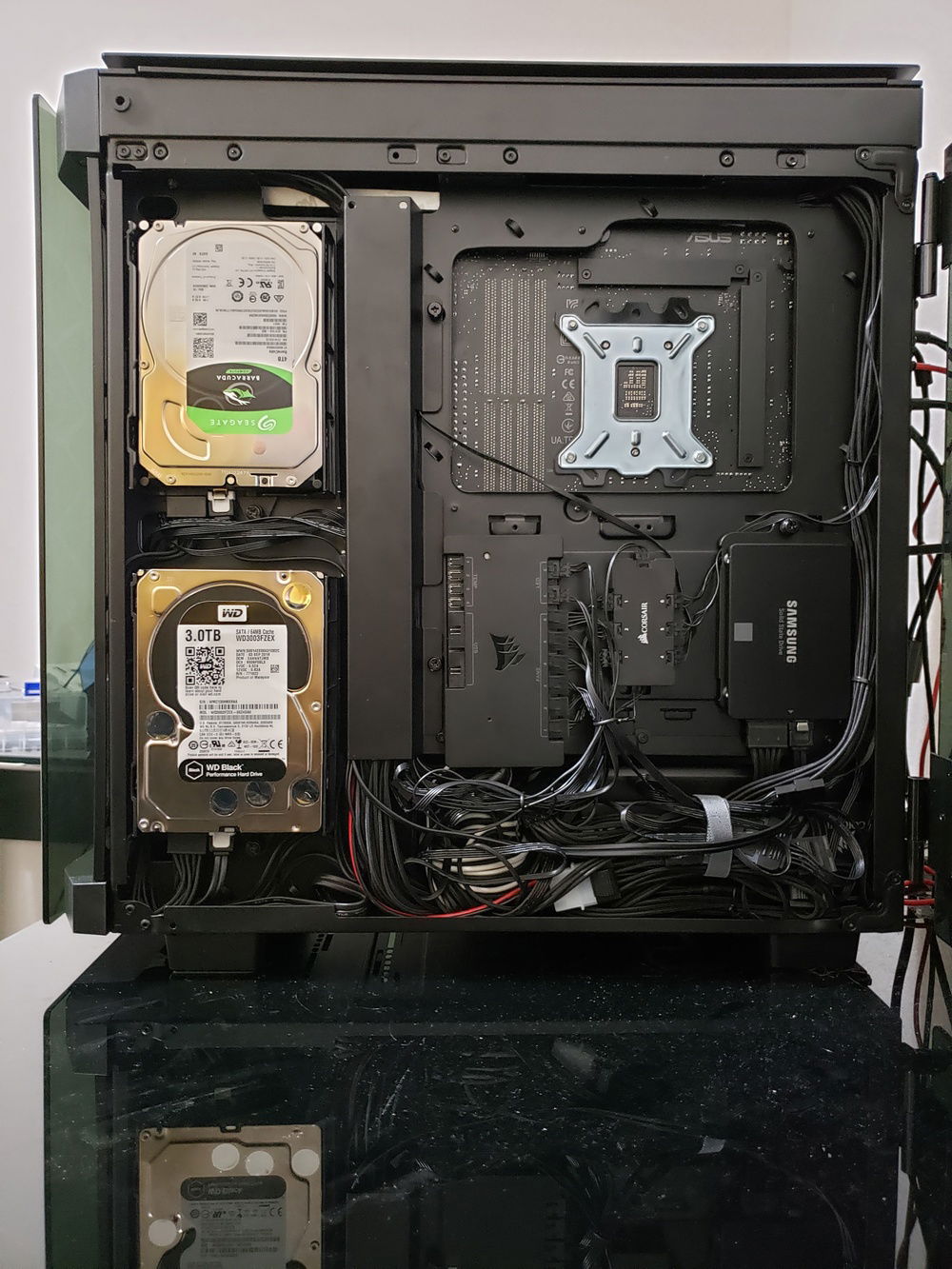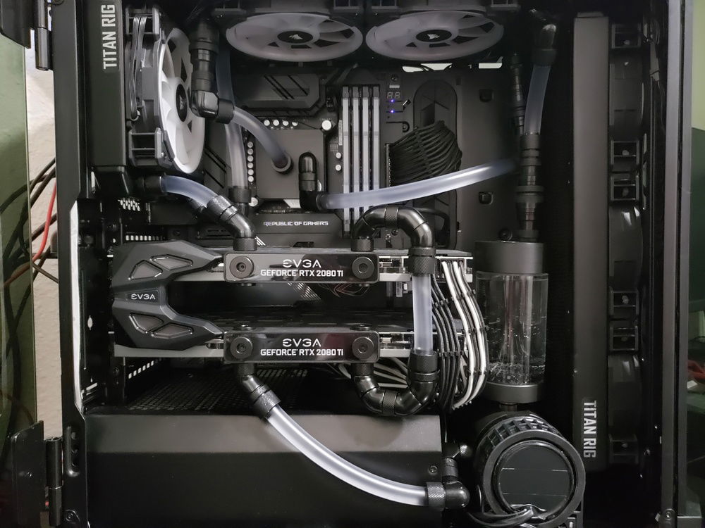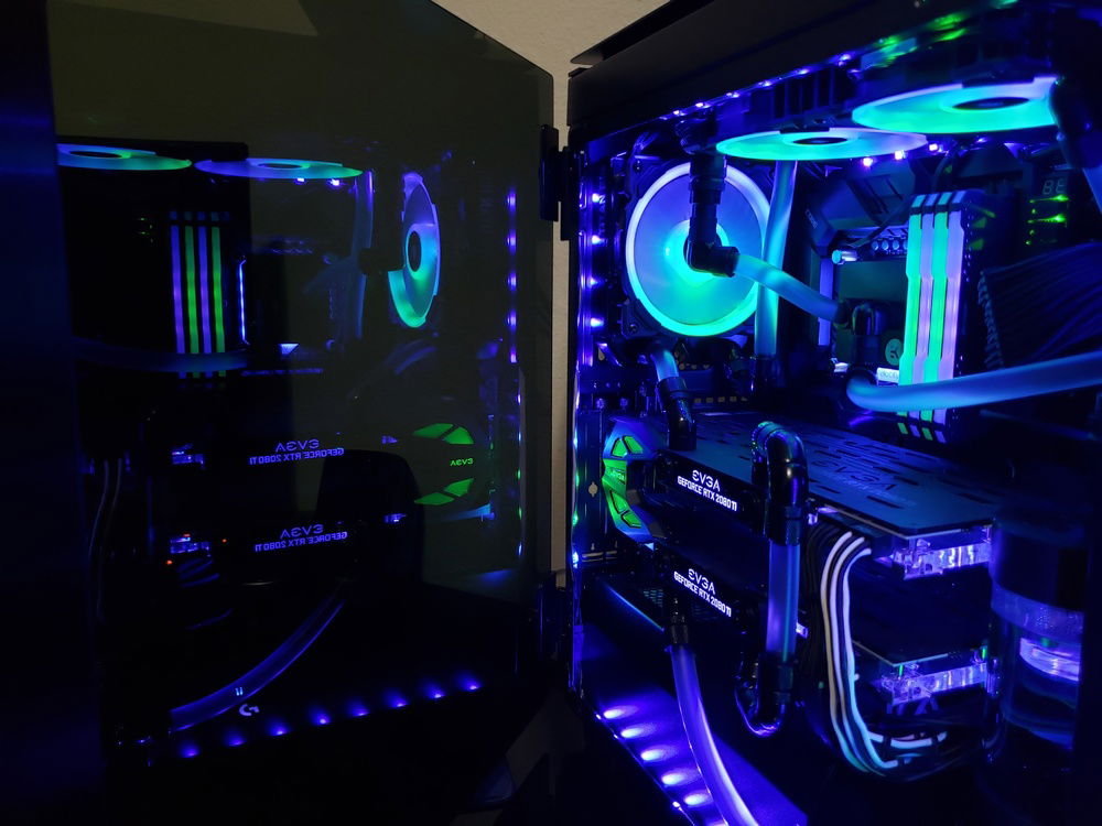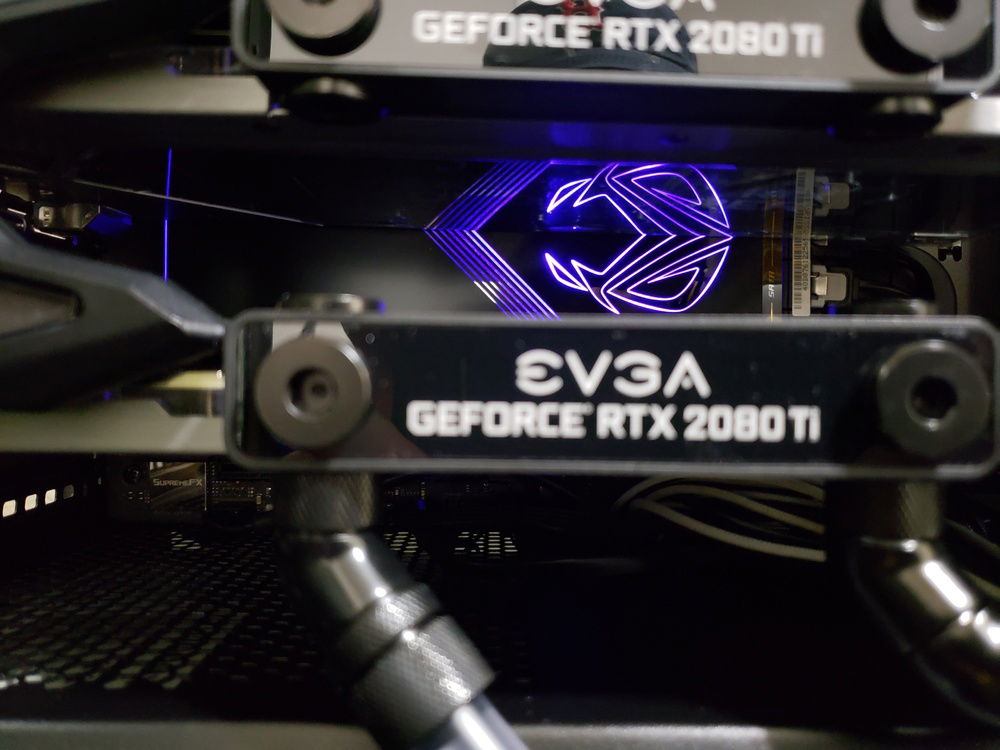 This build started off with 2 EVGA 1080 TI FTW3 Hybrids then I broke down and got the 2080 TI FTW3 Hybrids, and then something inside me snapped and I bought the Hydro Copper blocks and put in a full custom loop. I also started out with a Corsair H150i Pro, which actually cooled the CPU better than my custom loop because I had a push/pull setup on it, but I don't have the room for that now and I don't think the LL120 fans are capable of pulling in the amount of air that I need. I might need to change out my fans come summer. The 9900K is overclocked to 5.1ghz across all cores at 1.335v. I also have the 2080 TI's overclocked to 2085mhz.