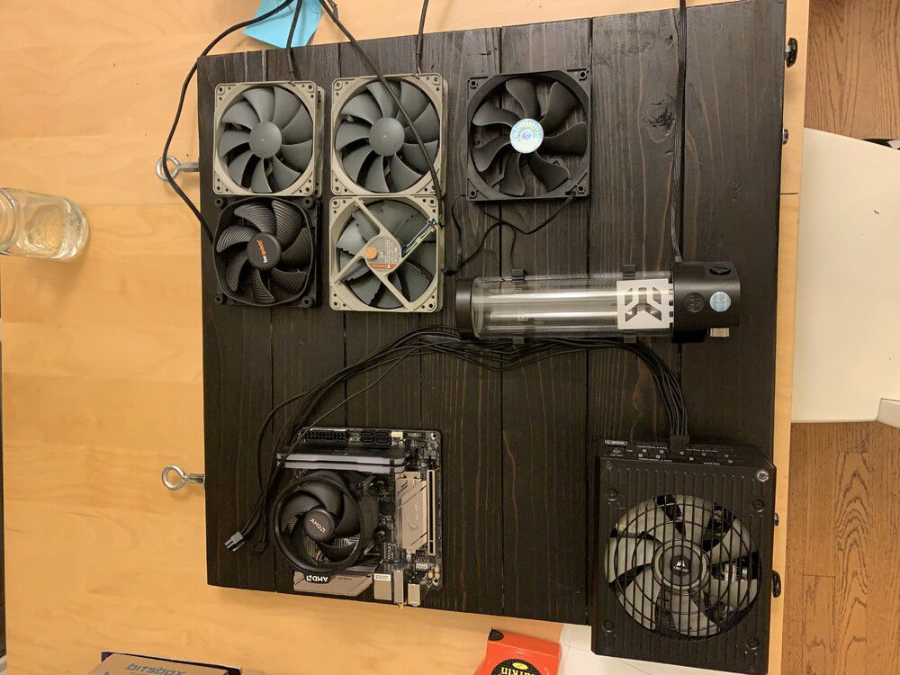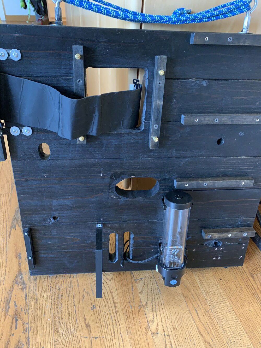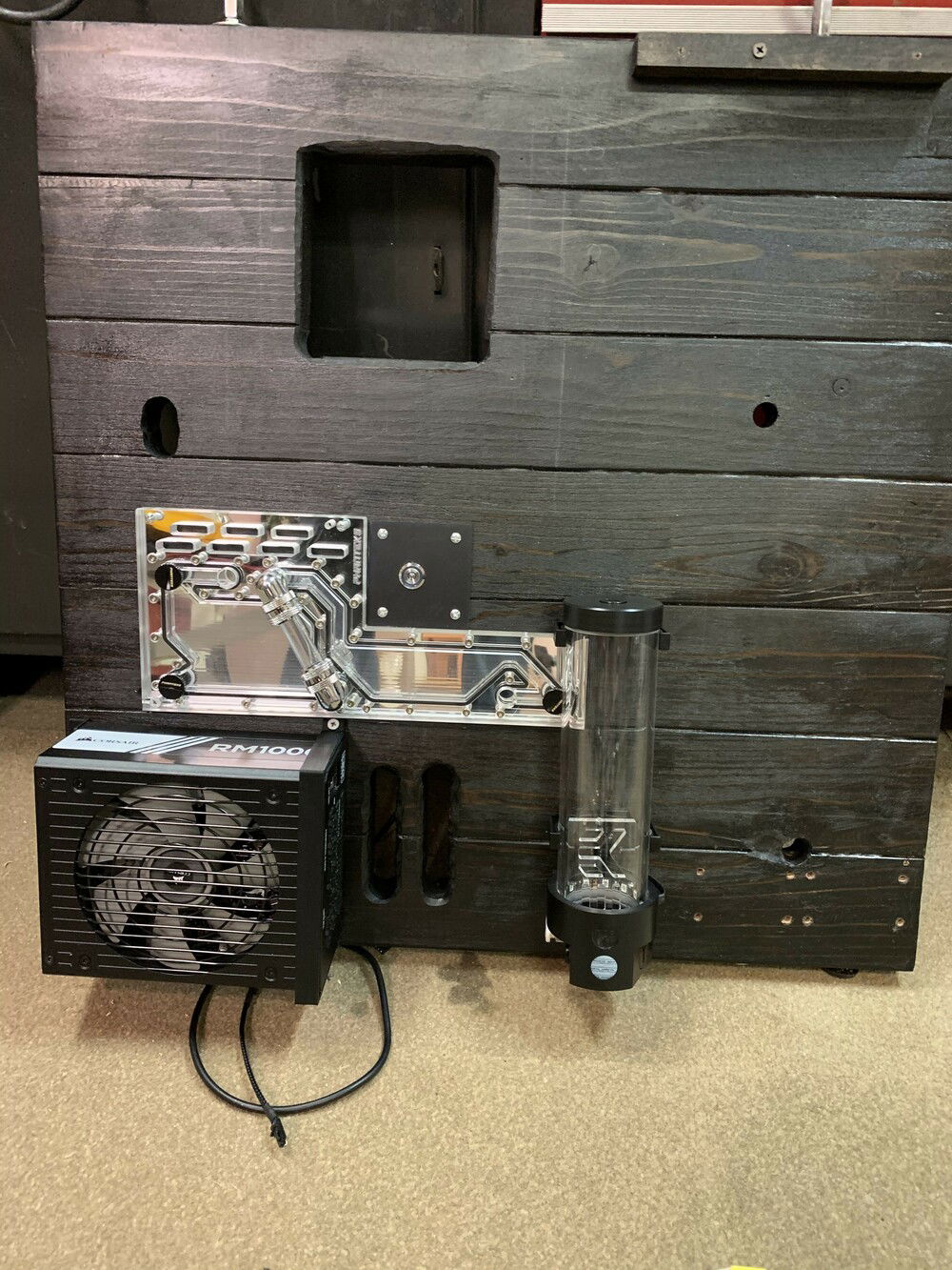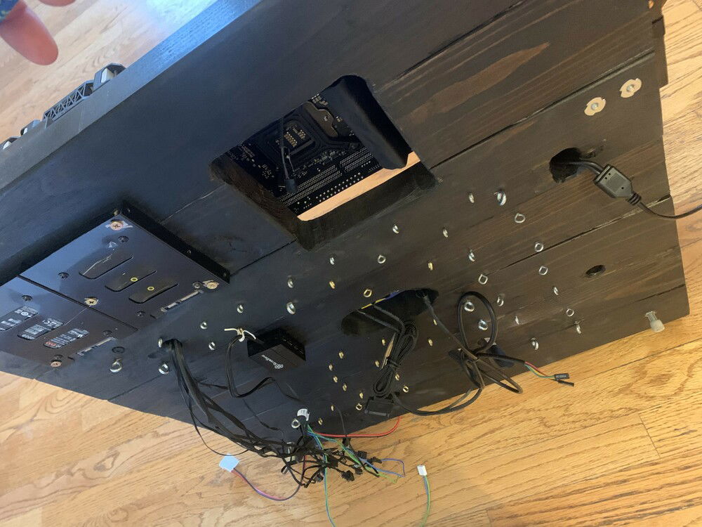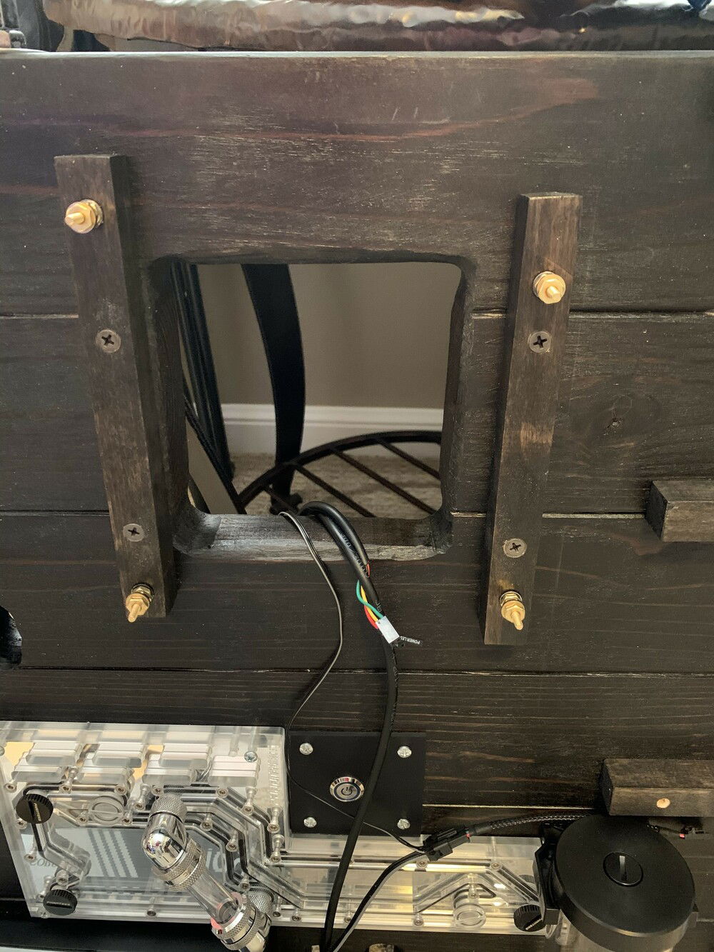 The case is solid 2x4 left over from home projects. Used wood glue and long bolts to press them together and used a belt sander to level it after the wood warped a little. Made my motherboard stand offs with brass screws and nuts. I think I could have done a better job with cable management in the back perhaps cut cable channels into the back or the wood and integrate the tubes more into the wood case