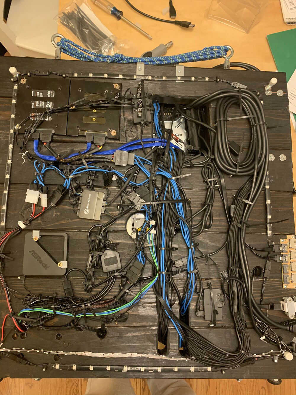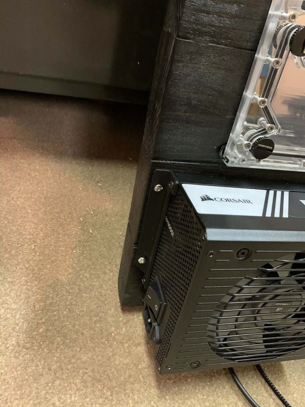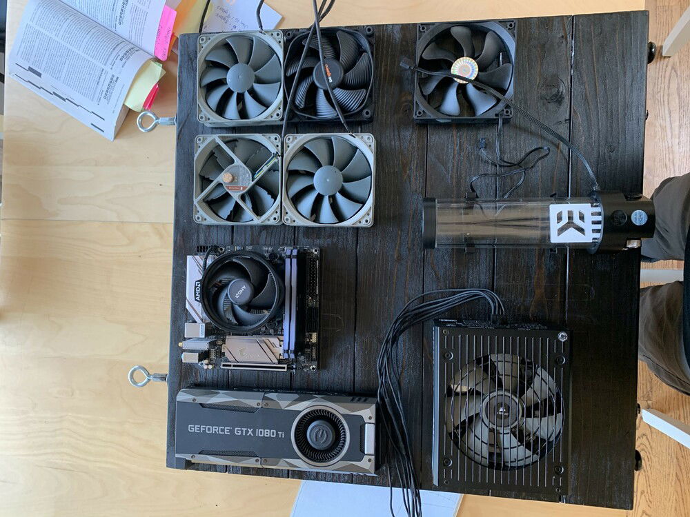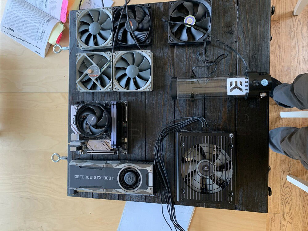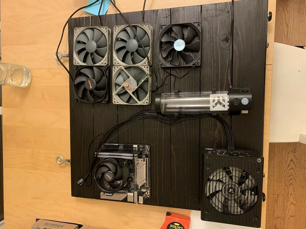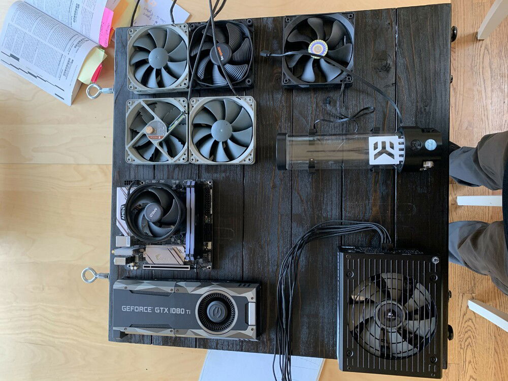 The case is solid 2x4 left over from home projects. Used wood glue and long bolts to press them together and used a belt sander to level it after the wood warped a little. Made my motherboard stand offs with brass screws and nuts. I think I could have done a better job with cable management in the back perhaps cut cable channels into the back or the wood and integrate the tubes more into the wood case