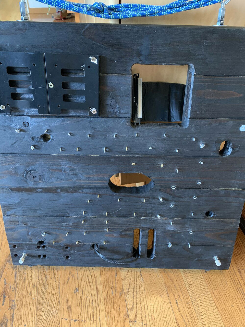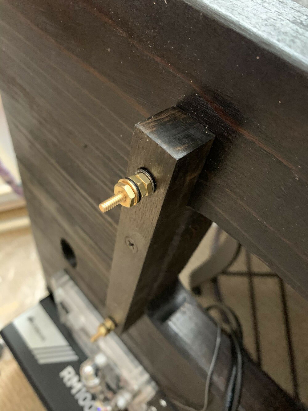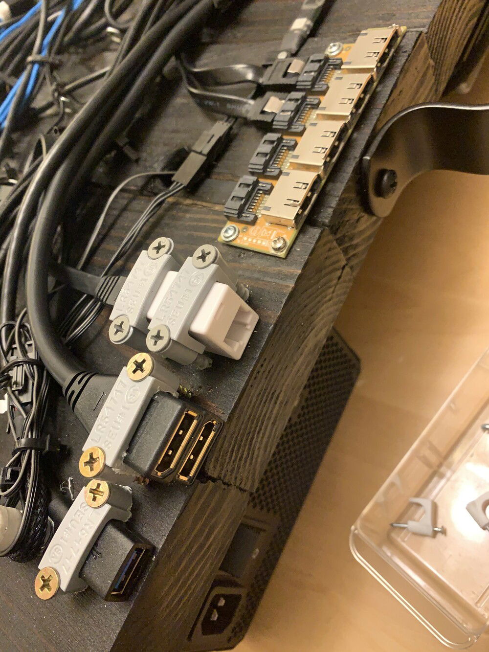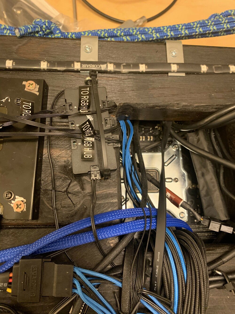 The case is solid 2x4 left over from home projects. Used wood glue and long bolts to press them together and used a belt sander to level it after the wood warped a little. Made my motherboard stand offs with brass screws and nuts. I think I could have done a better job with cable management in the back perhaps cut cable channels into the back or the wood and integrate the tubes more into the wood case