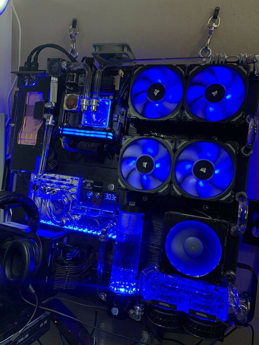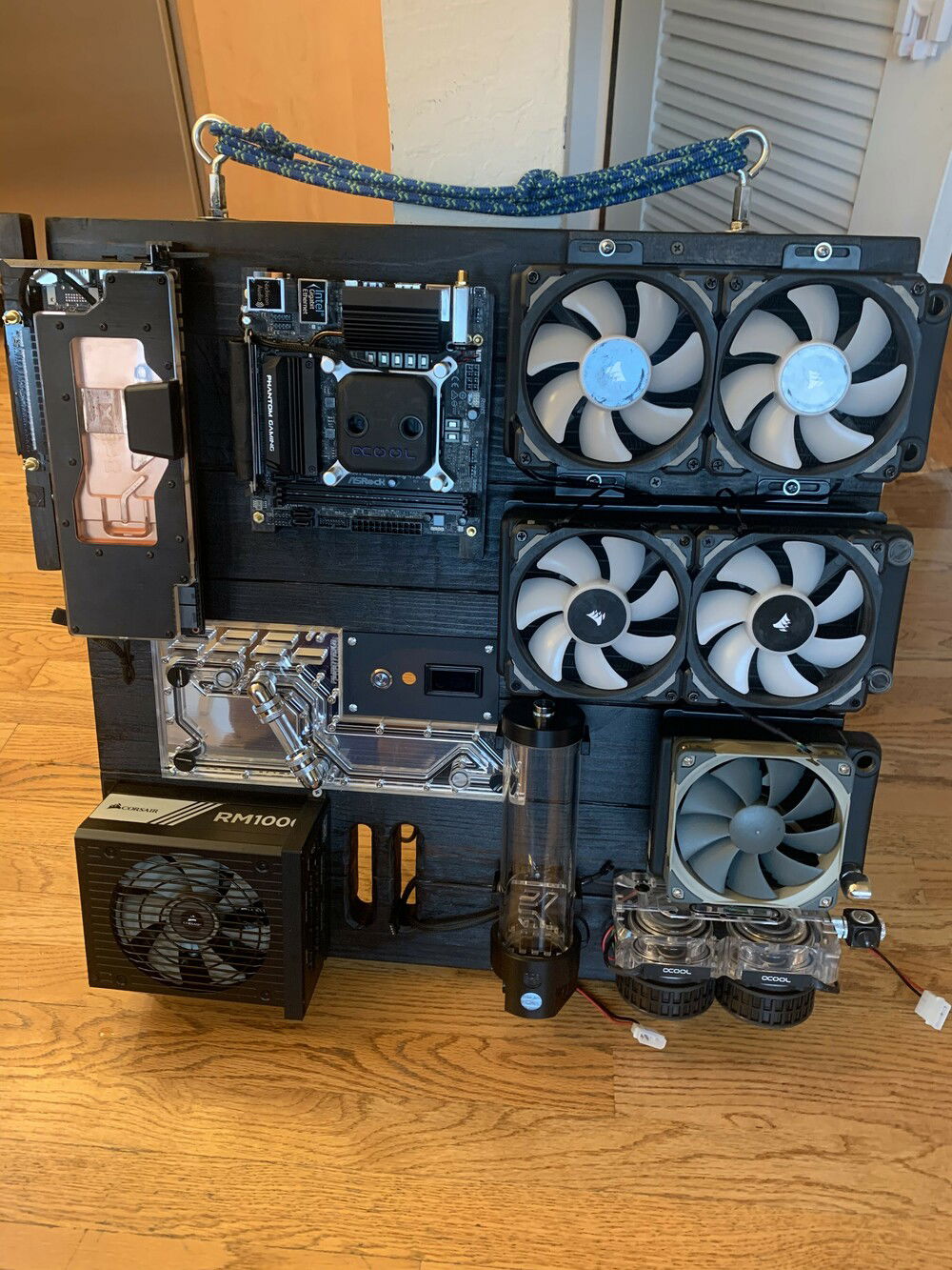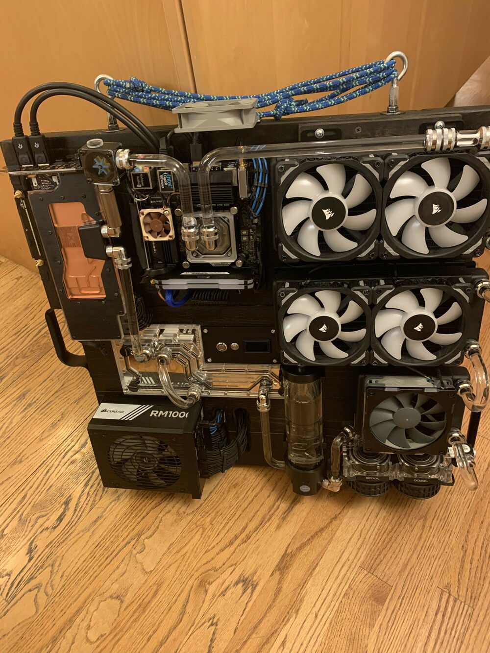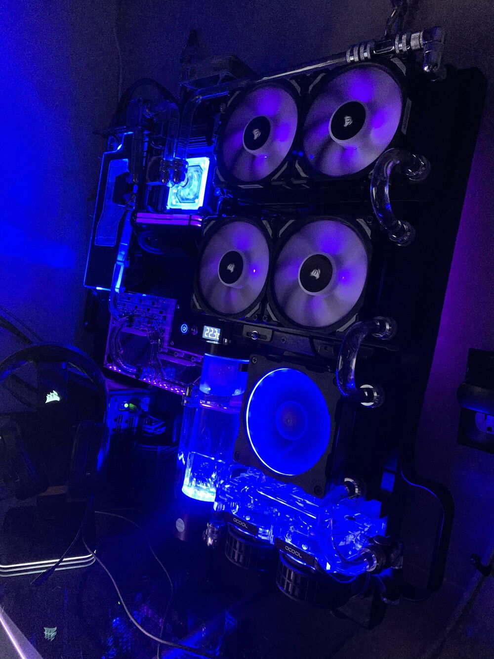 Wanted to try my hand at a custom wood wall case with full custom hard tube. The cooling is definitely overkill. Wanted to overclock and keep everything whisper quiet. This build definitely did that.