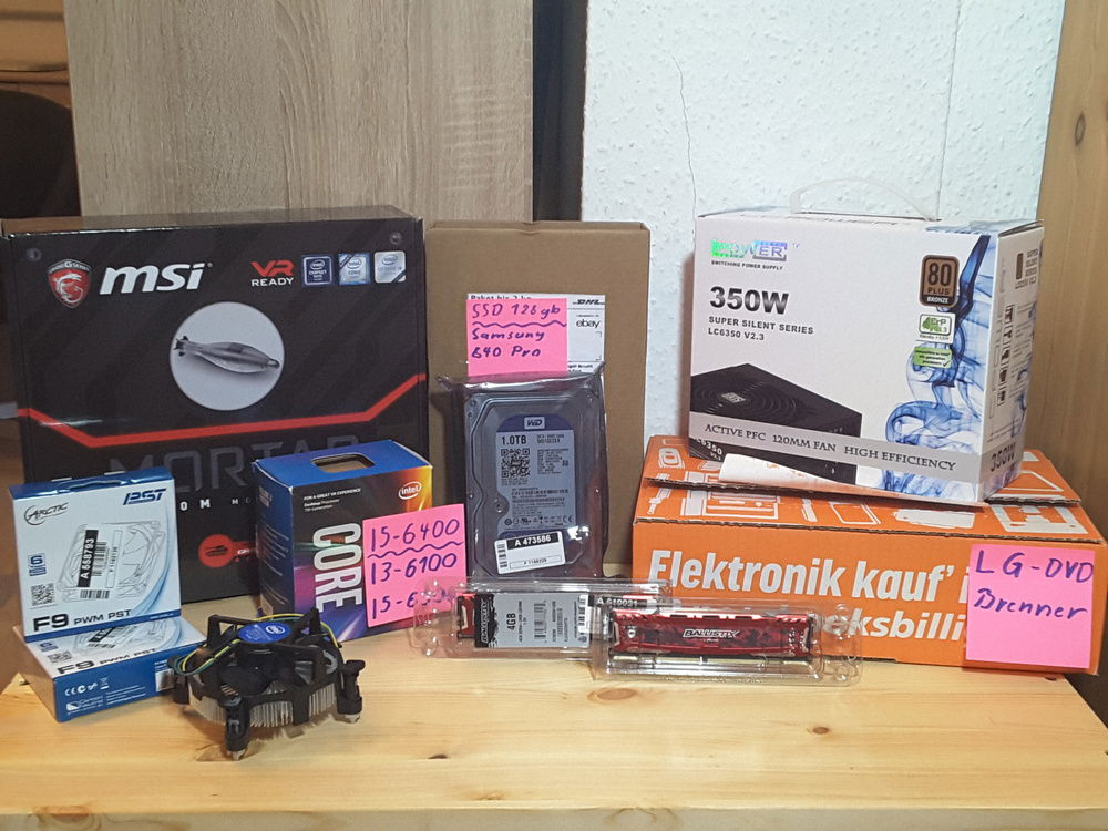 I5 6400 MSI B250 Motar 2x 4Gb of Crucial Ballistix Sport LT 2133 WD Blue 1Tb Hard Drive Samsung 840 Pro 128Gb SSD LC Power Super Silent 350W Power supply 4x Arctic F9 PWM PST Fans 1x Arctic F9 PWM PST Fan LG Bulk DVD Burner "Wood case" DeLOOK USB/Audio front Hub And the Stock Intel CPU cooler