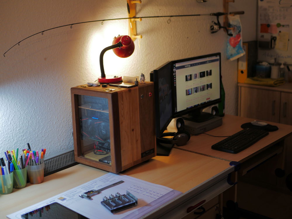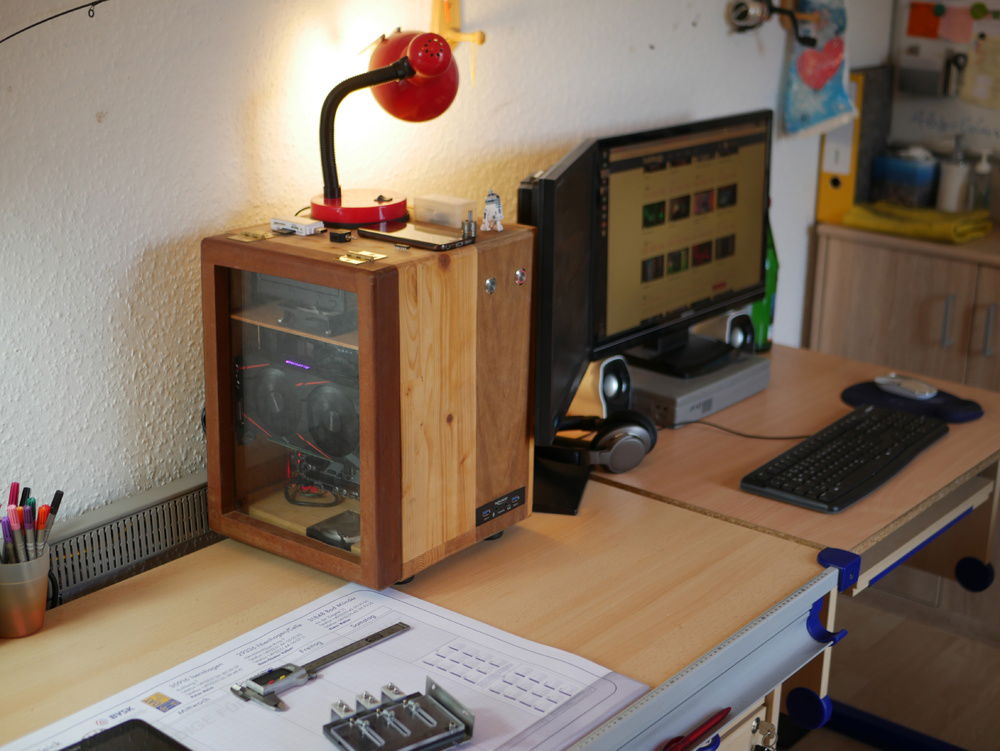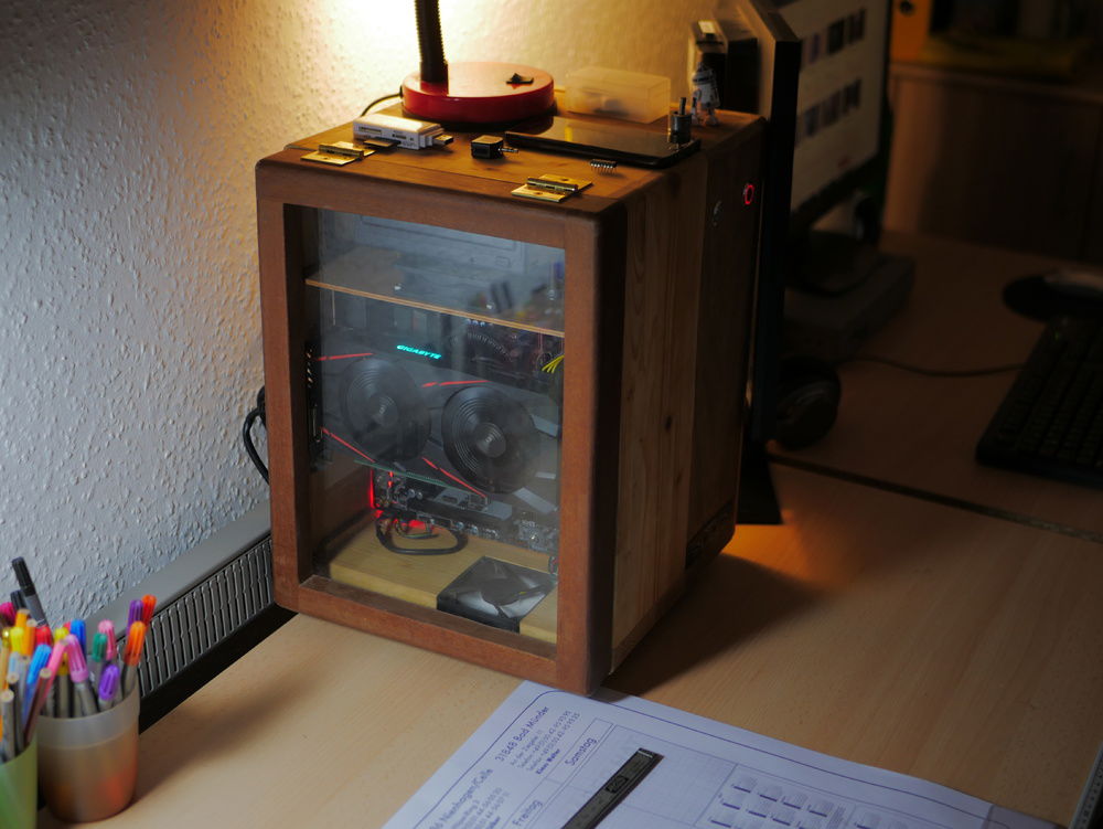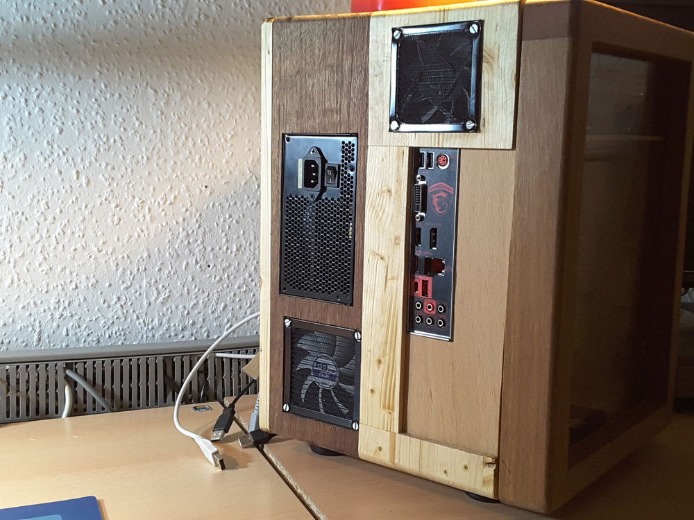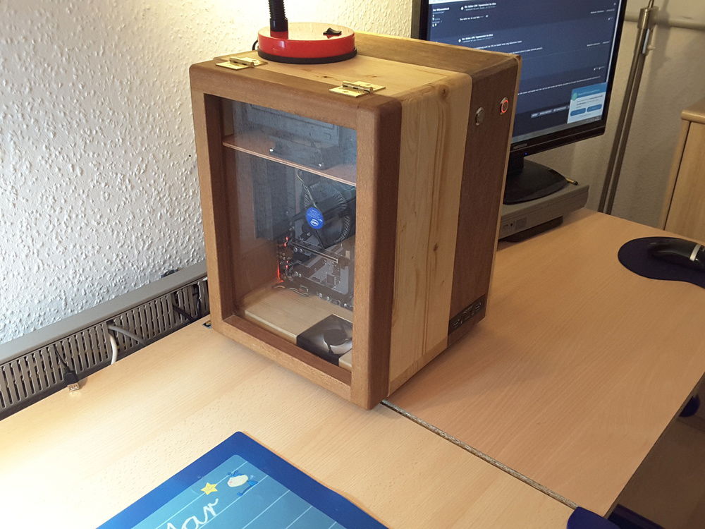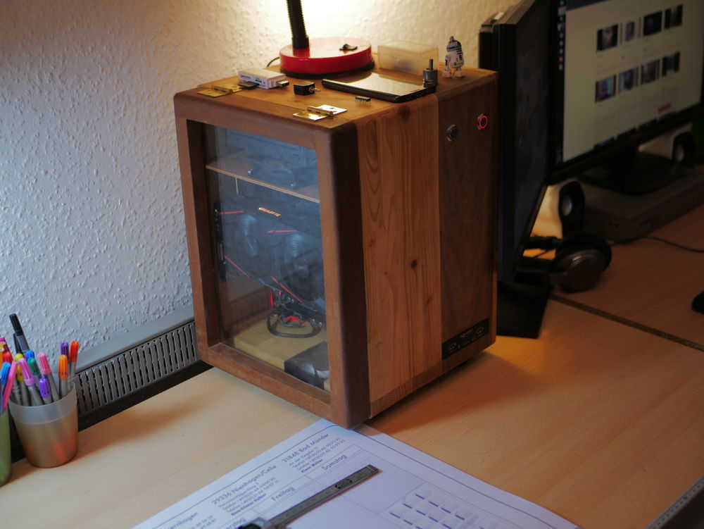 This PC was build by me here in germany in my tiny Workshop. It was designed with sketchUP and than build entirely in Winter 2015 on just four Squaremeters. All Parts of the Case are made from Wood and it even has a quite good cable management area inside. Two Centimeters of Wooddust where just everywhere on the ground as build was completed. It was in first attempt just the idea to build a more nicer looking "desktop PC" as i was not planing on gaming anything on it. Except NES Emulator So i took simple PC parts in the area of around 500€ (without a Graphics Card, "man that was expensiv compared to these days"...