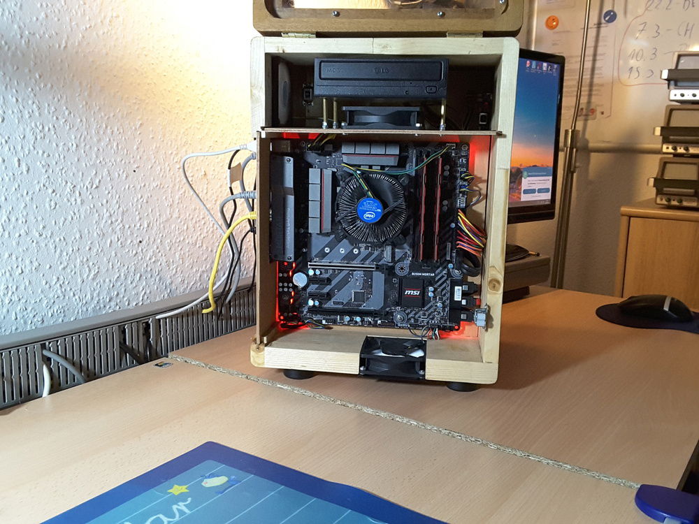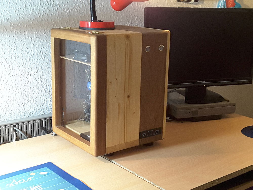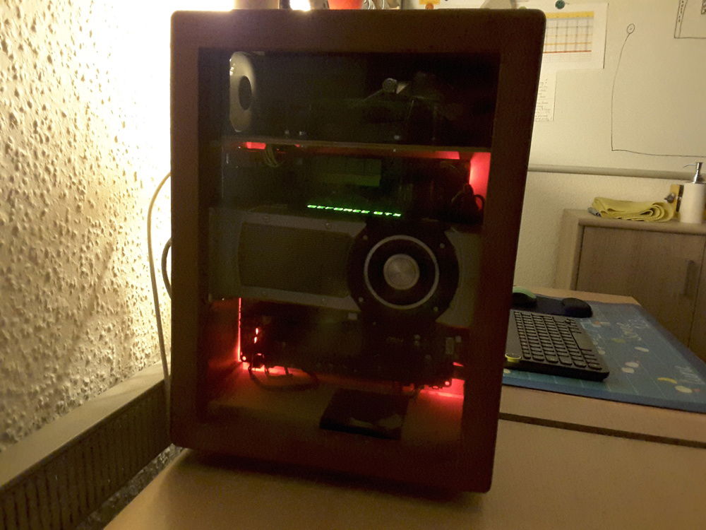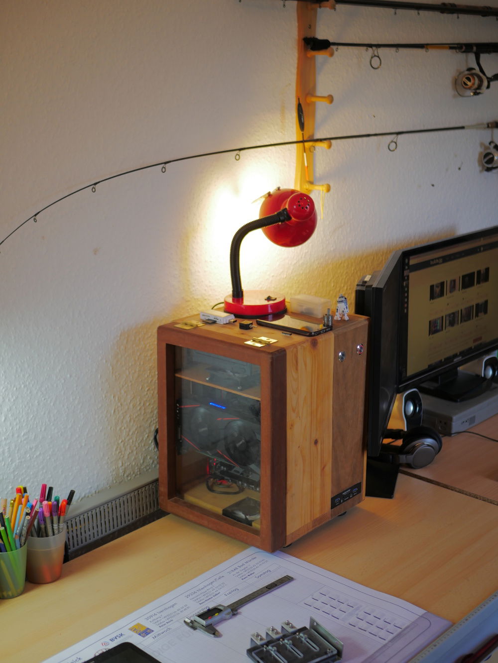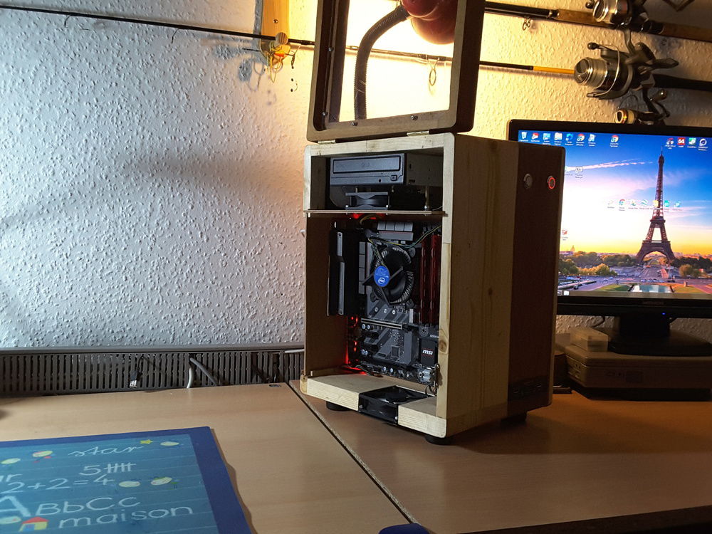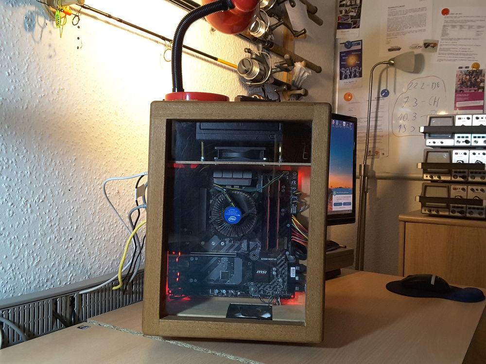 This PC was build by me here in germany in my tiny Workshop. It was designed with sketchUP and than build entirely in Winter 2015 on just four Squaremeters. All Parts of the Case are made from Wood and it even has a quite good cable management area inside. Two Centimeters of Wooddust where just everywhere on the ground as build was completed. It was in first attempt just the idea to build a more nicer looking "desktop PC" as i was not planing on gaming anything on it. Except NES Emulator So i took simple PC parts in the area of around 500€ (without a Graphics Card, "man that was expensiv compared to these days"...
