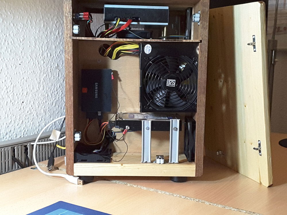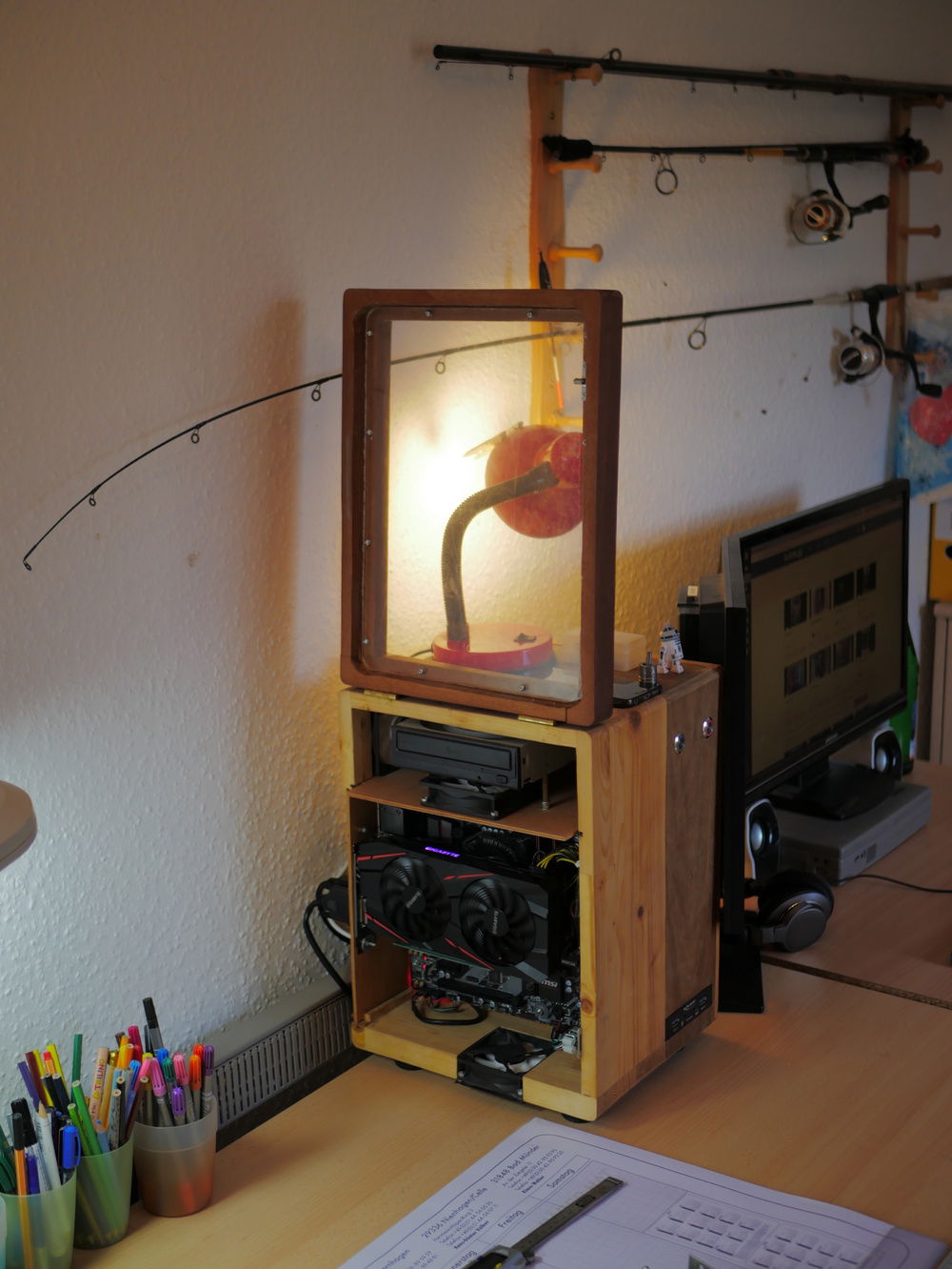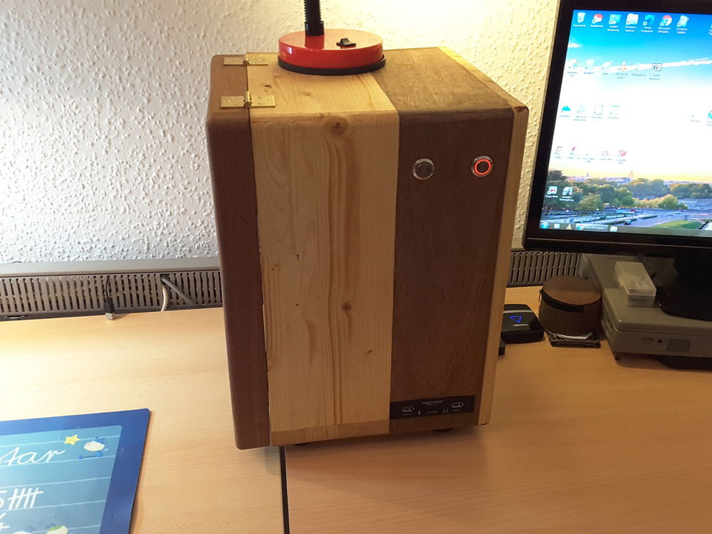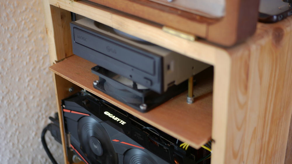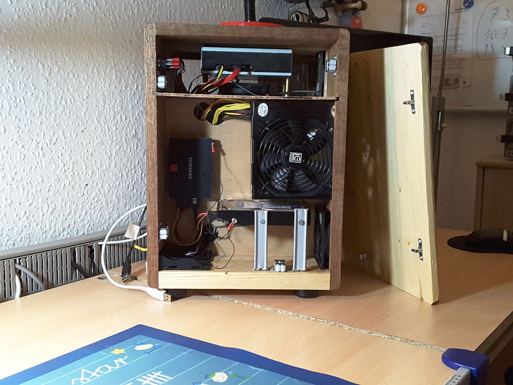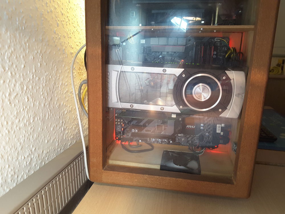 This PC was build by me here in germany in my tiny Workshop. It was designed with sketchUP and than build entirely in Winter 2015 on just four Squaremeters. All Parts of the Case are made from Wood and it even has a quite good cable management area inside. Two Centimeters of Wooddust where just everywhere on the ground as build was completed. It was in first attempt just the idea to build a more nicer looking "desktop PC" as i was not planing on gaming anything on it. Except NES Emulator So i took simple PC parts in the area of around 500€ (without a Graphics Card, "man that was expensiv compared to these days"...