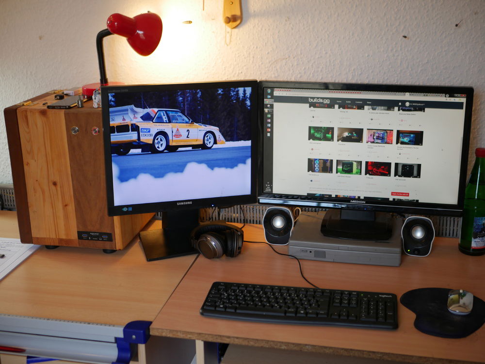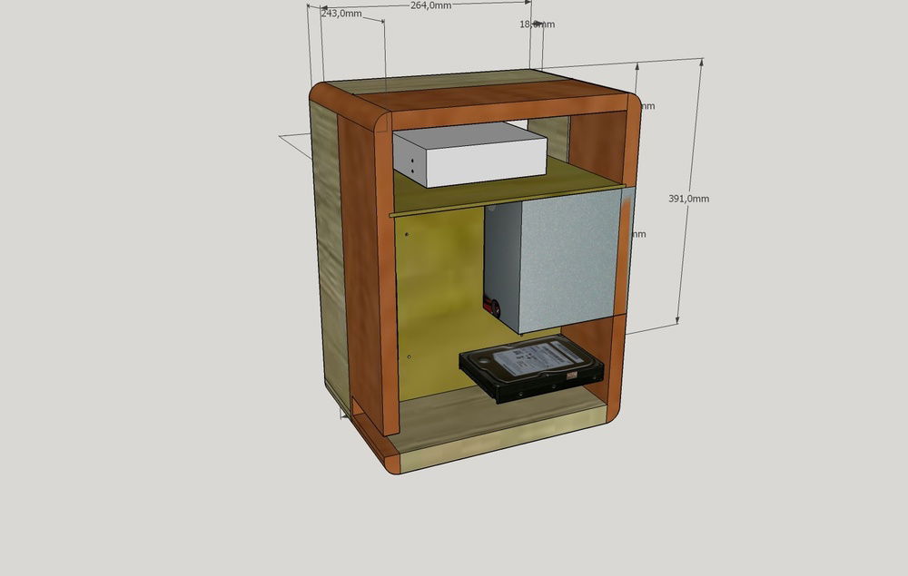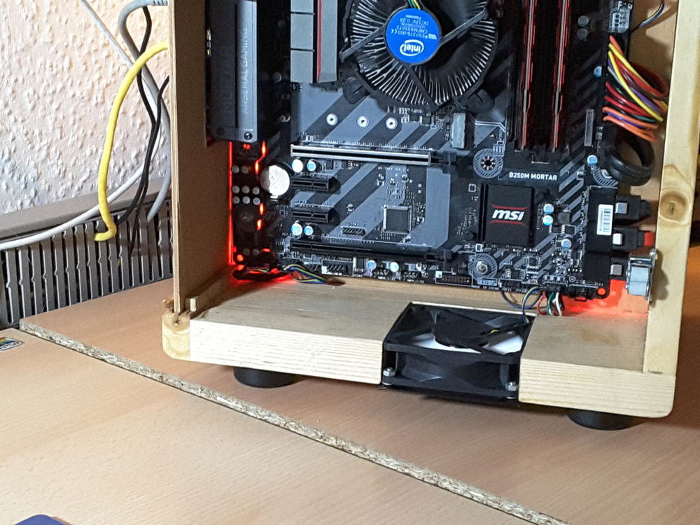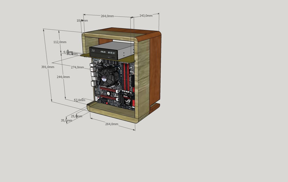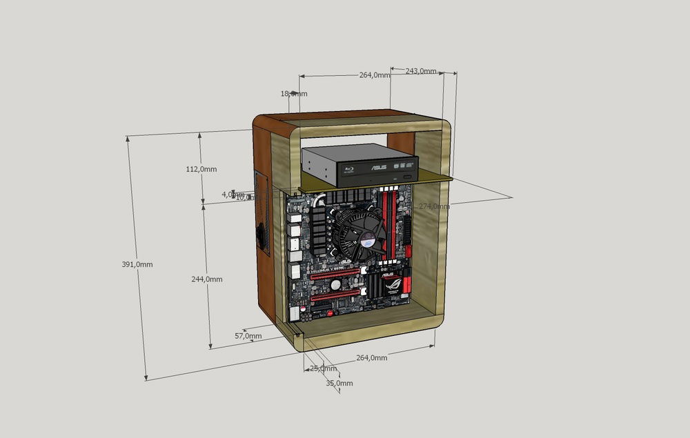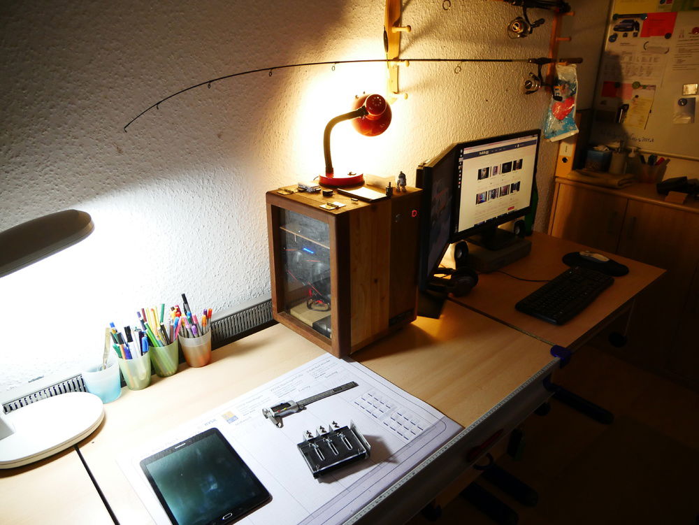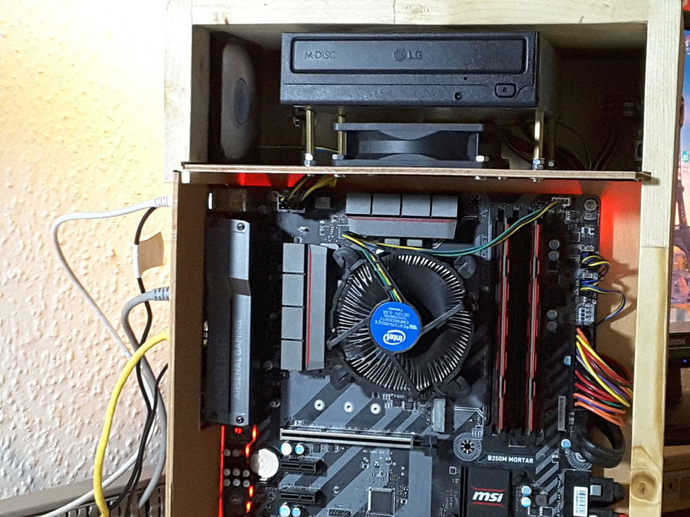 This PC was build by me here in germany in my tiny Workshop. It was designed with sketchUP and than build entirely in Winter 2015 on just four Squaremeters. All Parts of the Case are made from Wood and it even has a quite good cable management area inside. Two Centimeters of Wooddust where just everywhere on the ground as build was completed. It was in first attempt just the idea to build a more nicer looking "desktop PC" as i was not planing on gaming anything on it. Except NES Emulator So i took simple PC parts in the area of around 500€ (without a Graphics Card, "man that was expensiv compared to these days"...