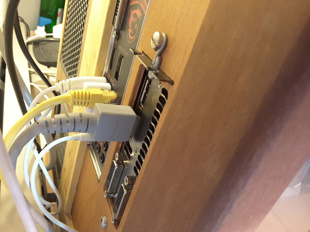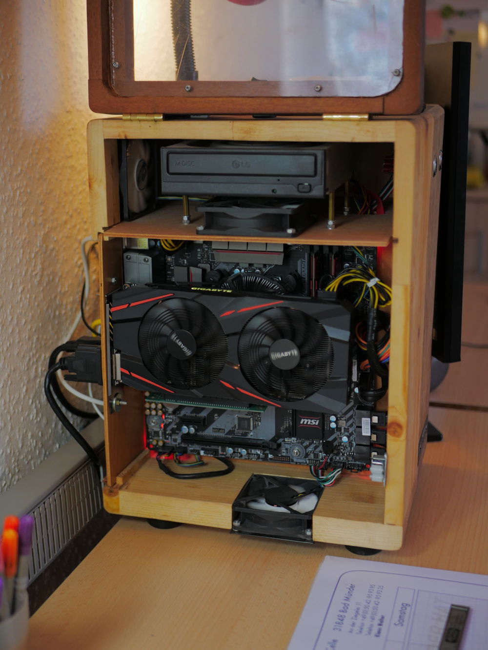 But later in 2015 i got my first game Dirt Rally... And soon Intels Graphic POWER was not enough anymore and a used GTX 770 for 80€was picked up. But the Pc was so designed that only Low Profile cards could fit in horizontally. As a work around, i bought first a flexible and than as it broke a perfect fitting static PCI extension braked to connect the Graphicscard verticaly. With that it even looked nicer than before as i could saw the full beauty of my old Founders Edition Card... And lastly in 2018 i replaced my old GTX 770 with an AMD RX580 8Gb from Gigabyte as seen in the pictures... It dos it's work to this day nicely sitting on my desk, quiet, Cool and dust free high up from the ground...