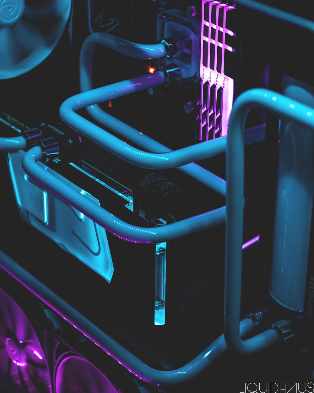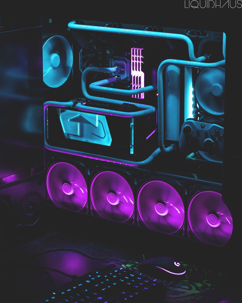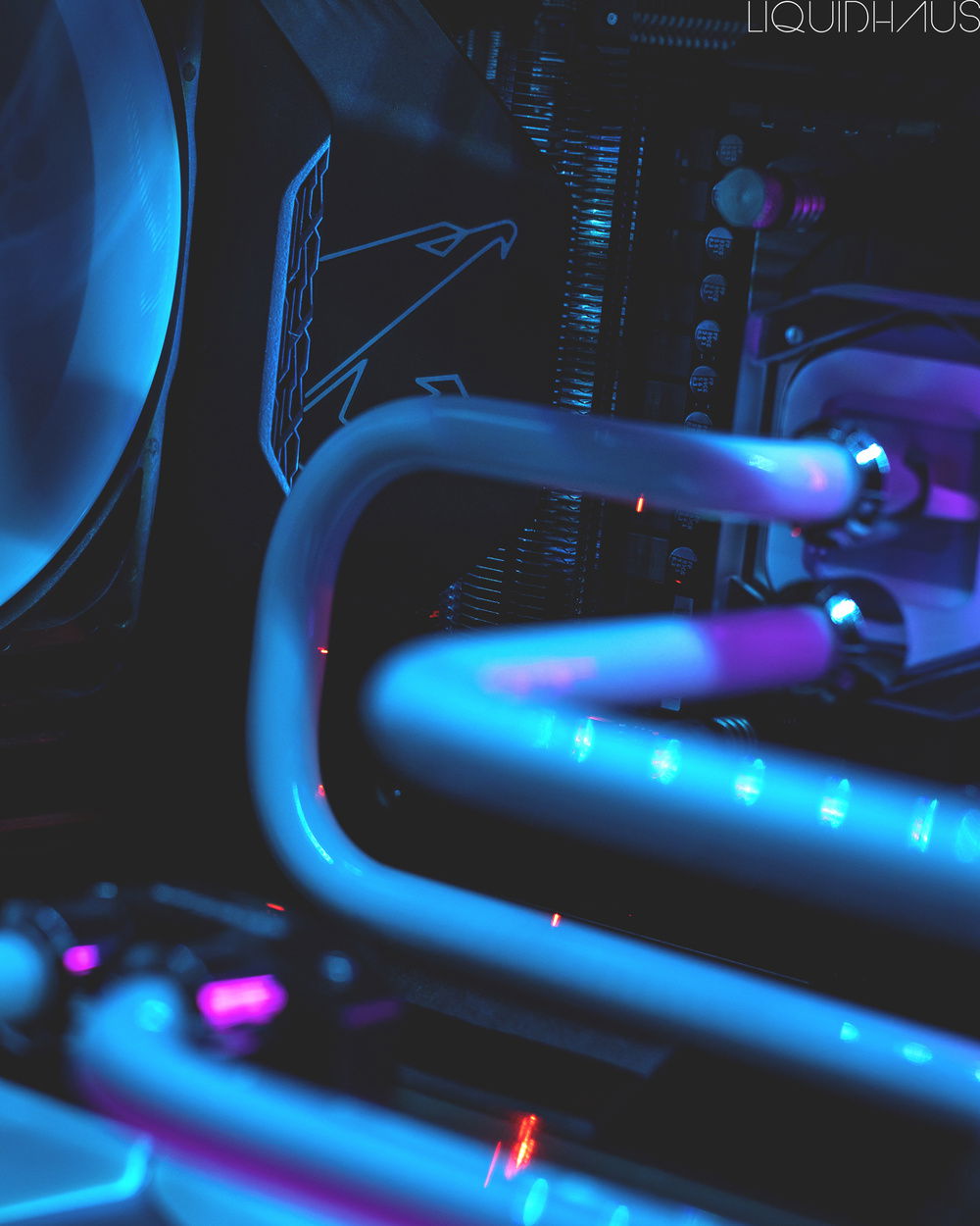 Flagship rig of LiquidHaus. This is the 10th iteration of this build, meaning the parts installed now were funded by selling the parts that had been installed prior. This build has evolved as hardware has progressed, with the initial build investment starting when Bulldozer was first launched.