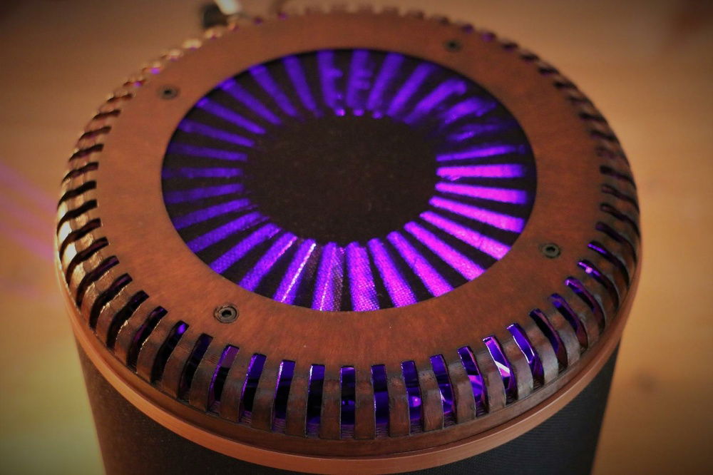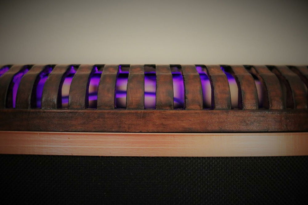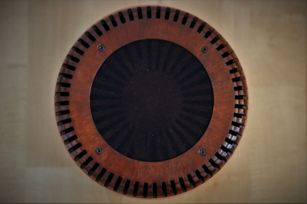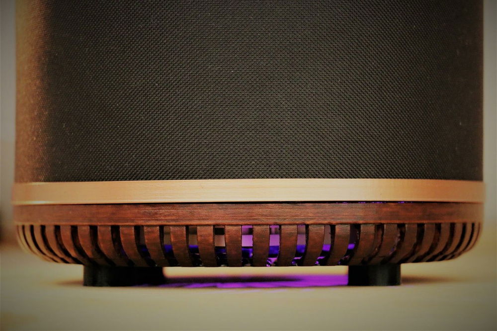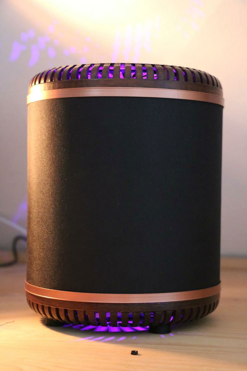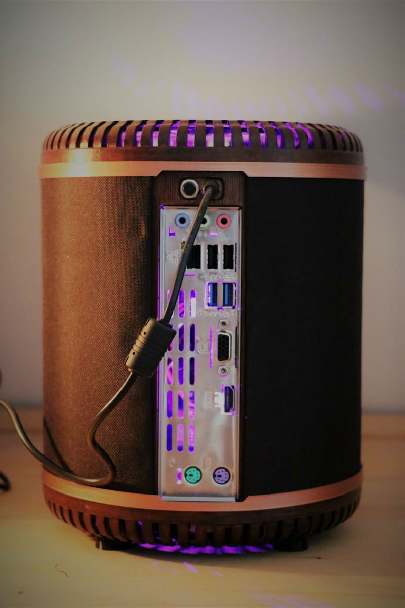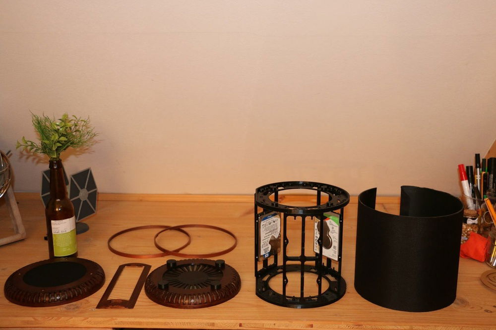 The case itself was printed with two separate filaments, Black PLA and wood PLA post processing includes sanding the wood staining, sanding rinse and repeat until you get the desired colour and tone. The body is wrapped in cloth and all seems and edges are hidden to make it as clean as possible. The two rings up top and the bottom where sprayed with copper paint.