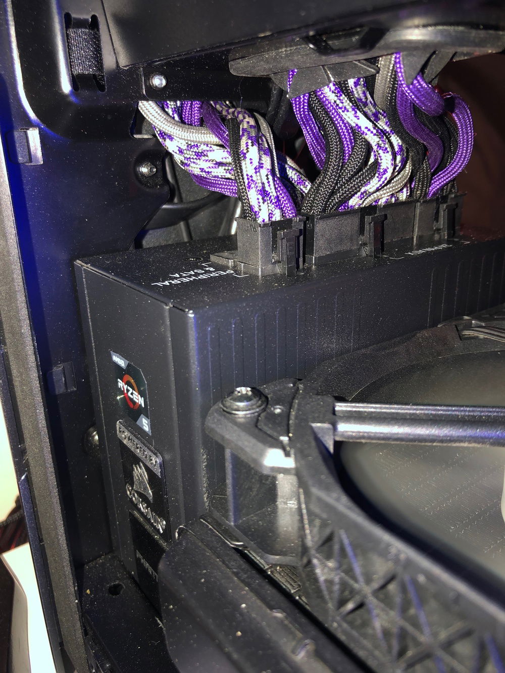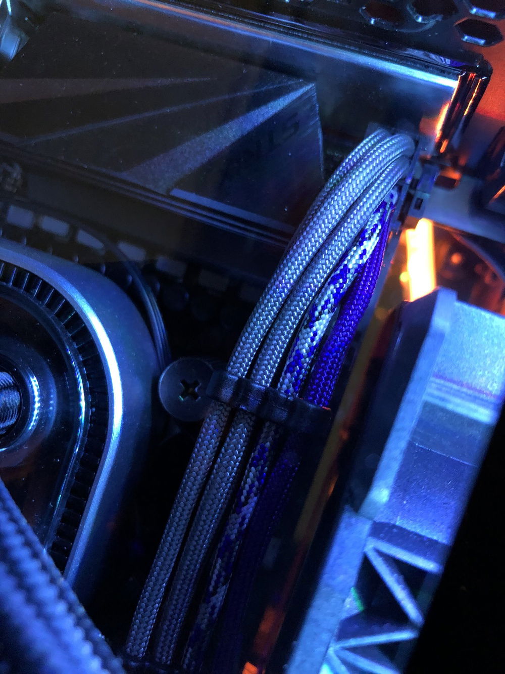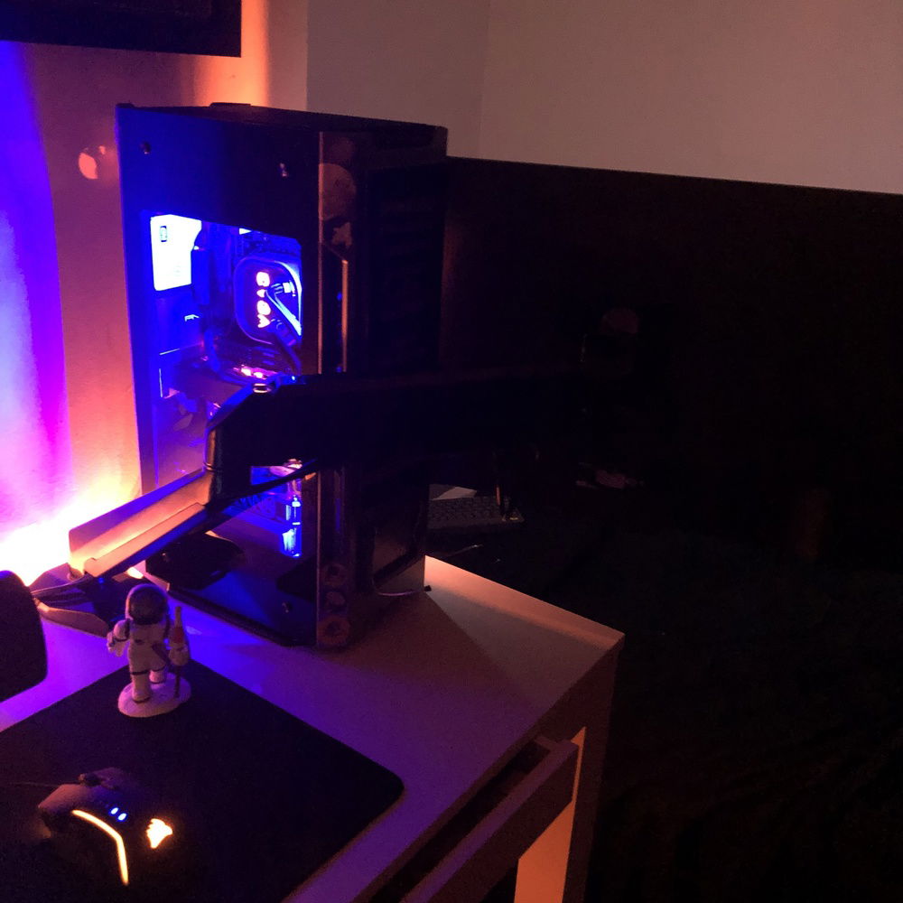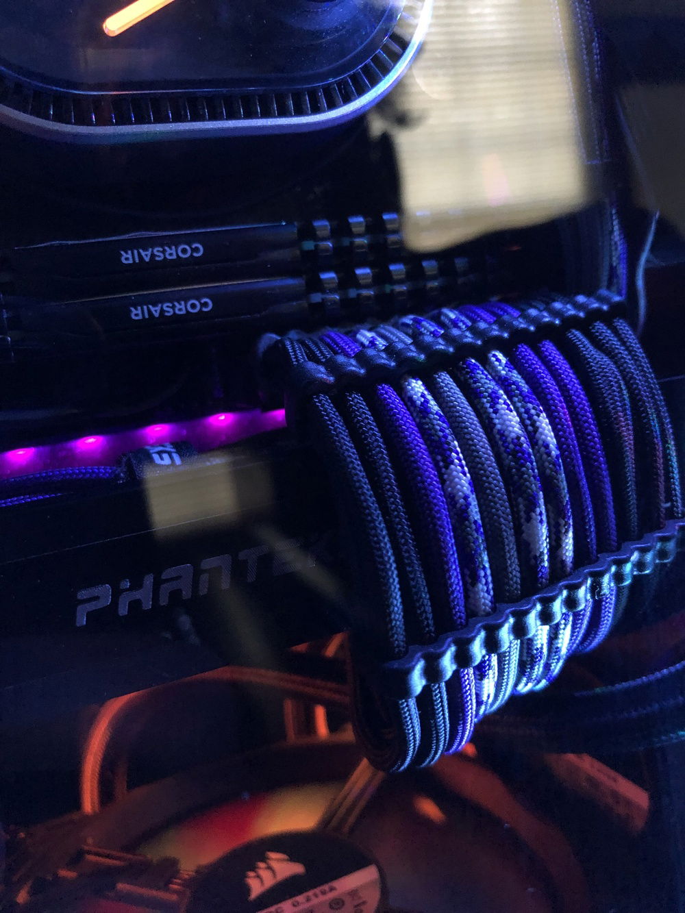 This is the third revision of my second pc build, Nebula. It's used for graphic design, digital art, and gaming. The front panel mod is just two layers of laser-cut acrylic. I sleeved the cables myself, it took me two days and my hands were killing me but that's probably the component I'm most proud of because I put so much work into them. The case also has a very subtle silver sparkle paint + splatter that's hard to photograph. That being said even in person it almost looks like the stock anodizing color until you get close. The biggest difference it makes is that the side vents are now sparkle silver and match the panel instead of the black plastic finish that's stock. The Dualshock 4 controller sits in a controller hangar I made myself mounted to the front panel of the case. The secondary keyboard (Logitech k400) is used from my bed, the way my room is set up I can swing my monitor (which is mounted on an arm) around and browse/ play games from my bed. (See pictures). (My mouse is set to fade between orange and purple which is why it's different in different pictures).