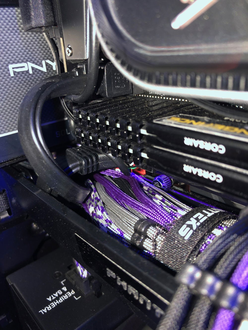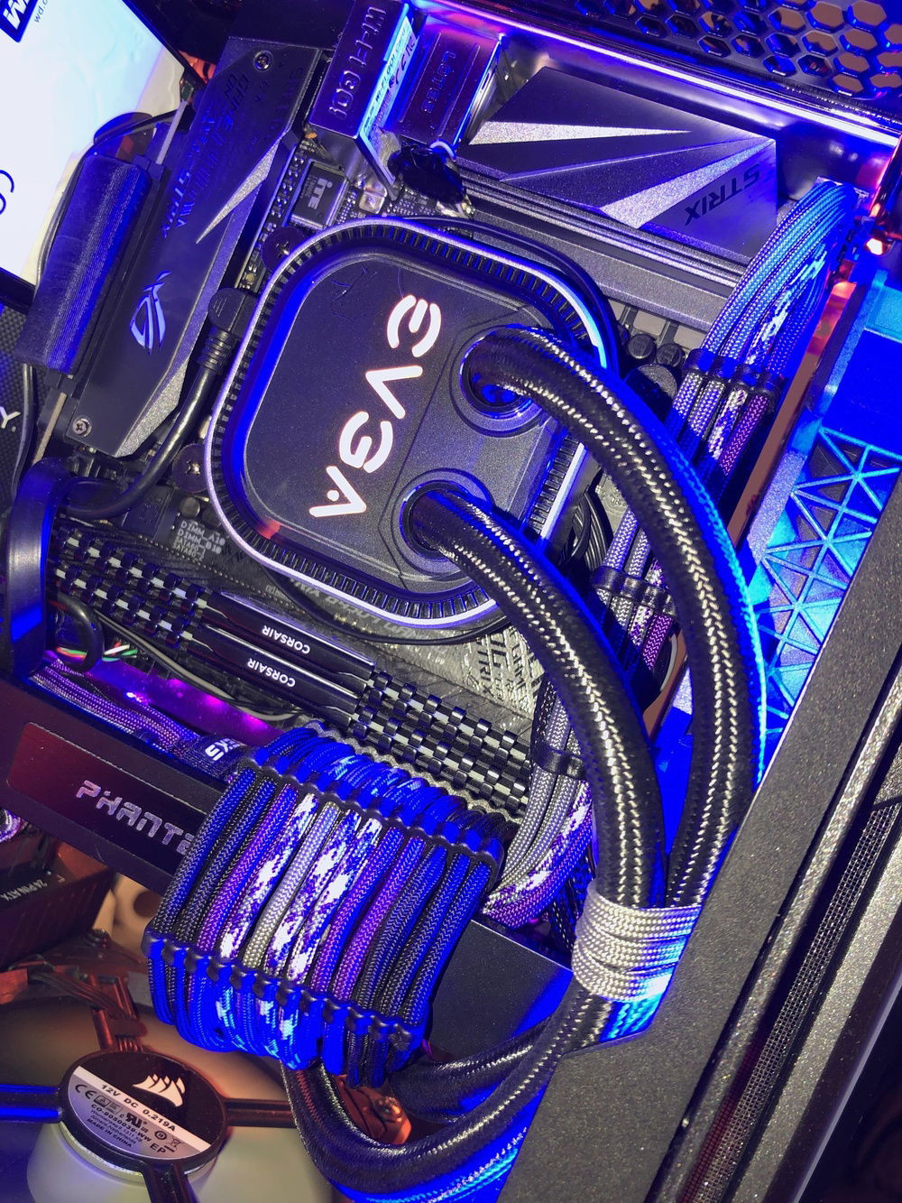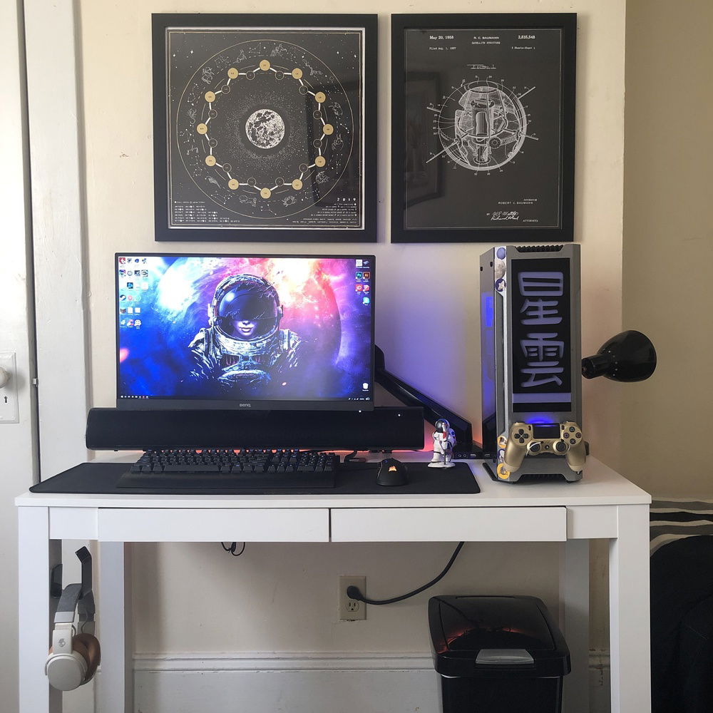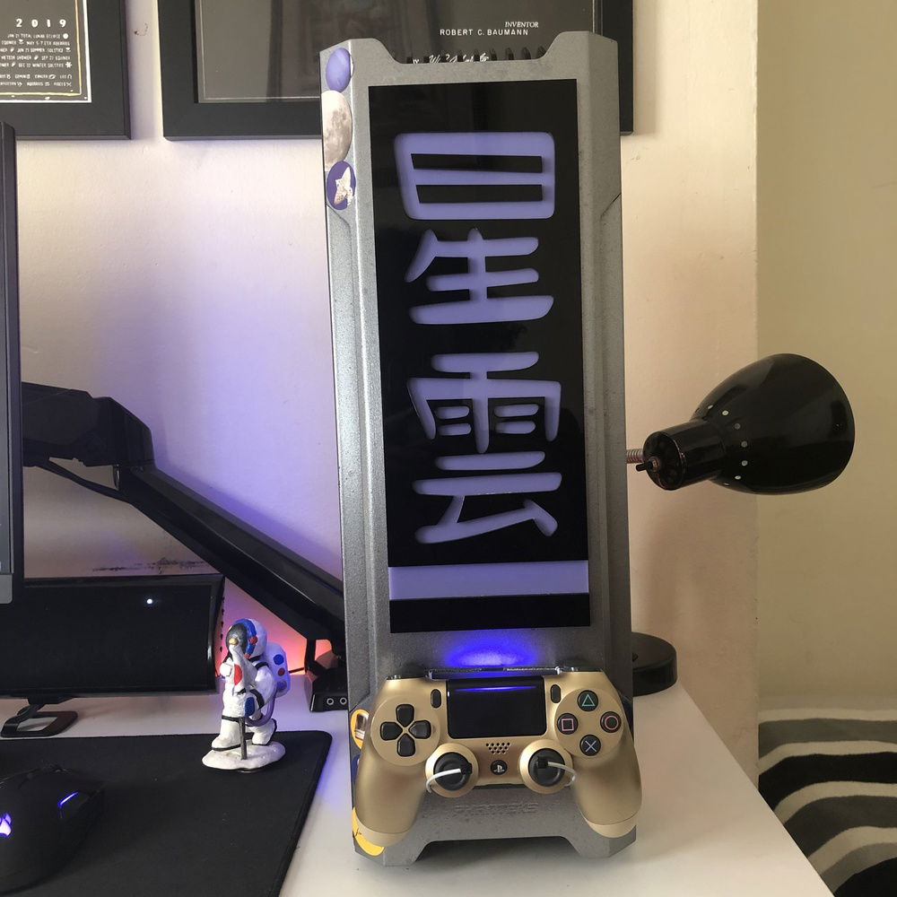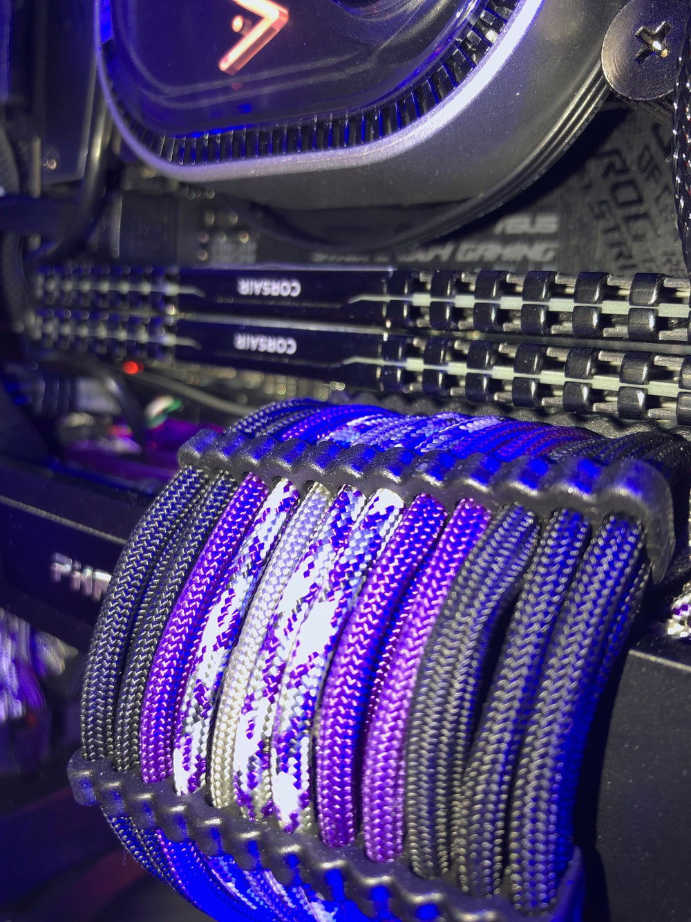 This is the third revision of my second pc build, Nebula. It's used for graphic design, digital art, and gaming. The front panel mod is just two layers of laser-cut acrylic. I sleeved the cables myself, it took me two days and my hands were killing me but that's probably the component I'm most proud of because I put so much work into them. The case also has a very subtle silver sparkle paint + splatter that's hard to photograph. That being said even in person it almost looks like the stock anodizing color until you get close. The biggest difference it makes is that the side vents are now sparkle silver and match the panel instead of the black plastic finish that's stock. The Dualshock 4 controller sits in a controller hangar I made myself mounted to the front panel of the case. The secondary keyboard (Logitech k400) is used from my bed, the way my room is set up I can swing my monitor (which is mounted on an arm) around and browse/ play games from my bed. (See pictures). (My mouse is set to fade between orange and purple which is why it's different in different pictures).
