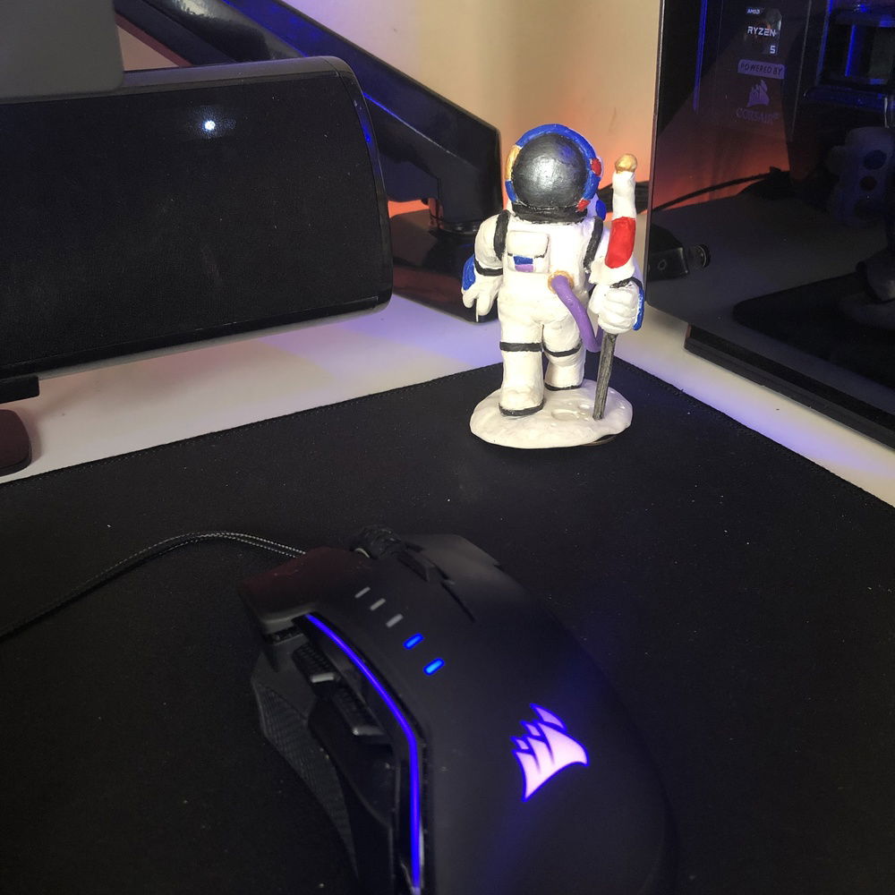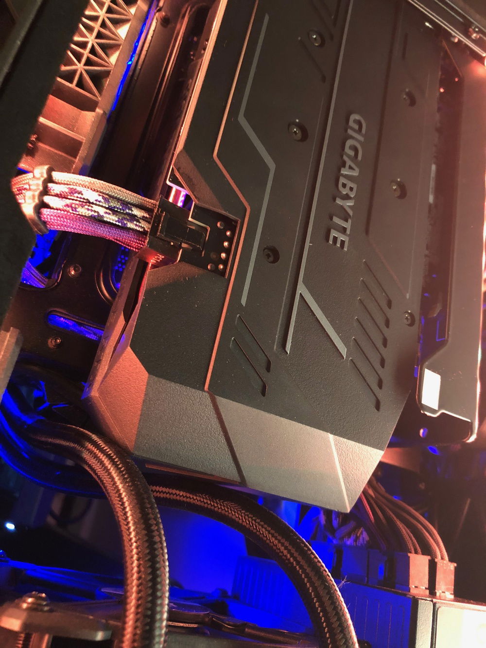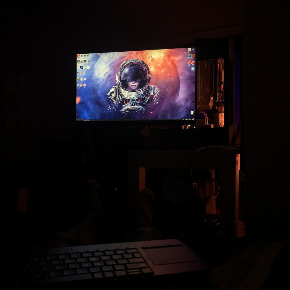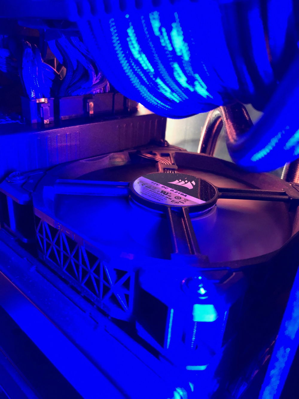 This is the third revision of my second pc build, Nebula. It's used for graphic design, digital art, and gaming. The front panel mod is just two layers of laser-cut acrylic. I sleeved the cables myself, it took me two days and my hands were killing me but that's probably the component I'm most proud of because I put so much work into them. The case also has a very subtle silver sparkle paint + splatter that's hard to photograph. That being said even in person it almost looks like the stock anodizing color until you get close. The biggest difference it makes is that the side vents are now sparkle silver and match the panel instead of the black plastic finish that's stock. The Dualshock 4 controller sits in a controller hangar I made myself mounted to the front panel of the case. The secondary keyboard (Logitech k400) is used from my bed, the way my room is set up I can swing my monitor (which is mounted on an arm) around and browse/ play games from my bed. (See pictures). (My mouse is set to fade between orange and purple which is why it's different in different pictures).