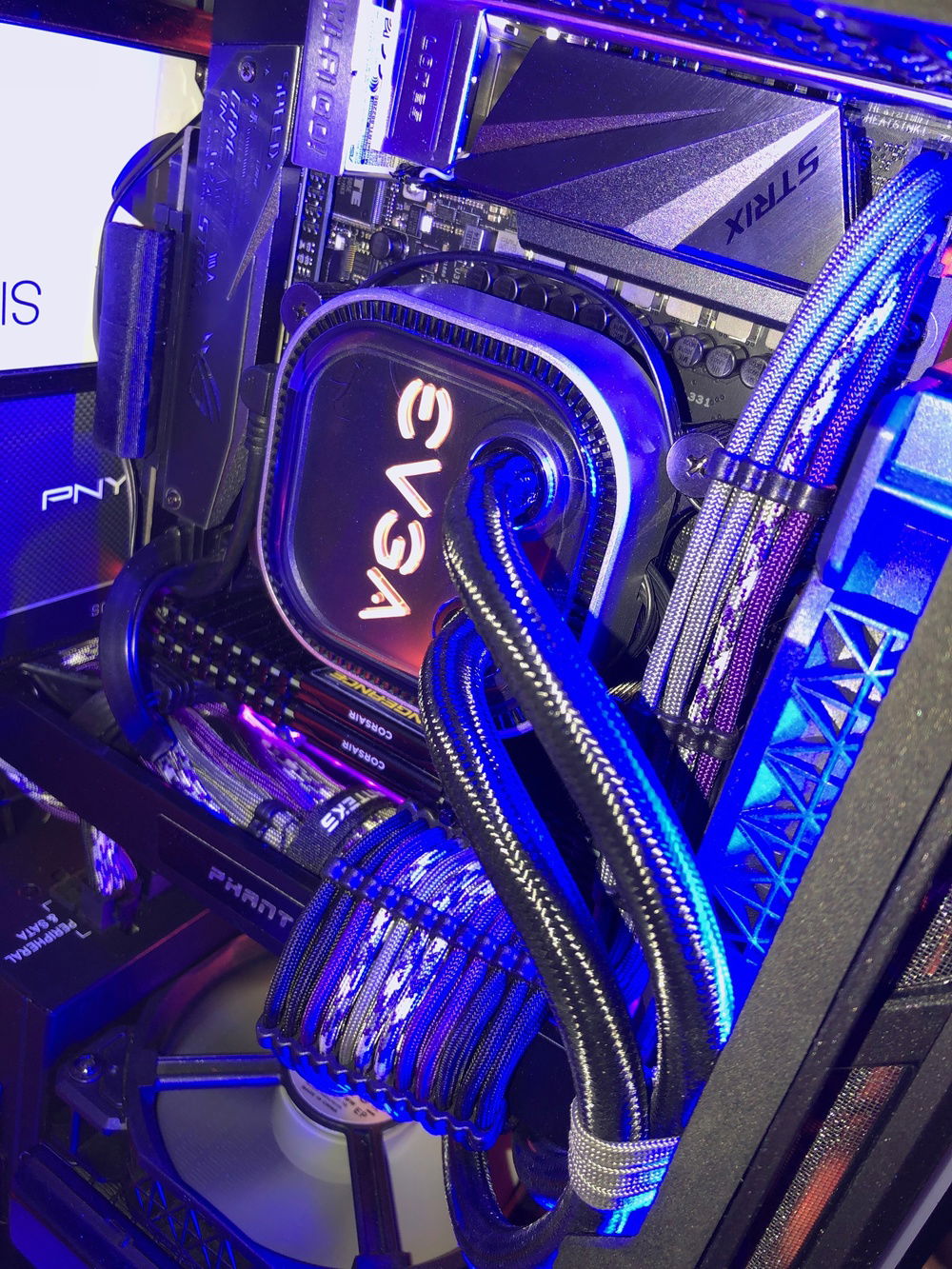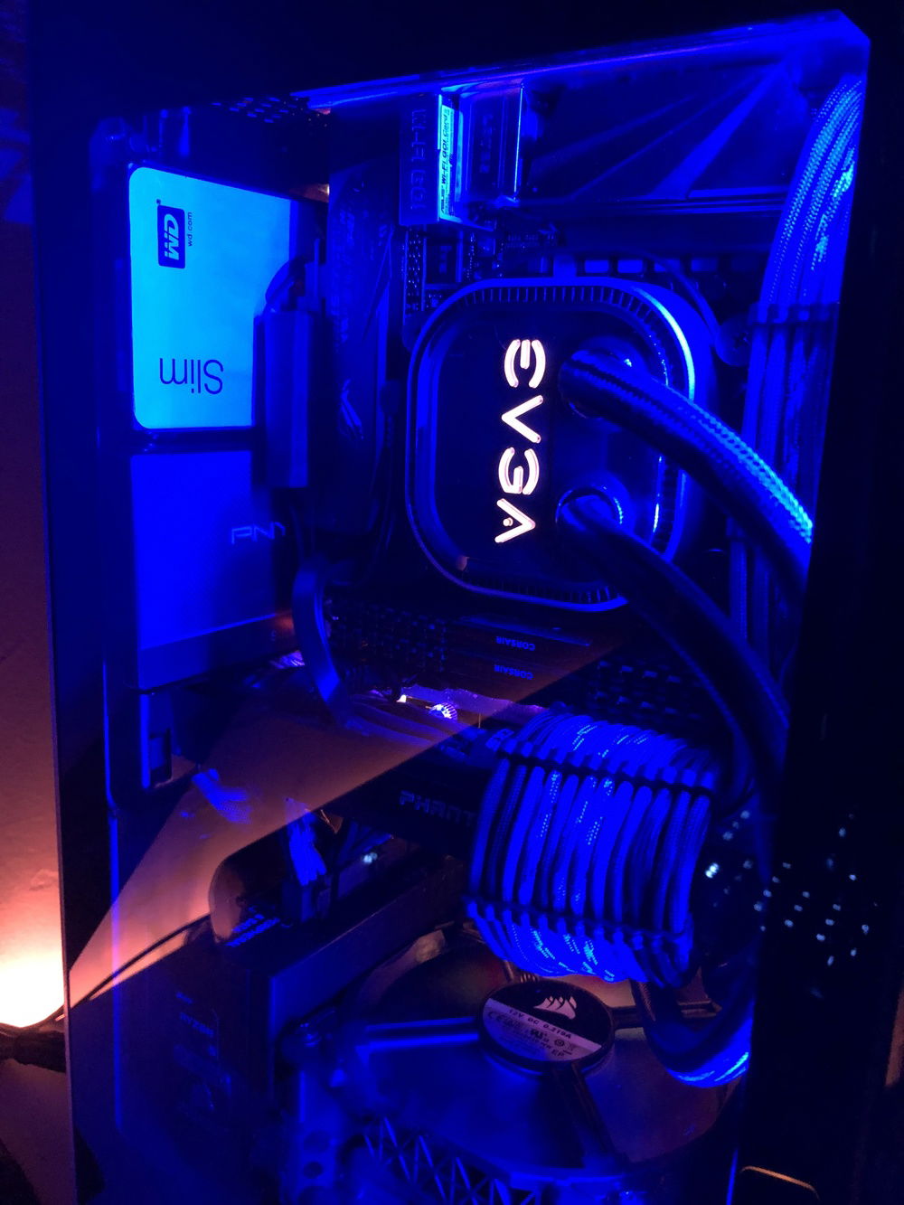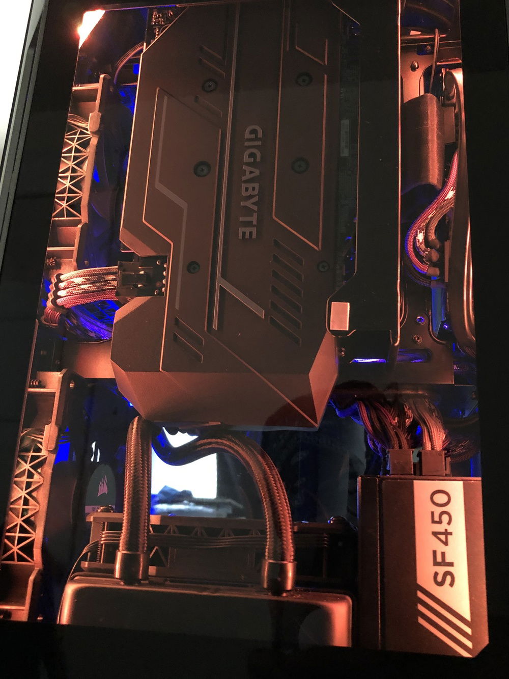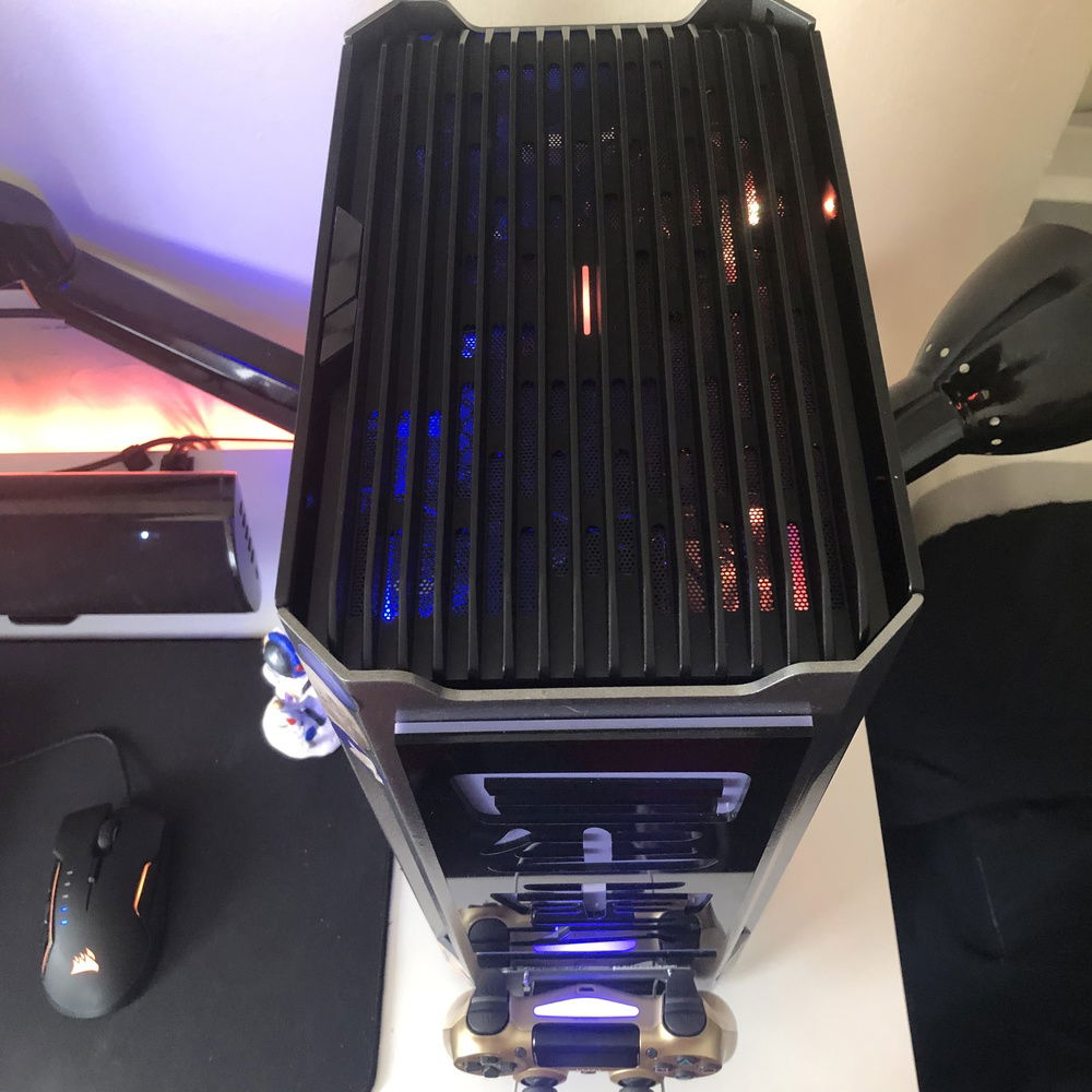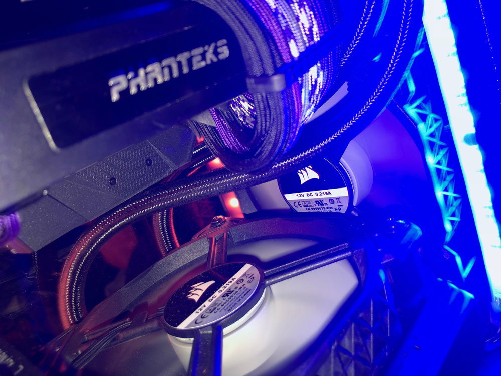 Planning to cram a full custom loop in here in the future, if anyone has any parts suggestions or other helpful info I'd love to hear your ideas! Clearances will obviously be an issue so if you know components that fit will fit in this case let me know! More info not found in Hardware section for those that are interested in specifics: Monitor (BenQ PD2500Q) is OC'd to 85mhz, Ryzen 5 1600 @3.7ghz / 16gb Corsair Vengange LPX DDR4 @3000mhz / 4x120 Corsair MagLev Fans (2 front intake, push/pull bottom intake on AIO). 3x30cm Phanteks RGB Strips