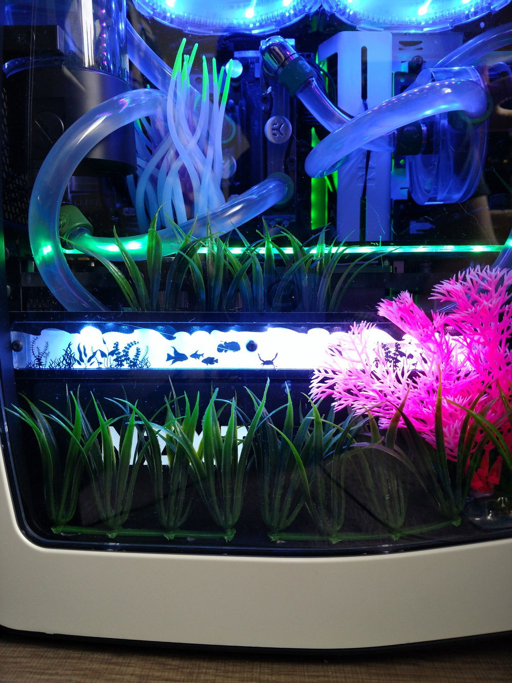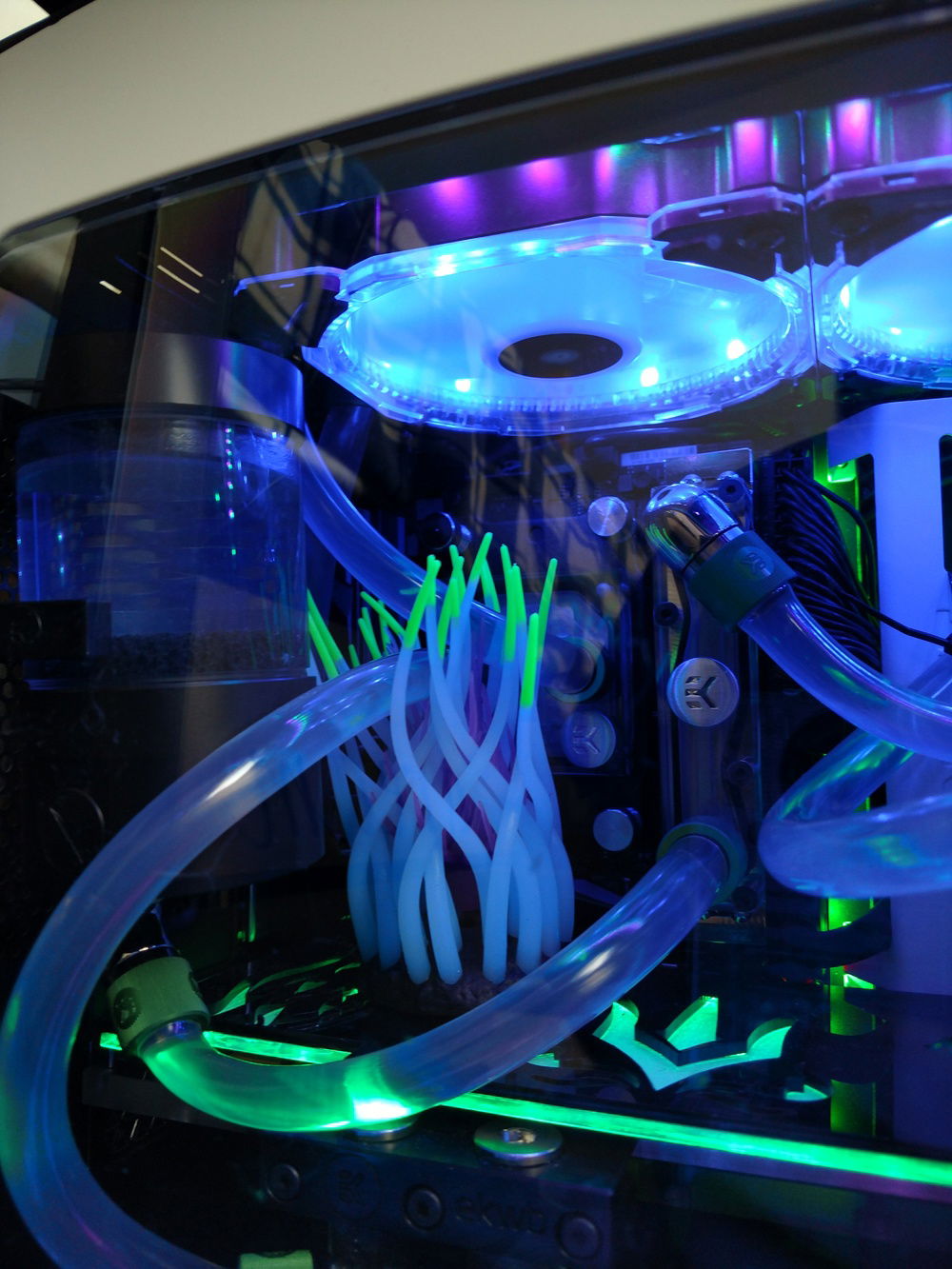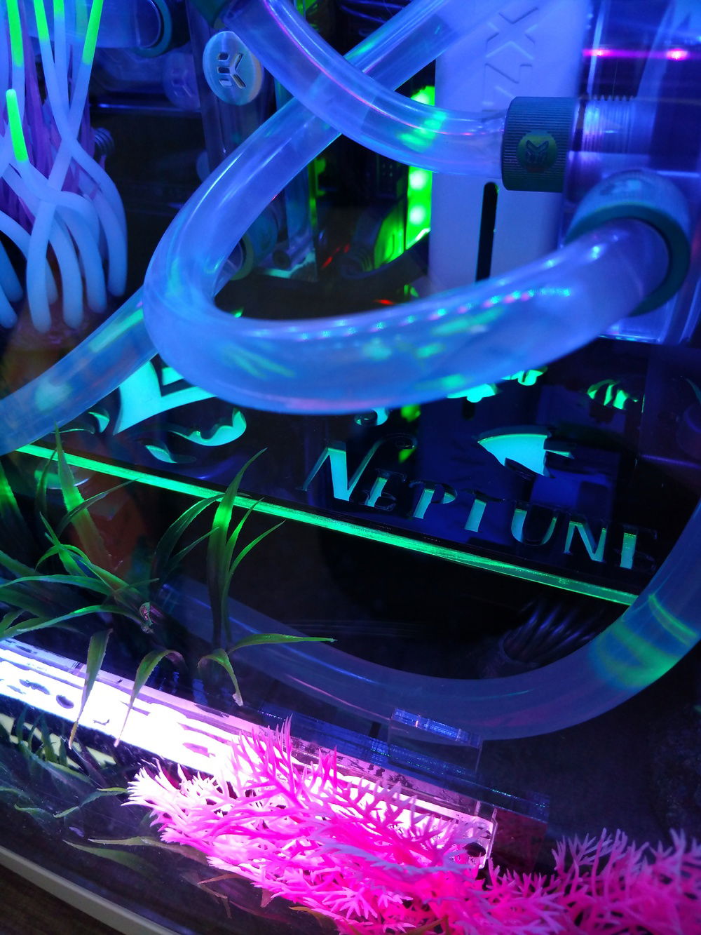 *Looking for constructive criticism.* This is a build I made for my fiance, as she's a Disney girl and loves everything about mermaid's. The goal was to make it look like a reef. I may paint the front intake panel later but I'm not sure because I also like how the clean white contrasts with the color splash from inside the case. I went with soft tubing because I really wanted it to feel as fluid as possible. Backplate and GPU bracket are both by JMMods, great guy all around.