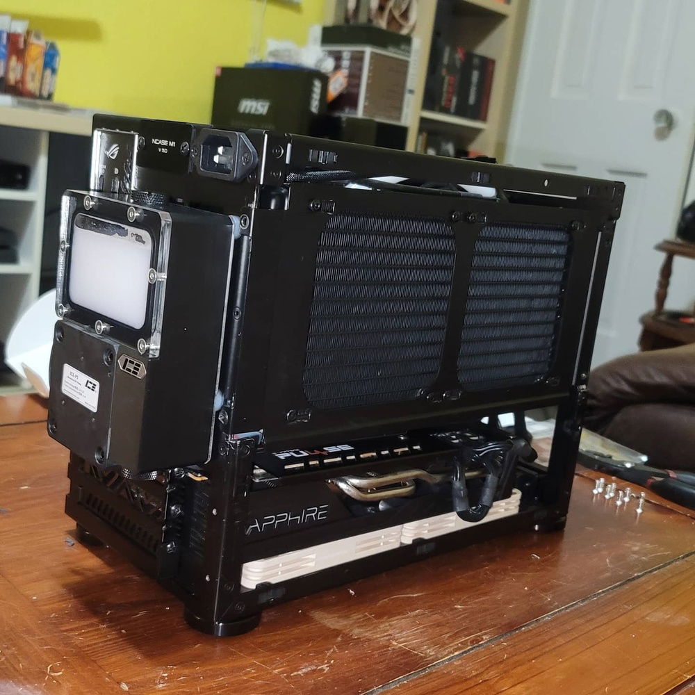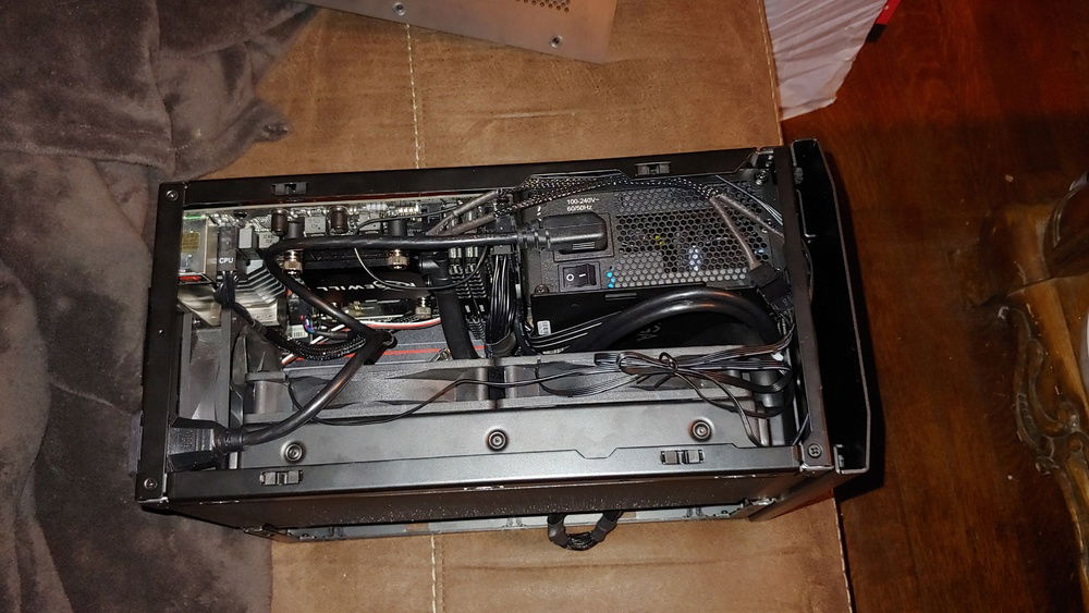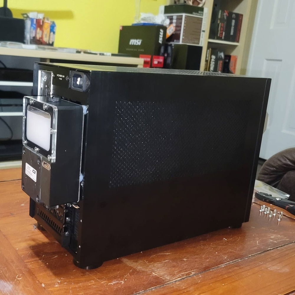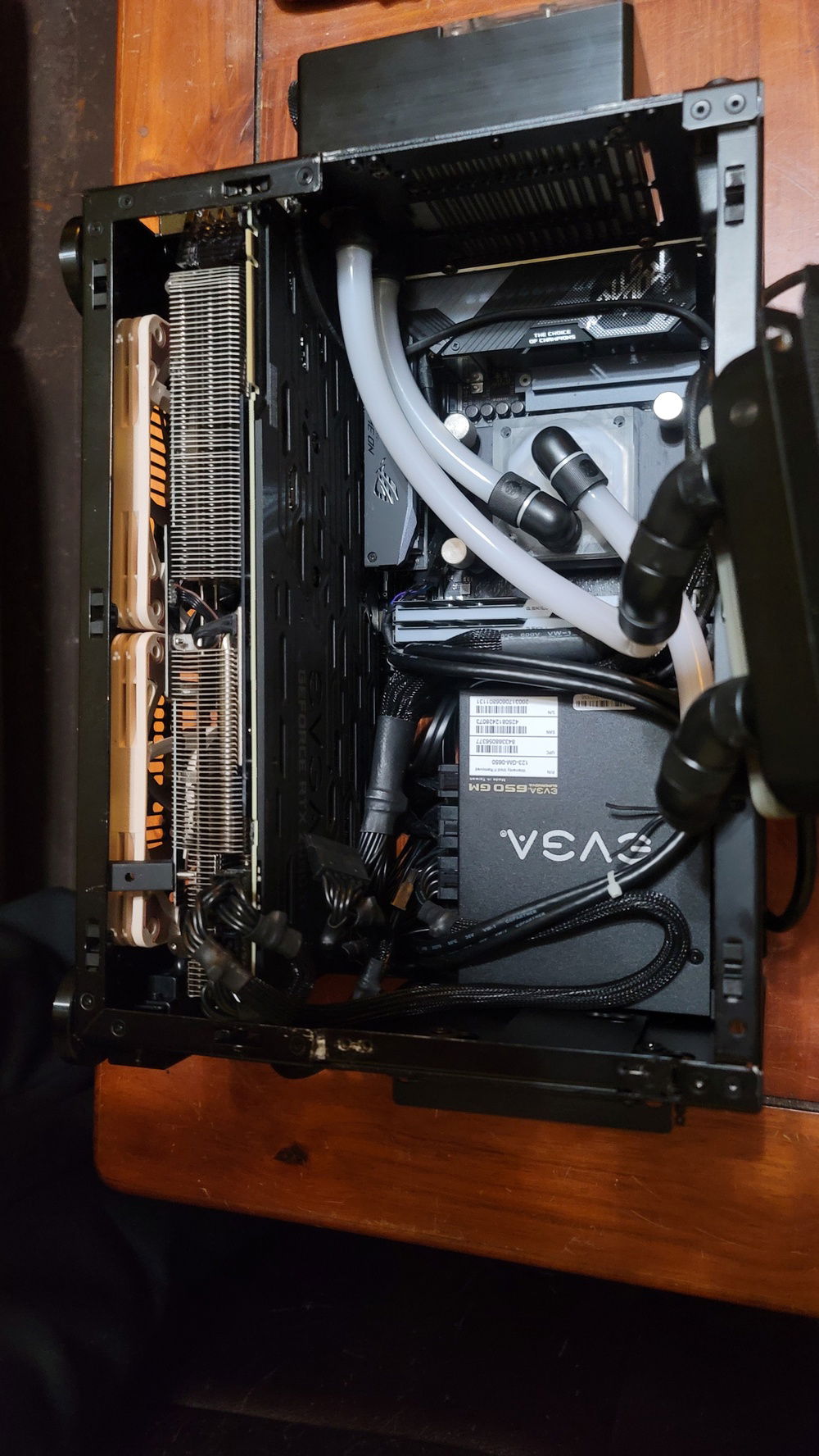 Deshrouded and came up with a clever solution to making a 2080ti ftw3 fit in this tiny ncase m1...