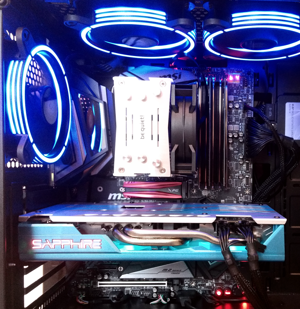 This is a little all-stock mid-range budget build, nothing too special. Still, the combination of RGB from the MEG Z390 ACE, Sapphire Nitro+ Special Edition and the Enermax RGB Fans looks pretty nice behind the tempered glass from the Kolink Stronghold and it's sufficient for FullHD Triple A Games.
