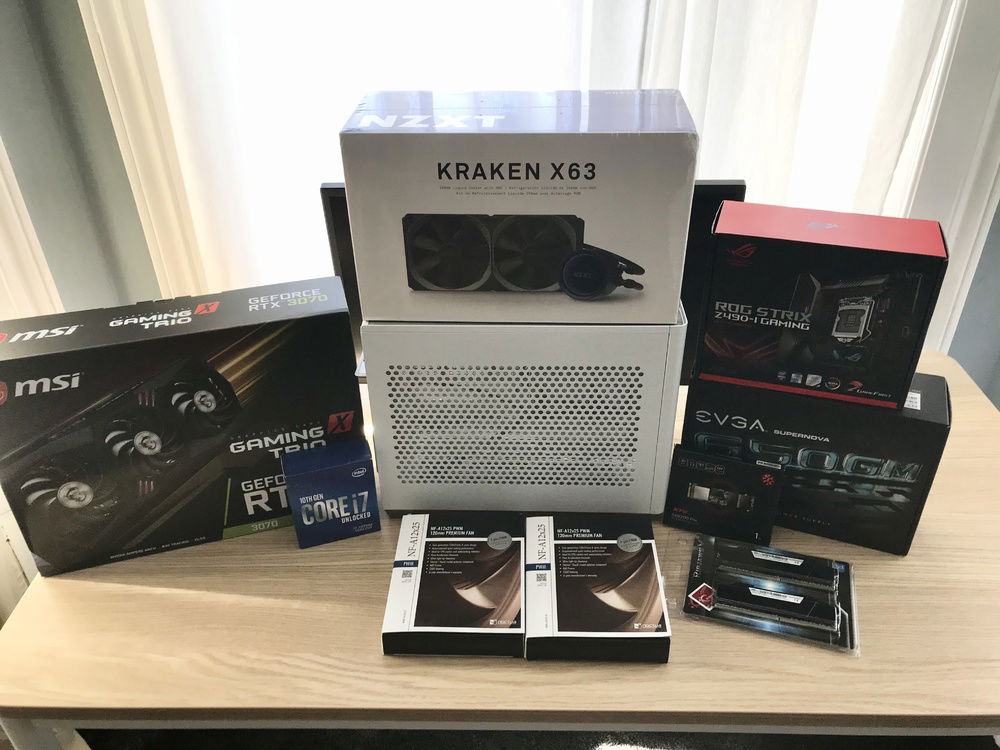 Deshrouded 3070, paired with a i7-10700k running 4x artic p-fans for the aio/top exhaust, and 2x noctua nf-12x25 under the gpu for a cool/quite high FPS gaming experience