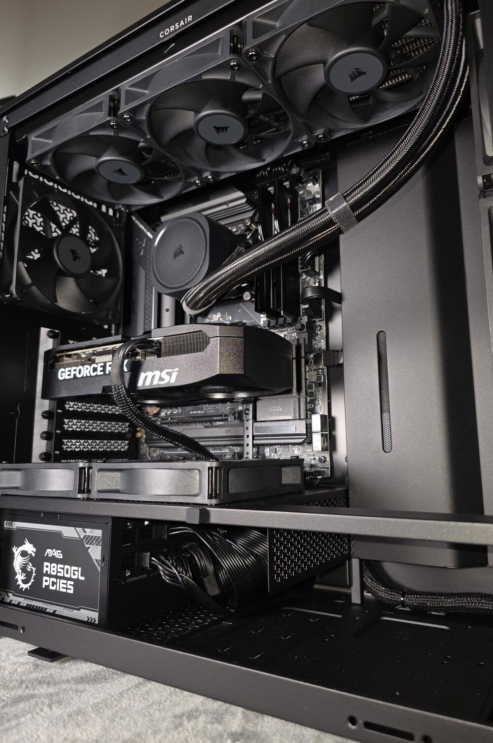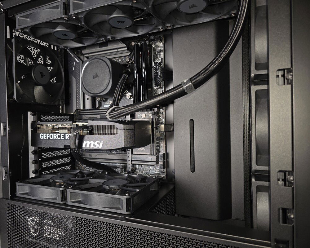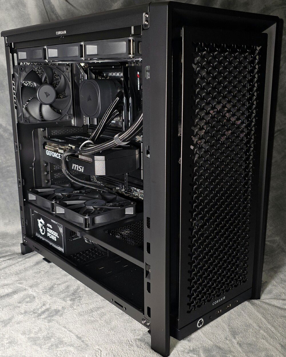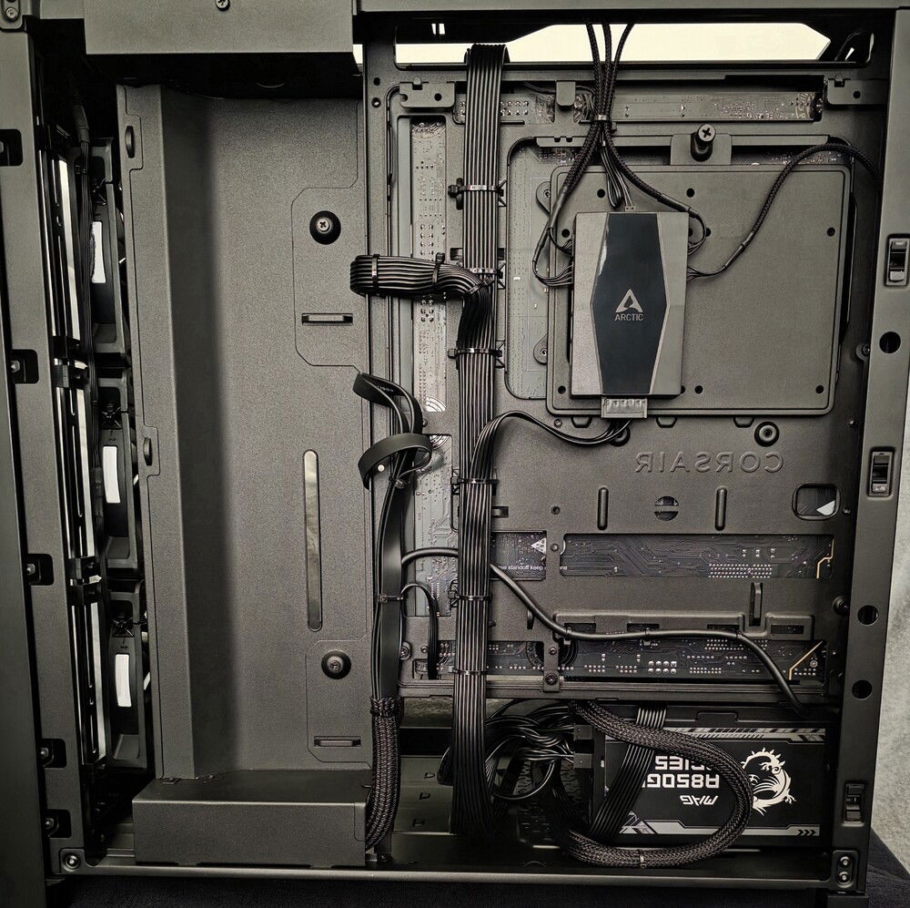 The FRAME 4000D RS chassis is relatively small (49L volume), but it's very easy to build in because it breaks down almost completely, and it accommodated all of the hardware (9 fans, 360mm AiO) with relative ease. I had to keep the cable management clean, because there isn't really anywhere to hide things...lol. Overall, I am quite pleased with this chassis from Corsair, it isn't perfect, but it does stand out as one of the better 'small'ish' mid-tower chassis available on the market atm.
