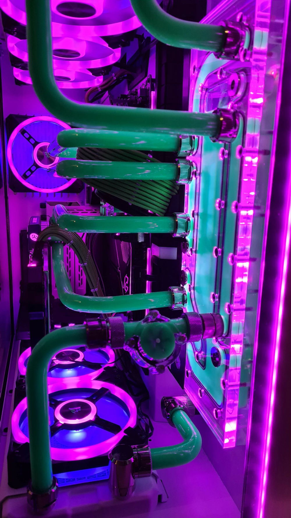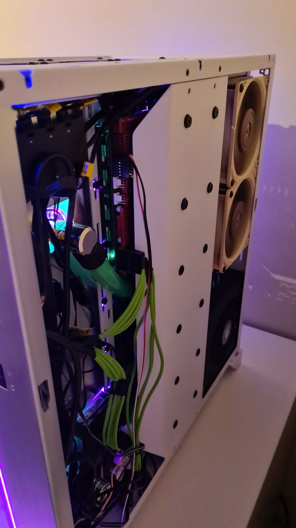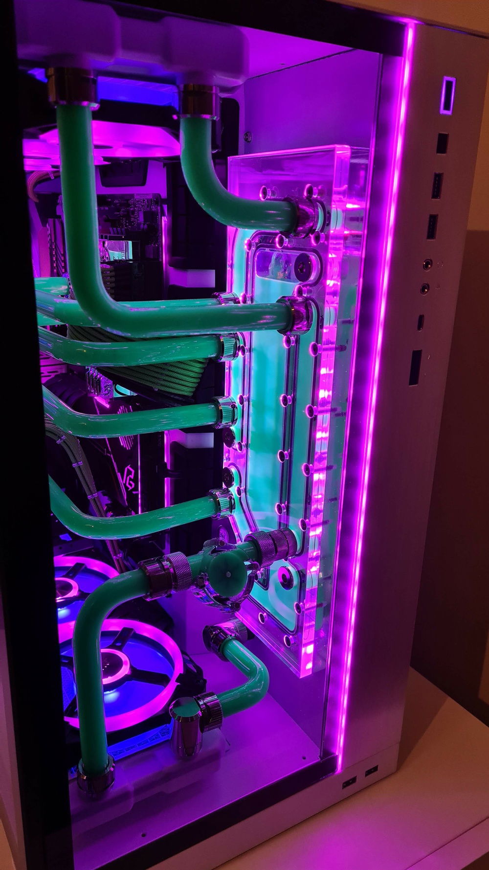 Added an aluminium plate behind the entire G1 distro plate to cover up the empty spaces above and below. The loop goes to the back where a 3rd radiator is fitted with Noctua fans to cover for the less performing Corsair QL fans.