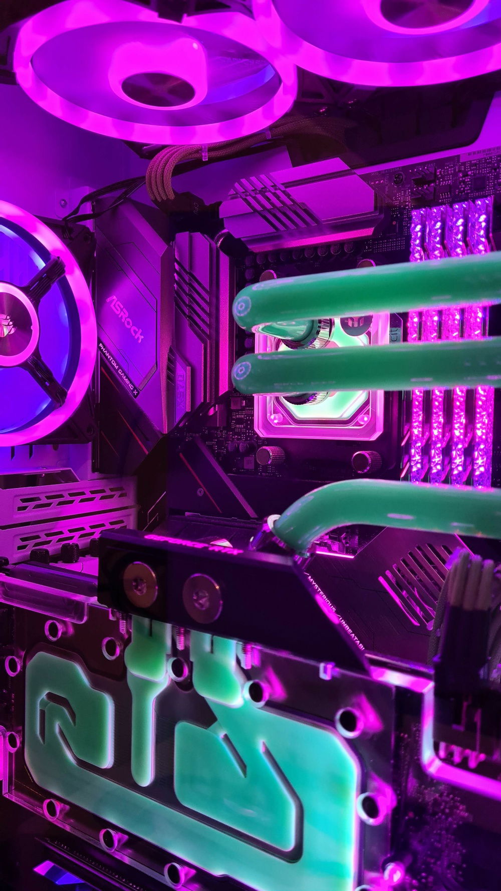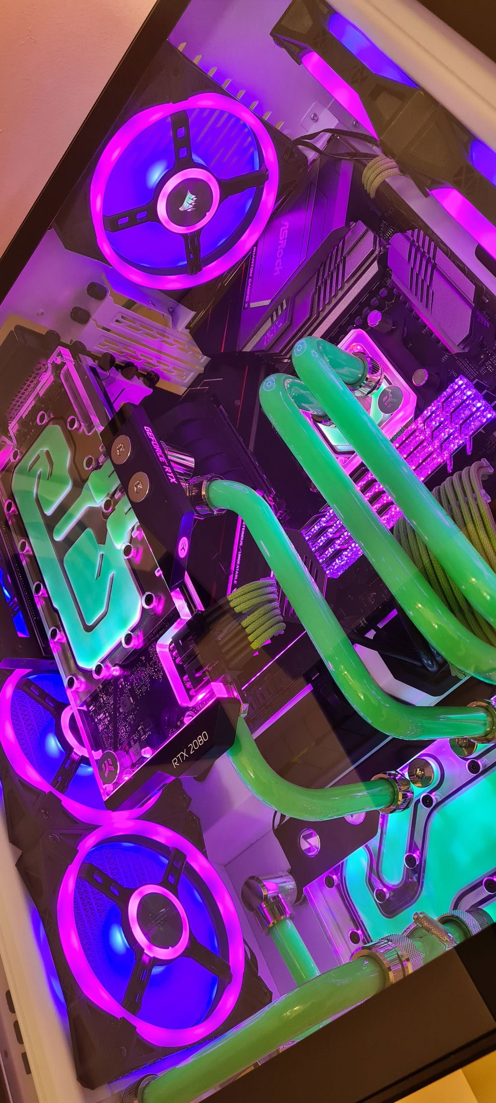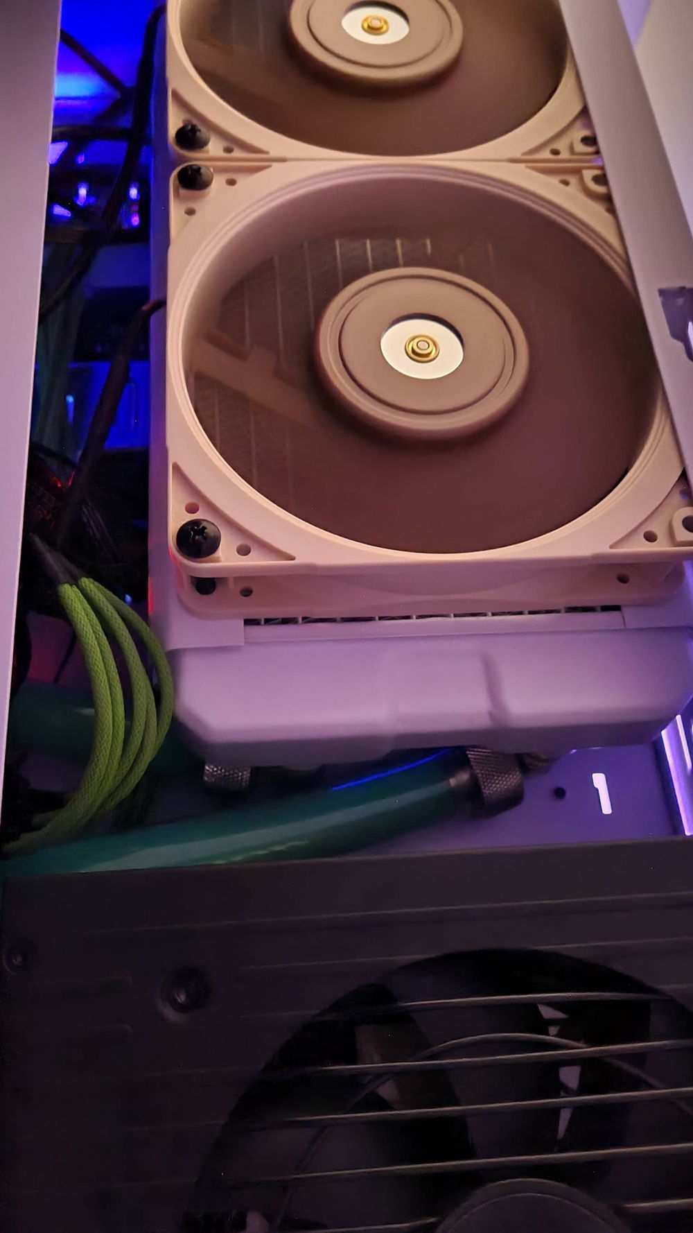 Added an aluminium plate behind the entire G1 distro plate to cover up the empty spaces above and below. The loop goes to the back where a 3rd radiator is fitted with Noctua fans to cover for the less performing Corsair QL fans.