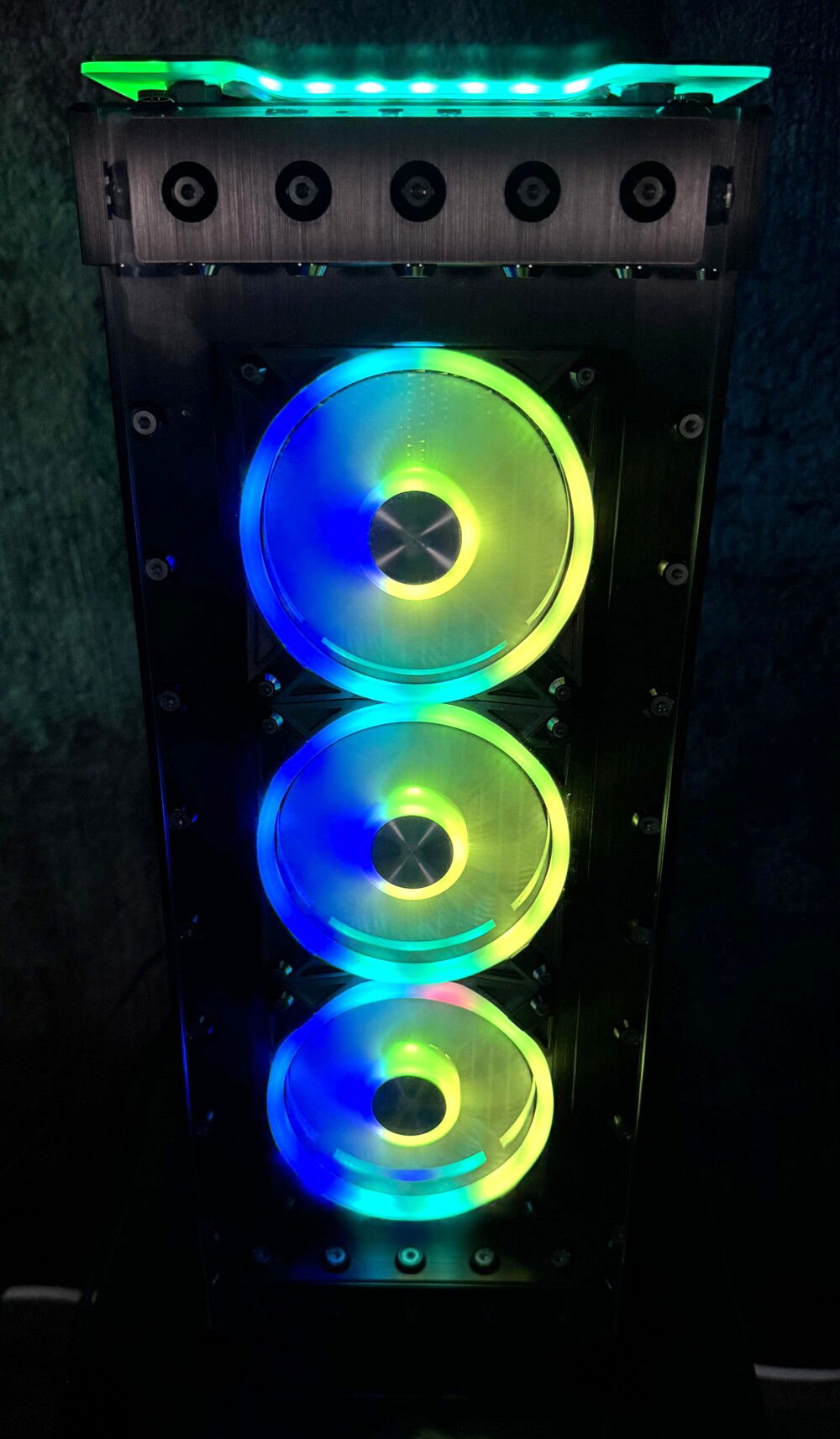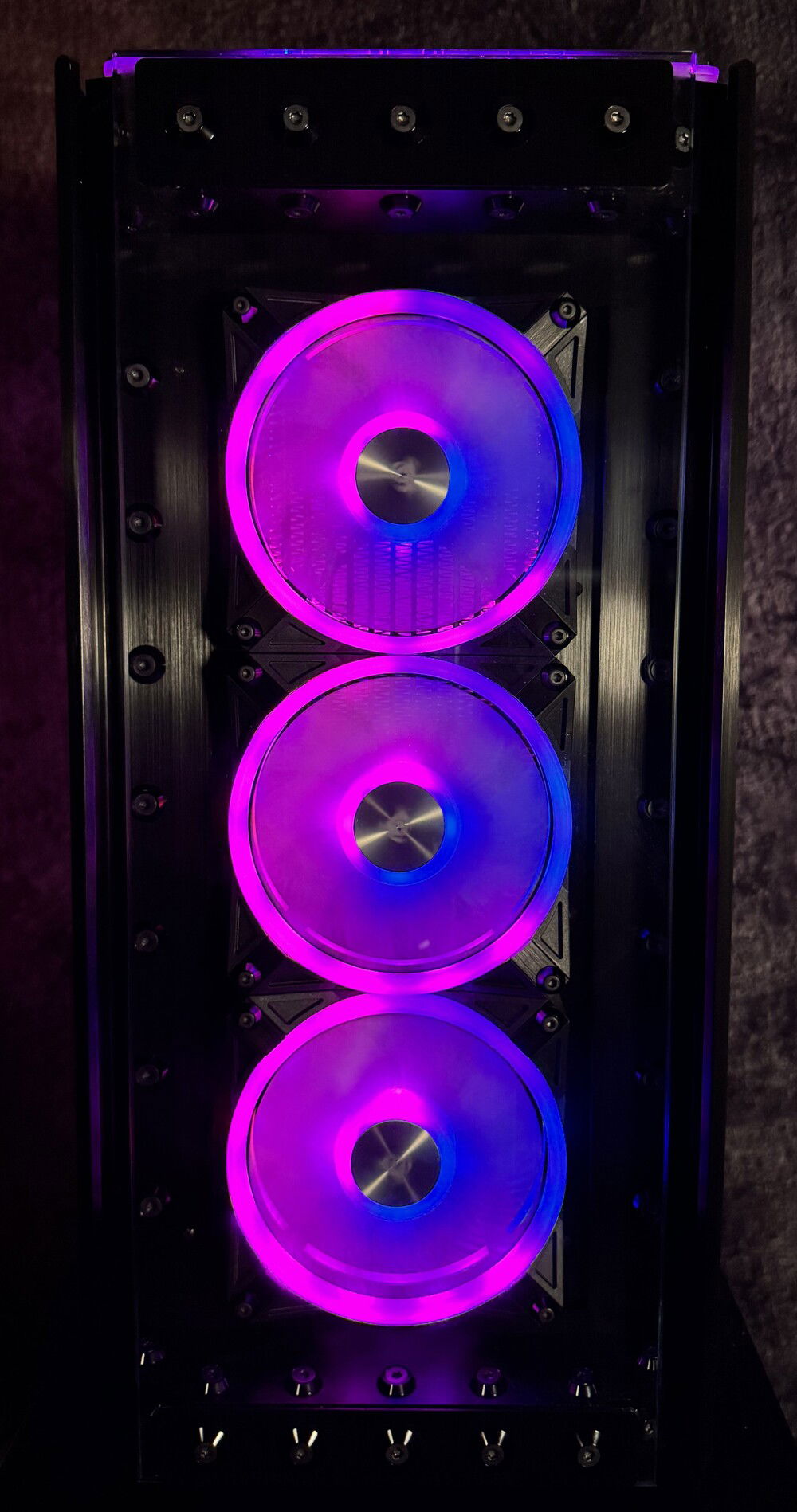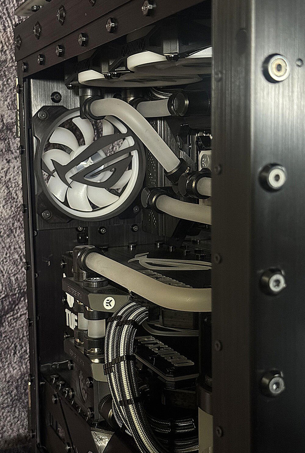 There were many problems to overcome, to make this rig a reality. First the top rad had to be relocated, to the far back of the tray, and further forward toward the opening, to allow clearance for the distro plate. A port was cut in the power supply cover, to facilitate moving the power supply to the front. This, along with some brushed anodized aluminum, give the power supply more of an integrated look. The back fan port was modified to allow the fan to be mounted from the back, and have just the RGB bezel poking through, to mate with the ASUS fan grill. These were the major issues, but there were many.