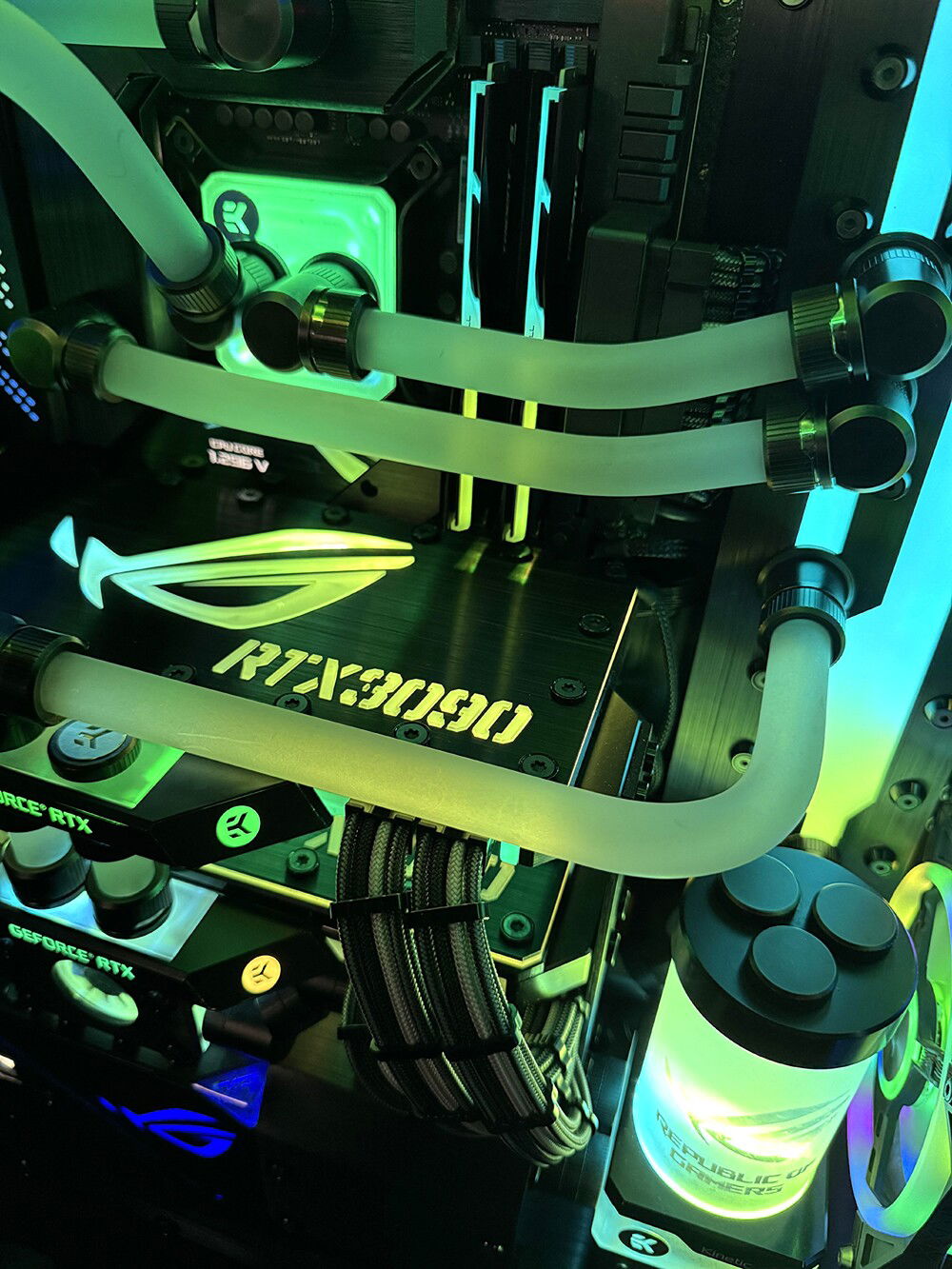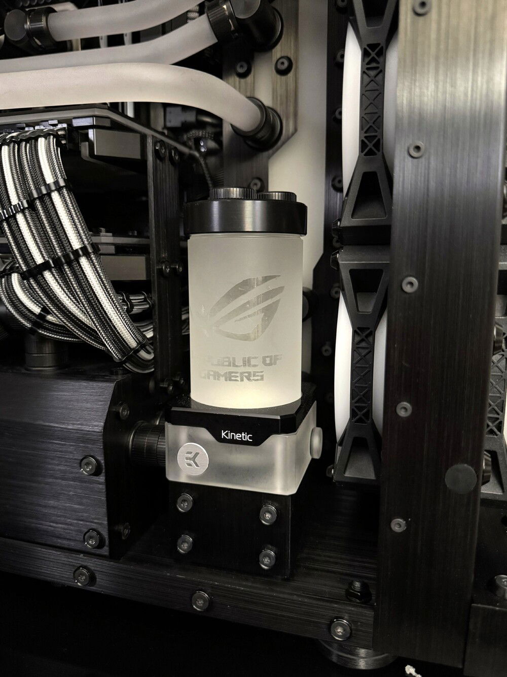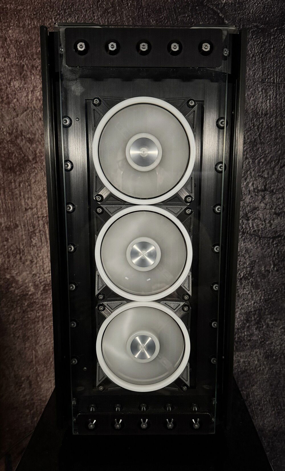 There were many problems to overcome, to make this rig a reality. First the top rad had to be relocated, to the far back of the tray, and further forward toward the opening, to allow clearance for the distro plate. A port was cut in the power supply cover, to facilitate moving the power supply to the front. This, along with some brushed anodized aluminum, give the power supply more of an integrated look. The back fan port was modified to allow the fan to be mounted from the back, and have just the RGB bezel poking through, to mate with the ASUS fan grill. These were the major issues, but there were many.