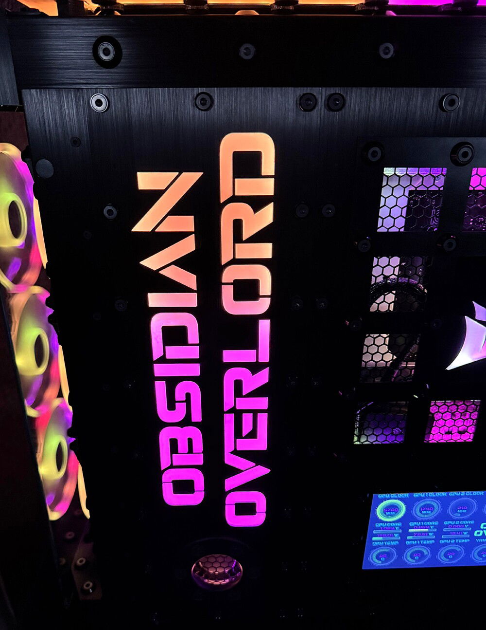 Then there is the LED lighting, which I believe I have taken to a whole new level. There are hundred of LED's in this rig, and they are all being run by Corsair controllers. I have illuminated this rig, through the implementation of illuminated panels. This is much different than the traditional RGB lighting most are use to seeing. Most RGB lighting is already incorporated into the component, or you may have a few LED strips. These are custom made illumination panels, that are set in the brushed anodized aluminum.