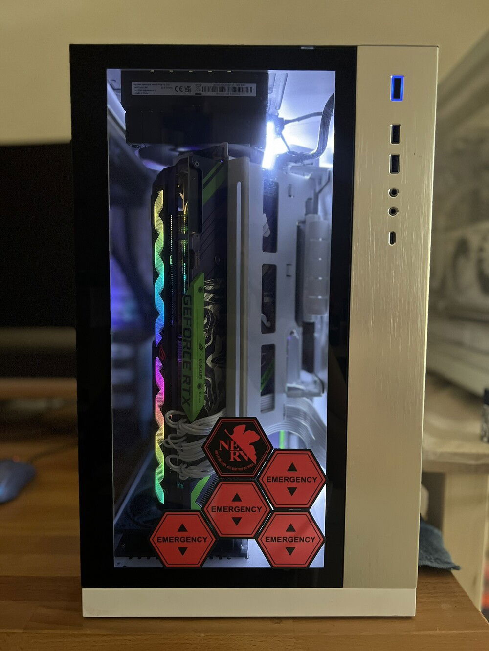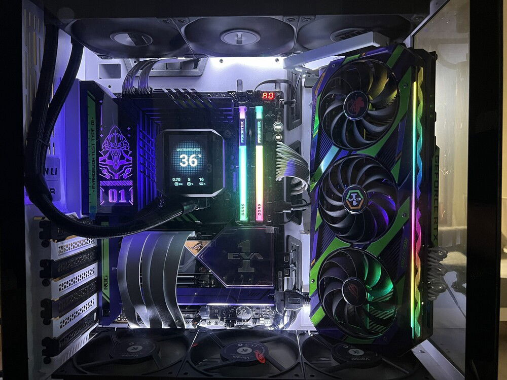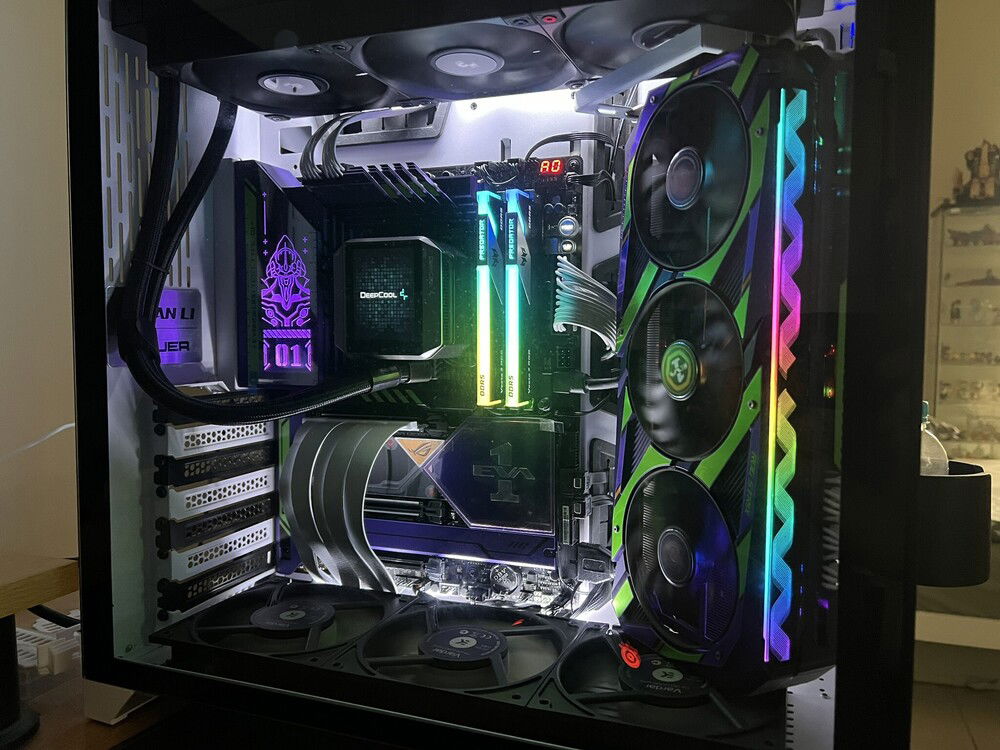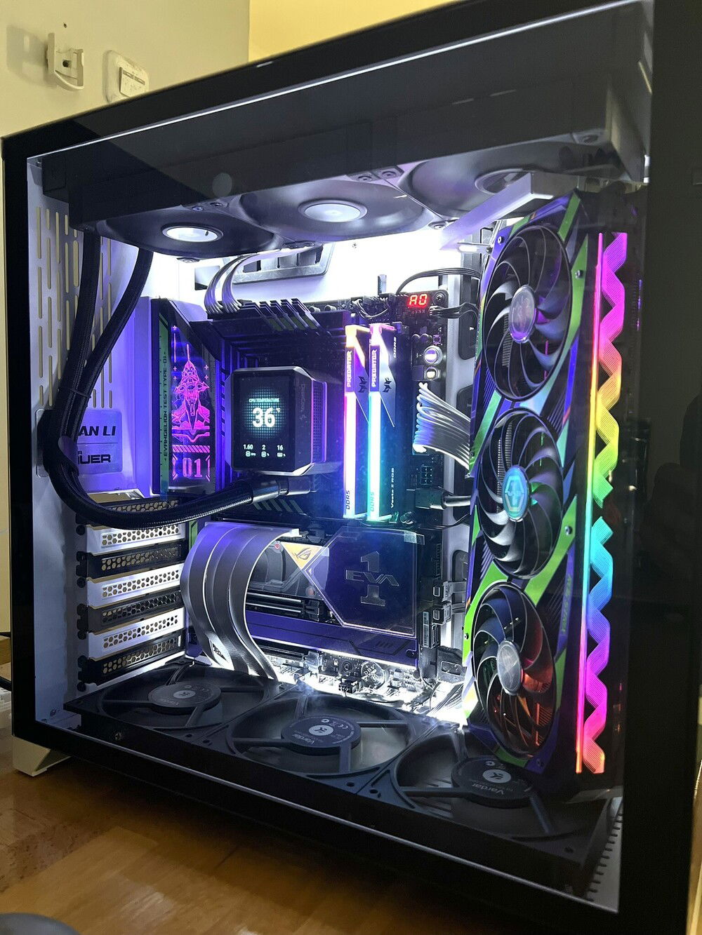 Not my daily driver, but since I love anime, decided to build this with the motherboard and gpu that I have. I wanted to showcase both parts, but installing the gpu in the normal or vertical position will block half of the motherboard. I was interested in the O11 EVO with its stand-up gpu position but I don't want to buy another case. I was a bit worried about the gpu fitment in the case, and I was right. But luckily I saw the EZDIY multi angled gpu bracket, so I thought it might be worth a shot. Surprisingly, it fits quite well, I can even slide the bottom fan underneath the gpu and have it act as something for the gpu to 'sit' and prevent it from wobbling.