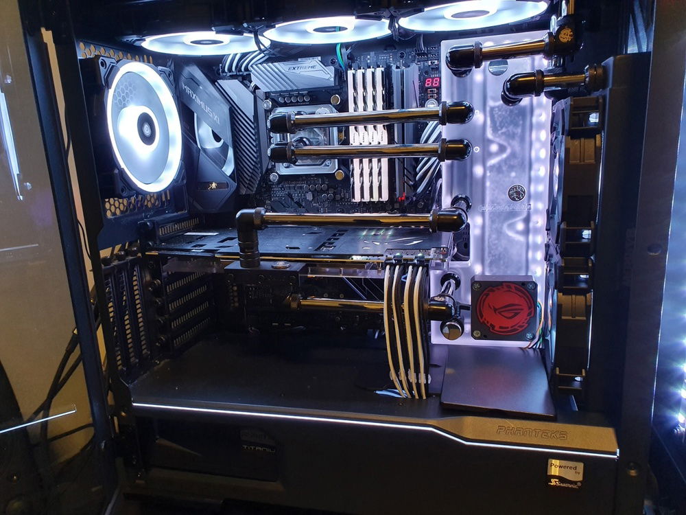 few things of note, this reservoir from byksi isnt actually supported for E-ATX motherboards so what i had to do was get m3 screws and then put some bolts on the inside of the mounting to give the reservoir a slight lift from the wall so it doesnt come in conflict with the sata cables etc. The radiators didnt align perfectly either so i was really considering my options on how to mount em but i figured out a way to do it that was slightly janky but it sits tight so idc you cant really see it lol. im a little annoyed that the spacing on the res is slightly wider than on the cpu block so im hunting for a weird fitting that would fix this but im not sure how good that would look but im considering it. oh yeah and im gonna spin those 2 ll120 fans 90 degrees so the cables get hidden better.