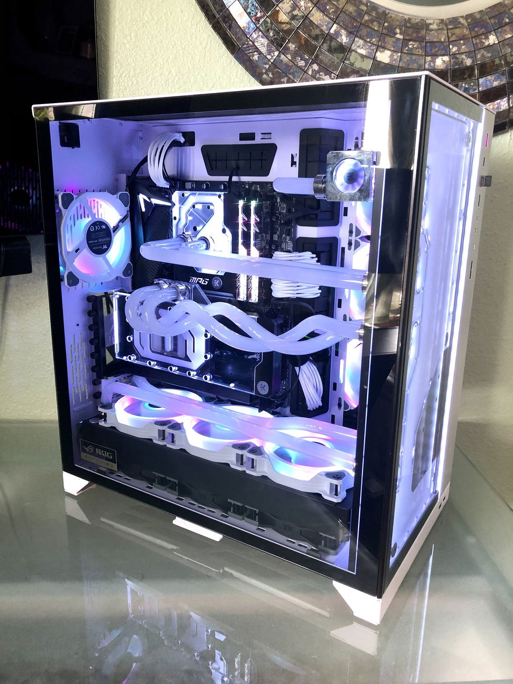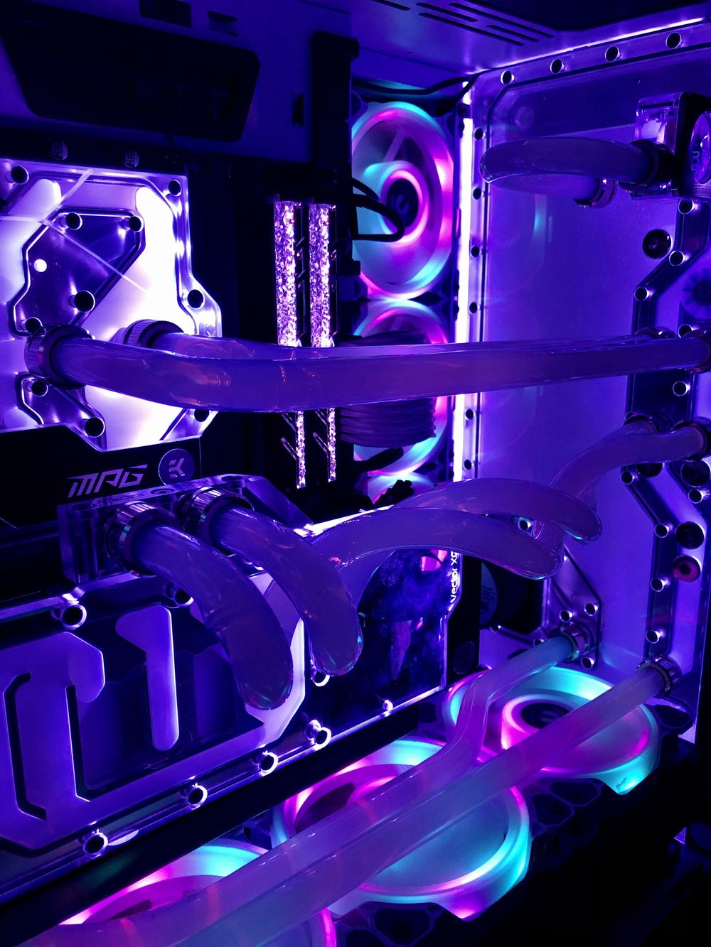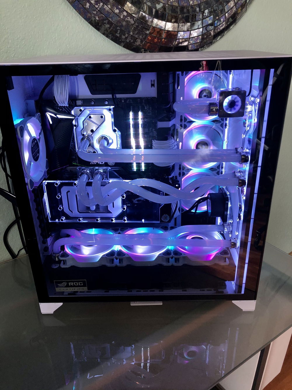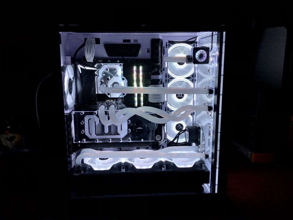 I did all the custom PETG piping and its my first time building a PC from scratch, part for part putting it into its place. Yes, my PC does not have a GPU at this time. I'm in line to get one from EVGA. I'm getting the EVGA GeForce RTX 3080 XC3 ULTRA GAMING. I've been building this PC for the last 6 months, not really knowing the GPU problem was this bad to get one, but I've been being patient.
