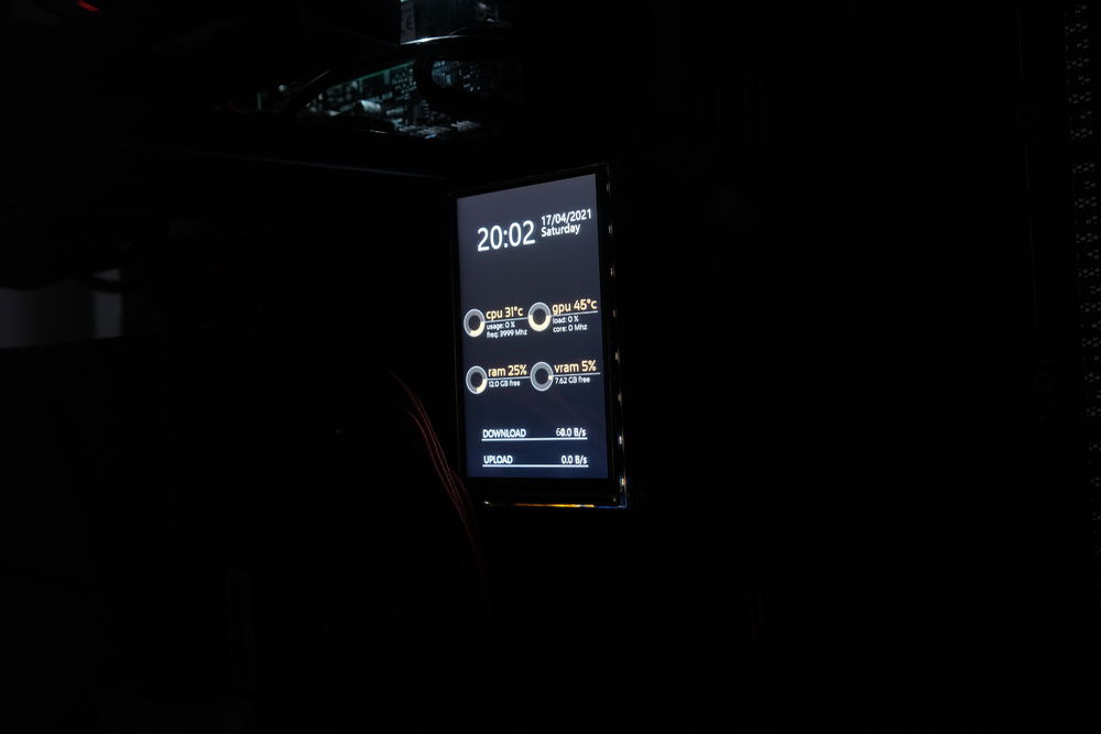 It is Waveshare 4" IPS panel with HDMI port, used as second monitor in Windows 10. To display info about system I use Rainmeter app with modified CircuitousTwo skin.