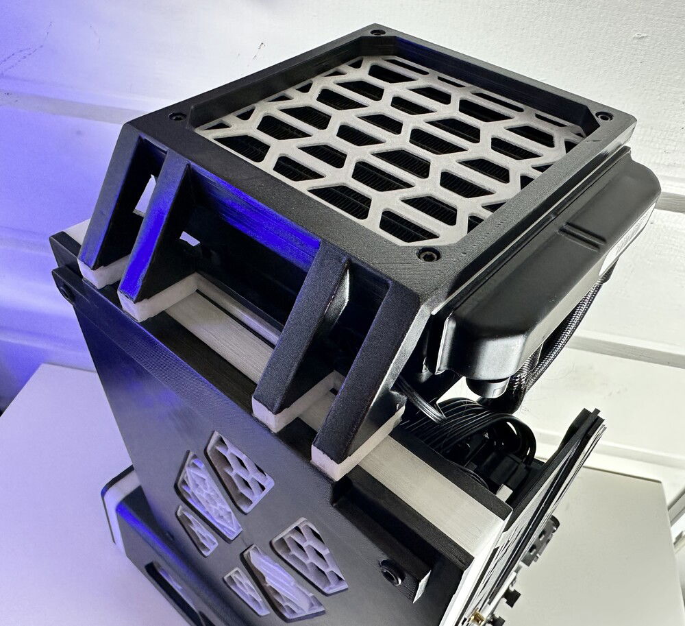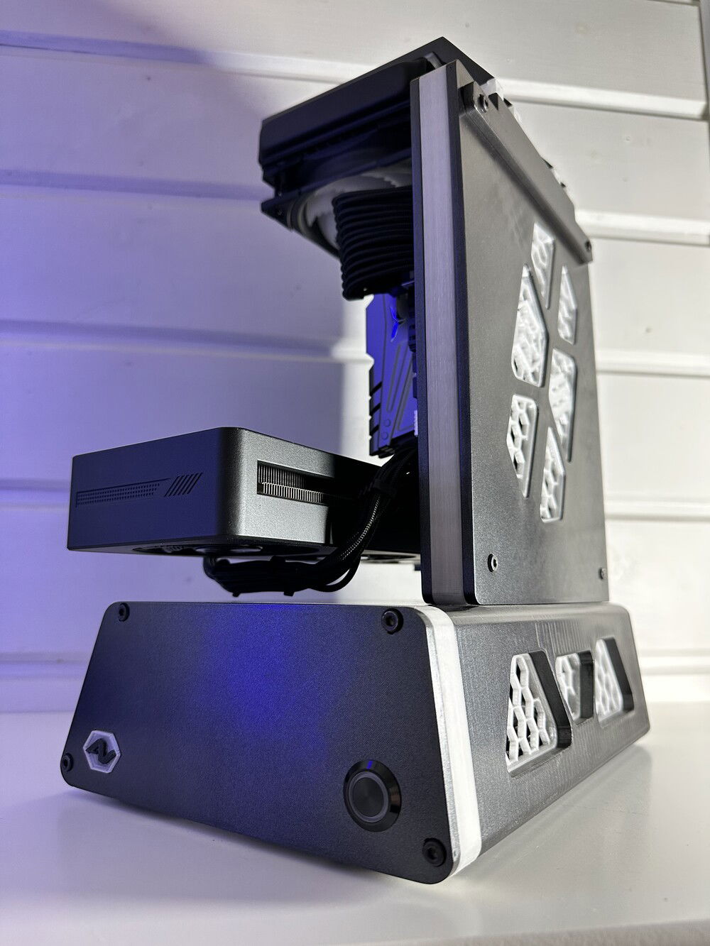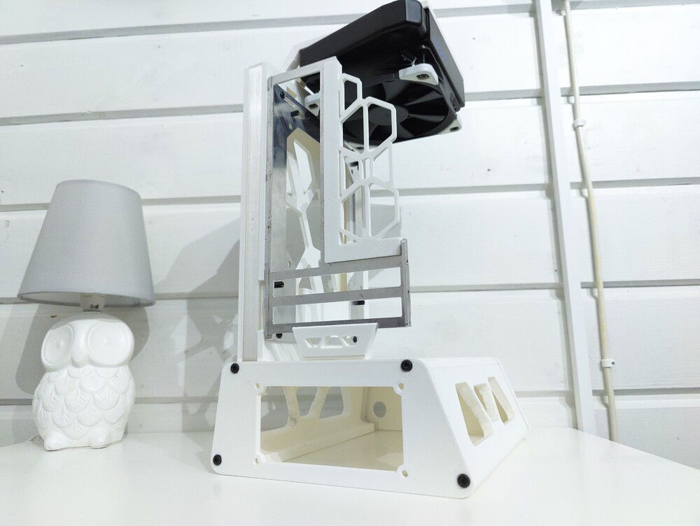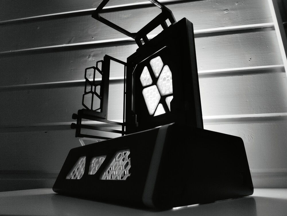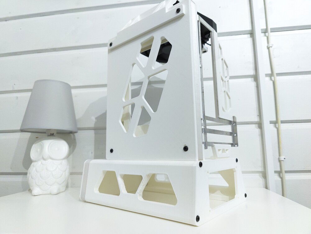 3D printed itx case with transparent panels for rgb lights. My friend did make the aluminium parts for the mb.