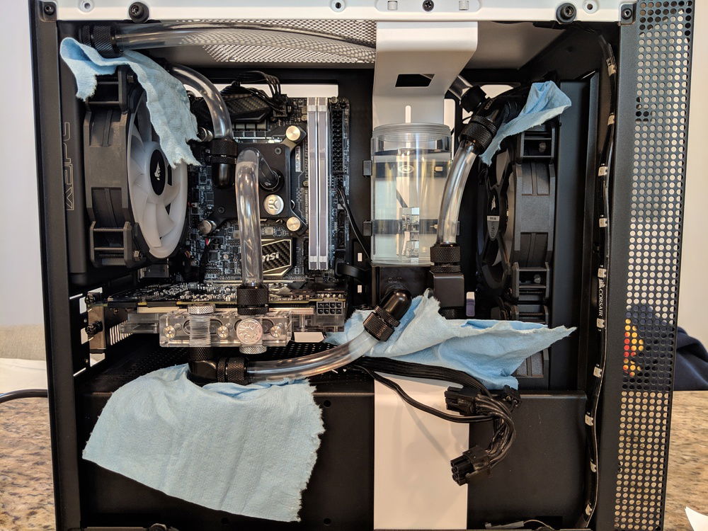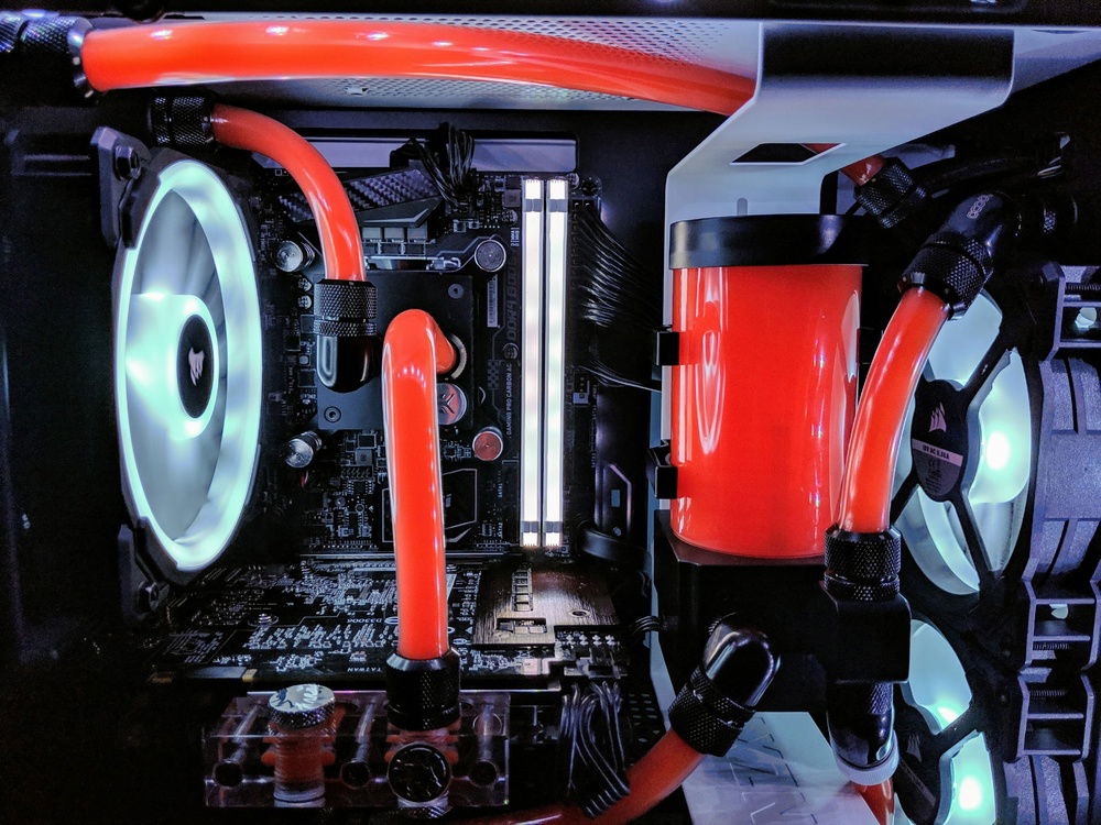 This build really highlights the bright orange EK Cryofuel coolant! Small(ish) form factor but lots of horsepower and plenty of cooling.