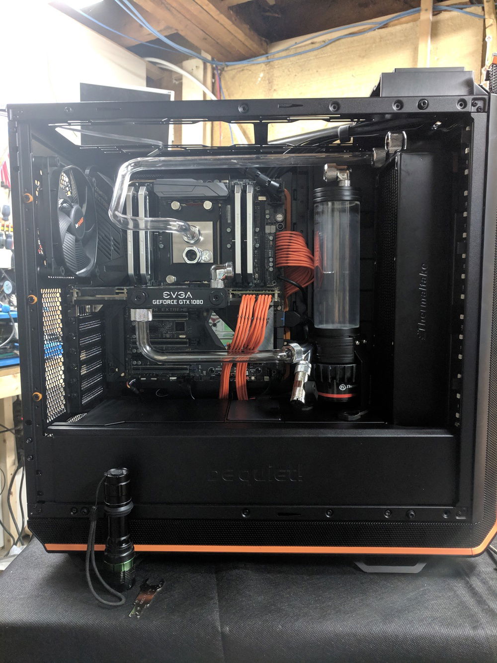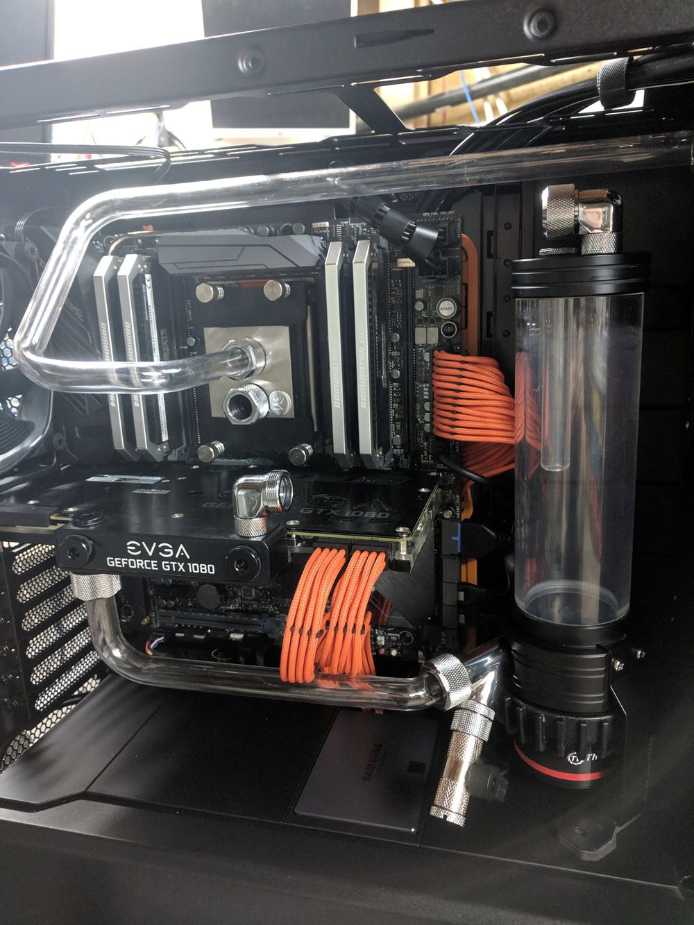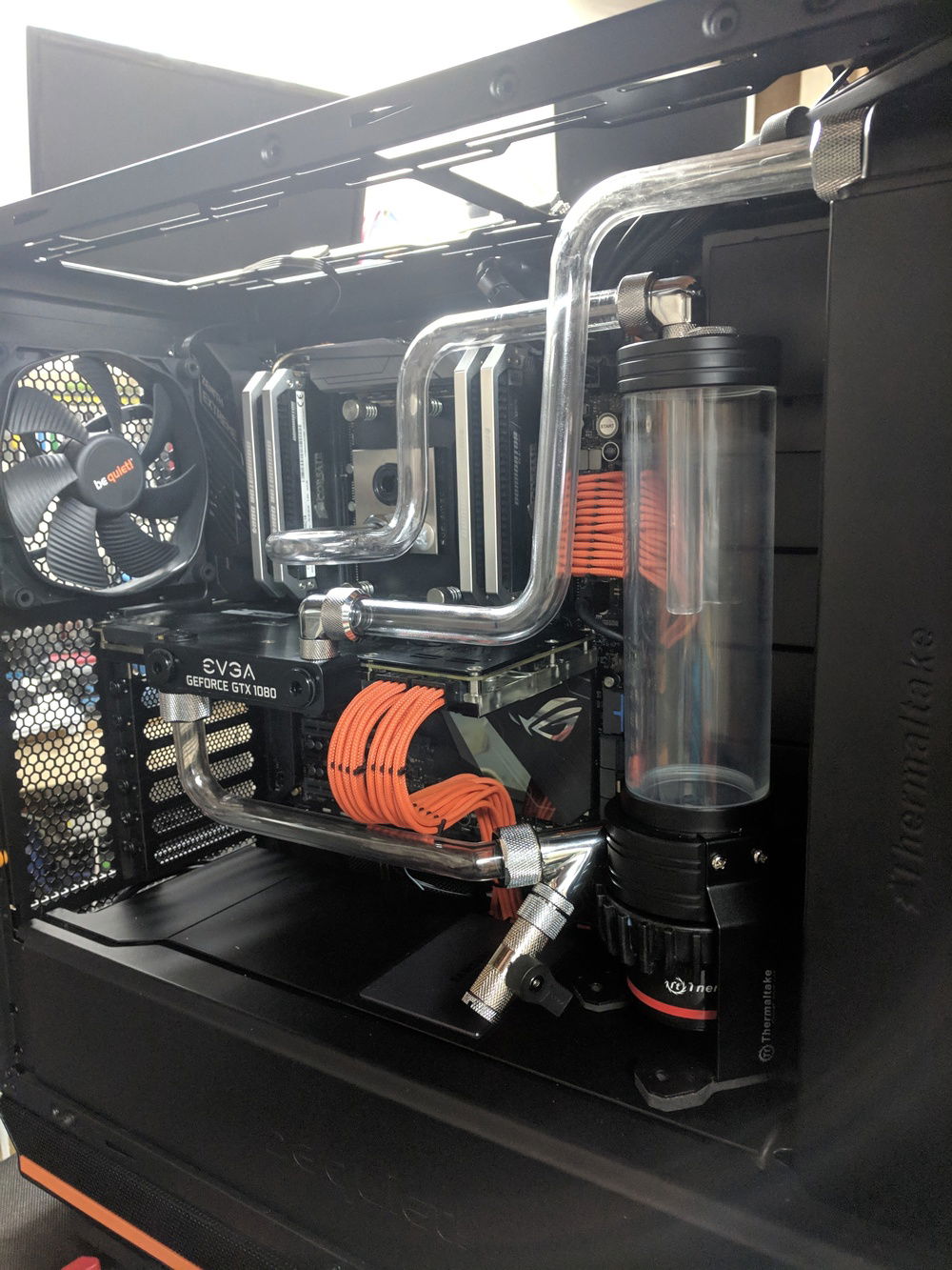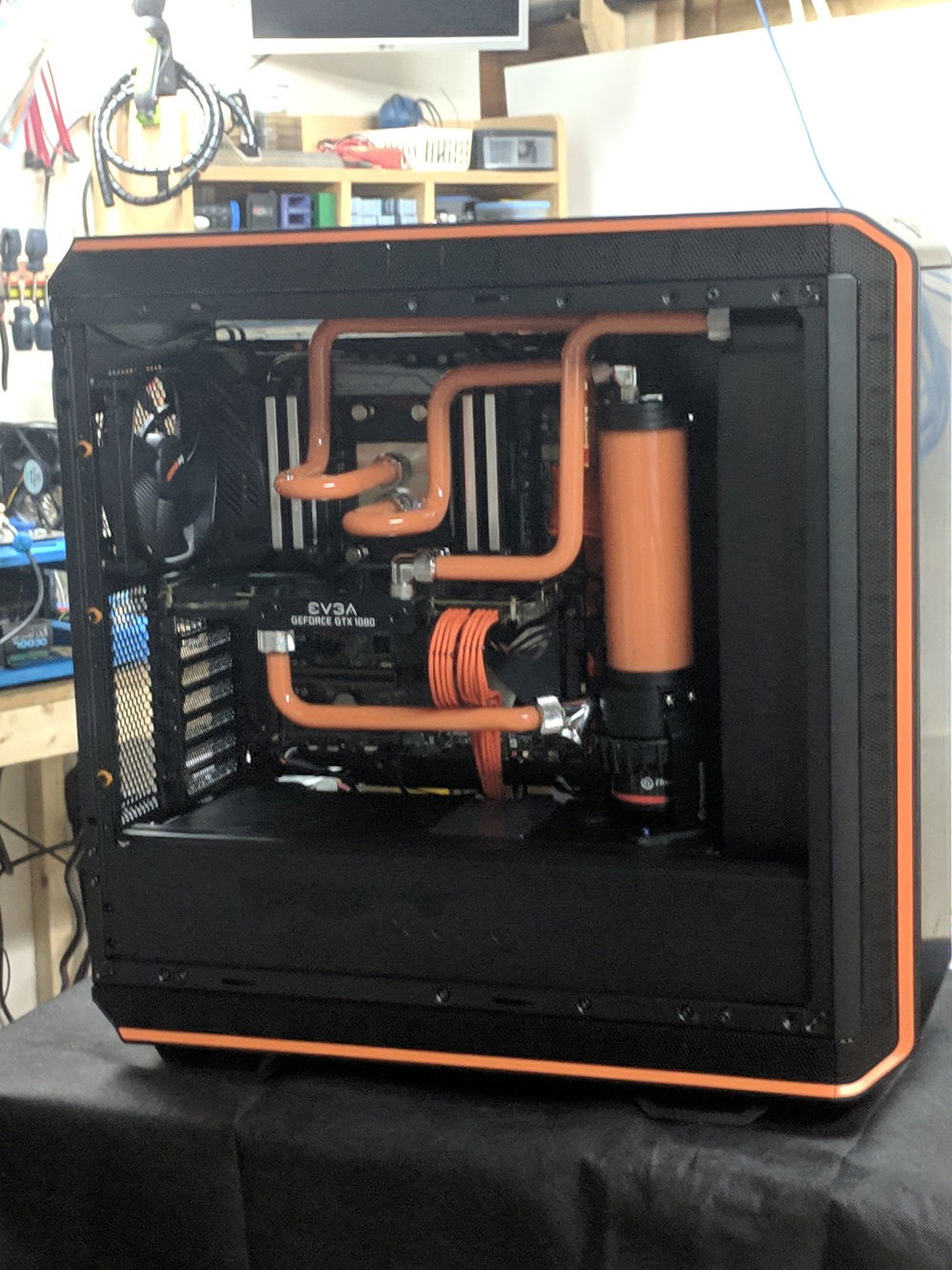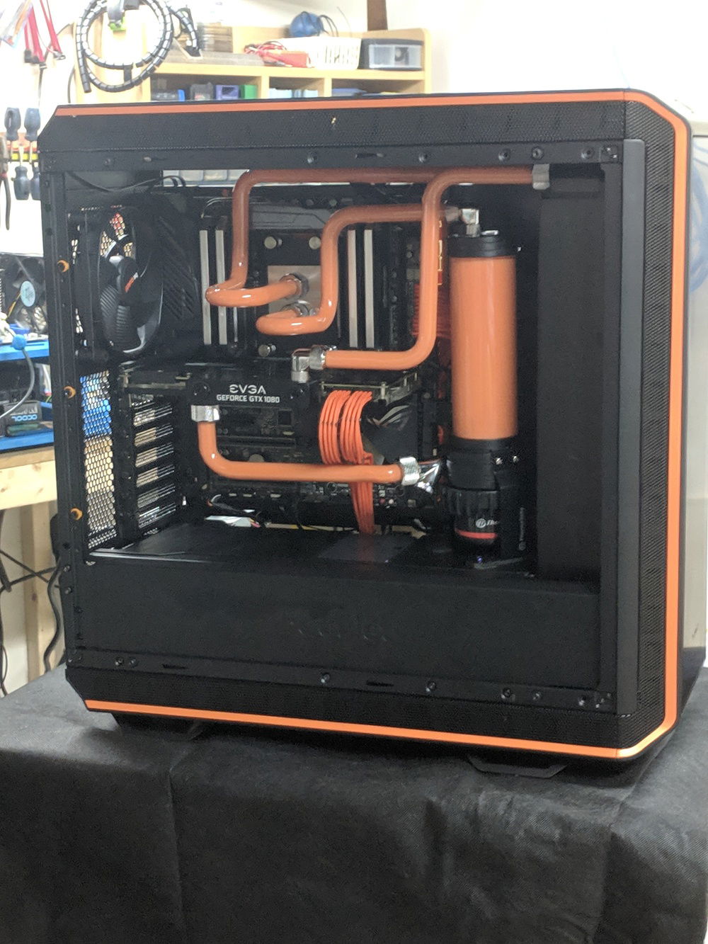 This pc is my first hard tube. So this one is very expensive for me. All tube is hard acrylic. I made this build for fun and mix color orange by my self. Same color. you can see it on the case line.