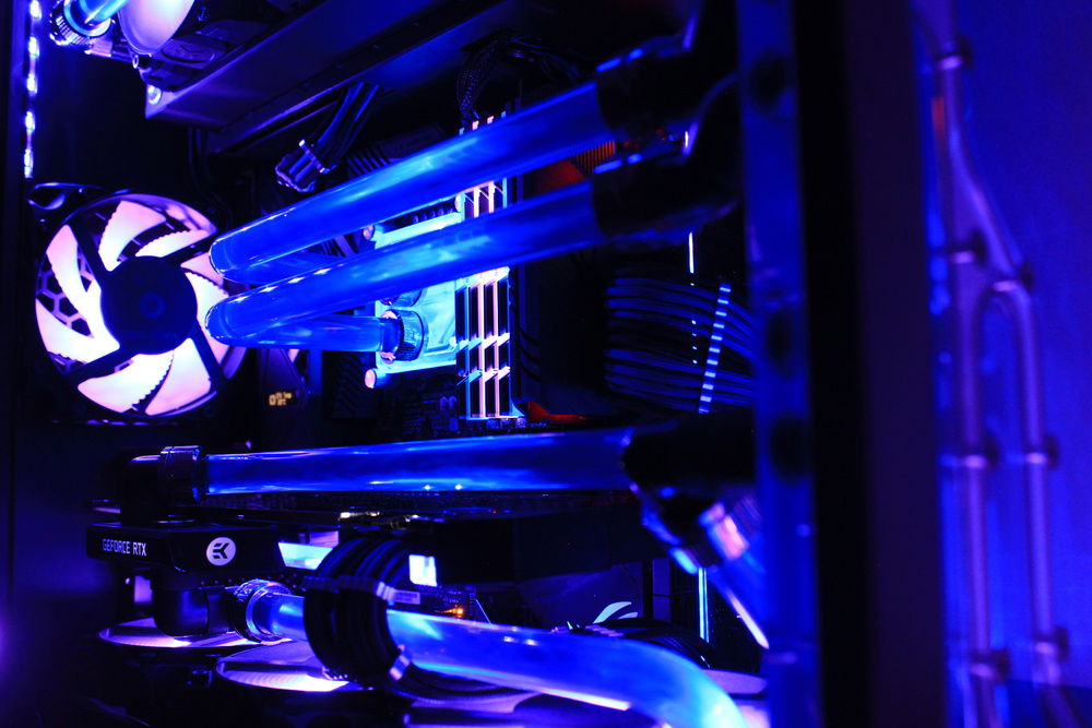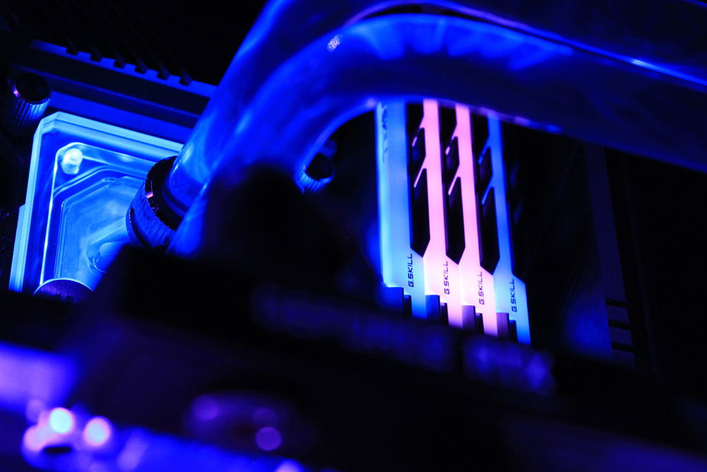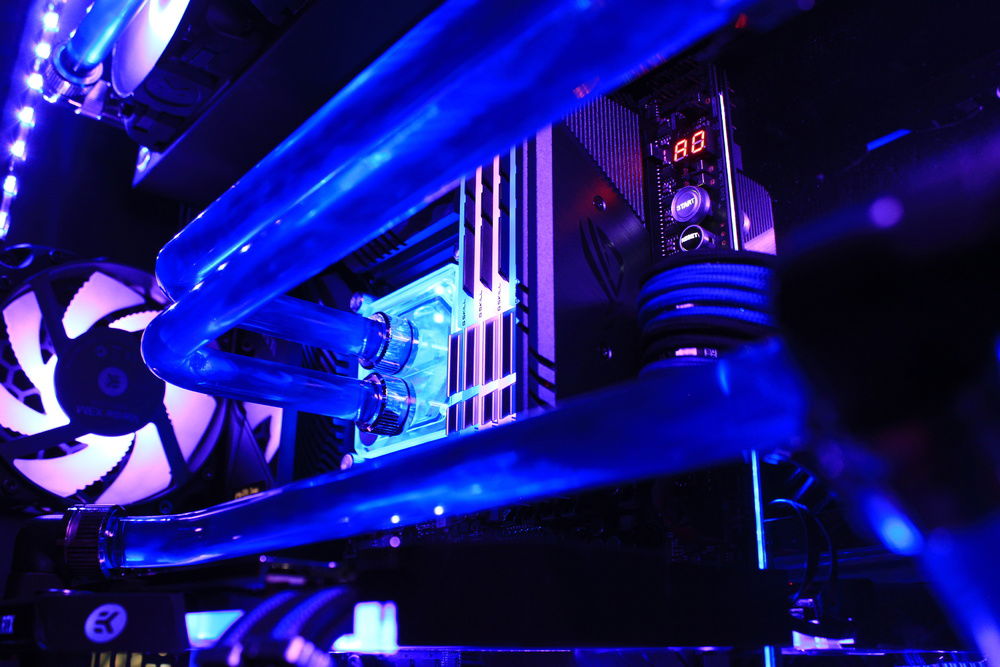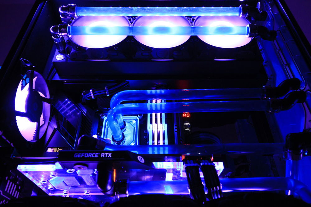 Reservoir : Distroplate EK Fittings : EK Torque HTC 16mm nickel Tube : EK HD tube PETG CPU block : EK Quantum Velocity D-RGB Radiateur : EK Coolstream PE 360 x2 Fan : EK Vardar X3M 120ER D-RGB x7 Controller : EK loop connect