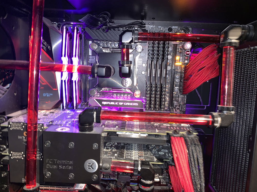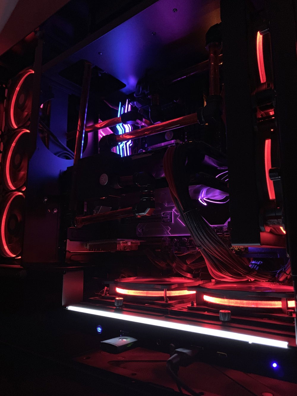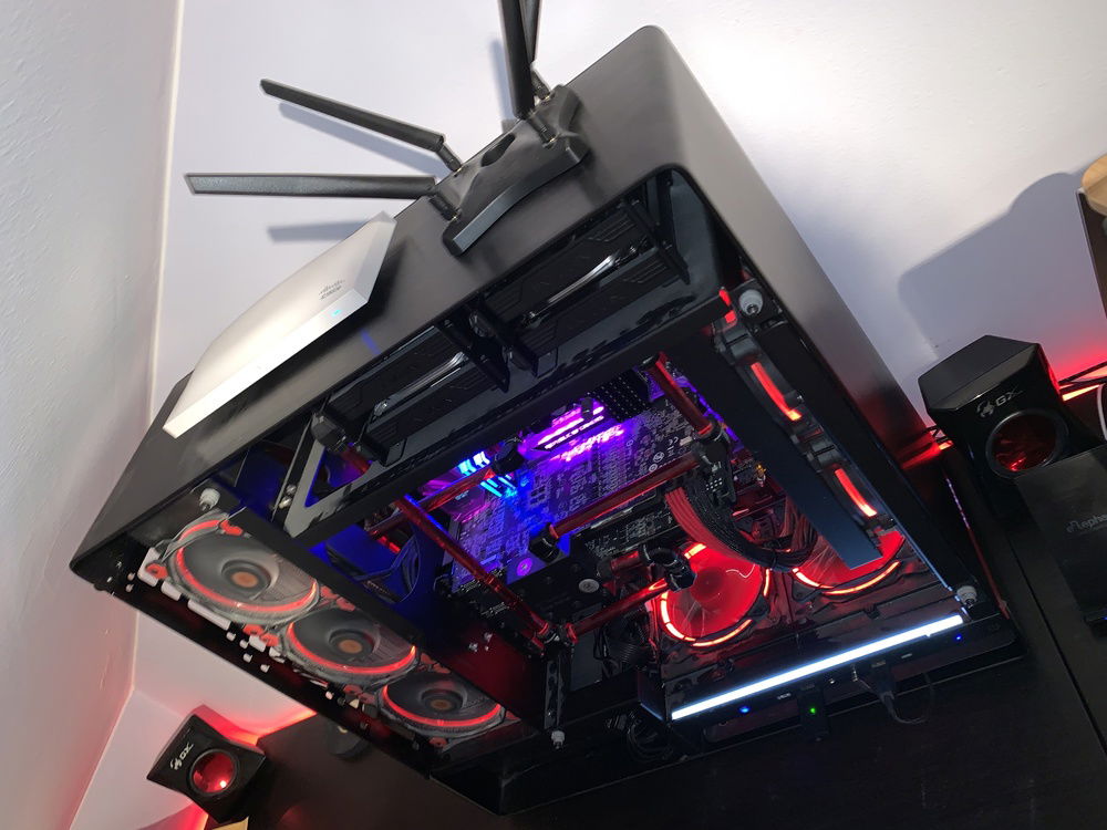 This is my very first custom liquid cooled build. Main theme for the build was a Black and Red. I am currently researching/learning to bend tubes so I can build a more aesthetically looking build. My Router is really far and hence I've got a Cisco Access Point on top of my build.