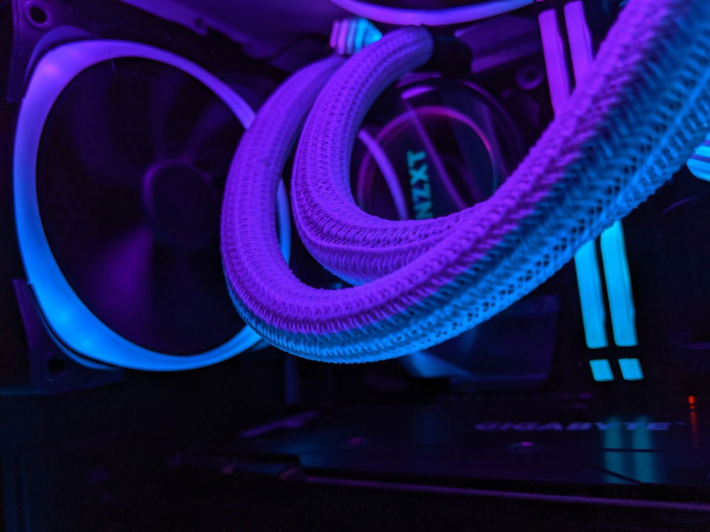 The build took quite a while longer than I had expected because I had to order a few things after the fact. Most of the cables were too short! So I had to order extensions which kinda worked out well because the white adds to the look. I had a hard time fitting the X52 pump as the cables coming from it interfered with the PCIE slot, so annoyingly I had to take it off, rotate it and put it back. I was silly and didn't even think of having to reapply thermal paste so that was another thing that took a week to arrive.