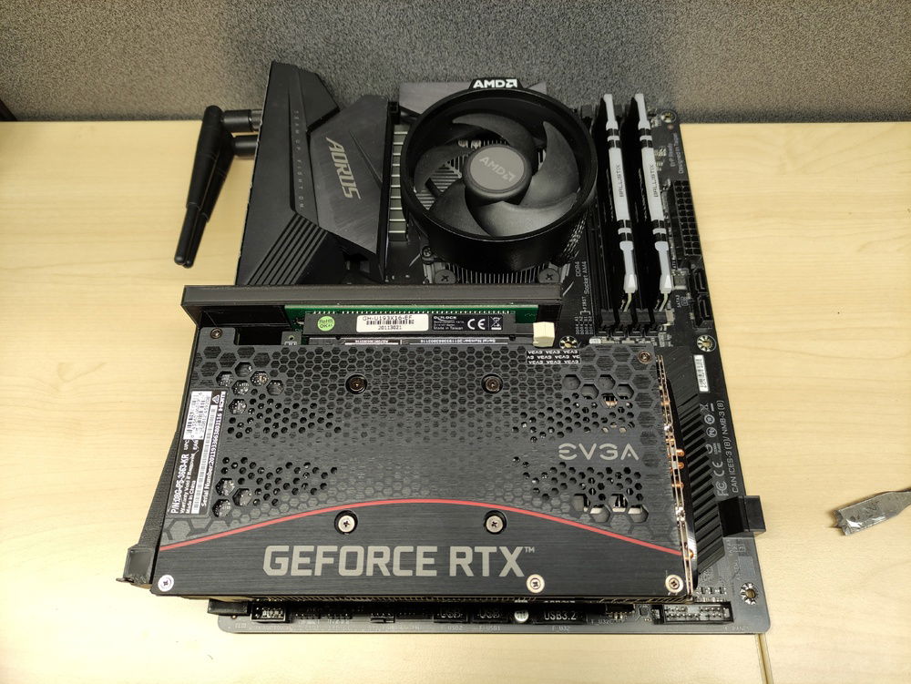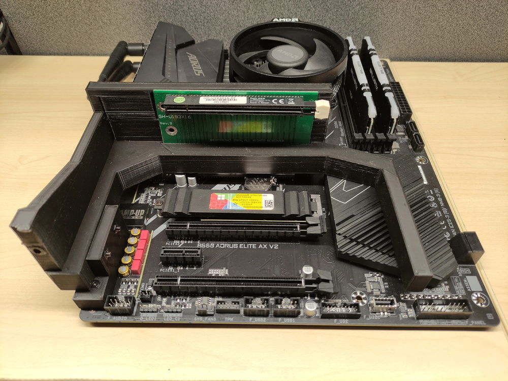 I 3D printed a part that would fit around the PCIE riser and would stabilize the GPU.