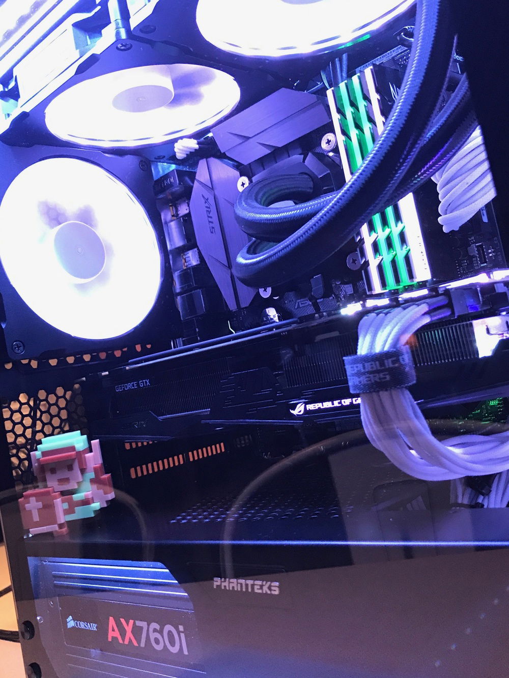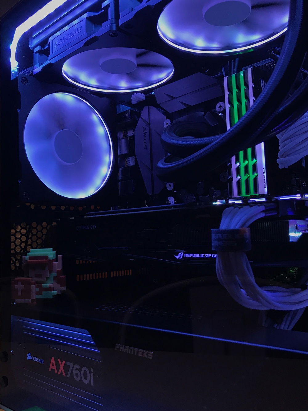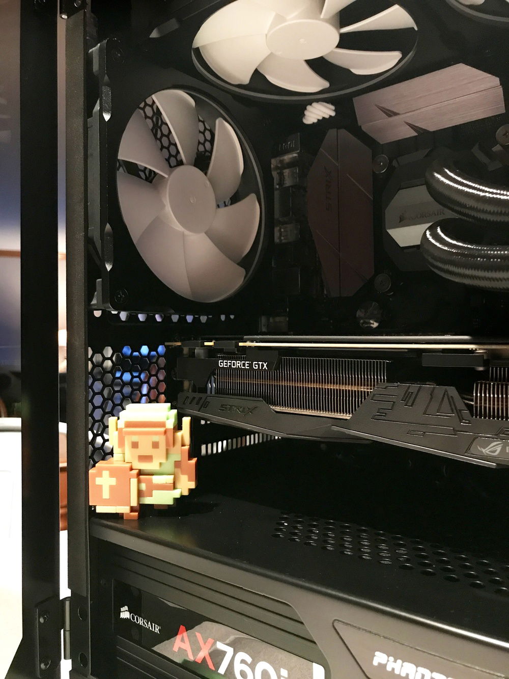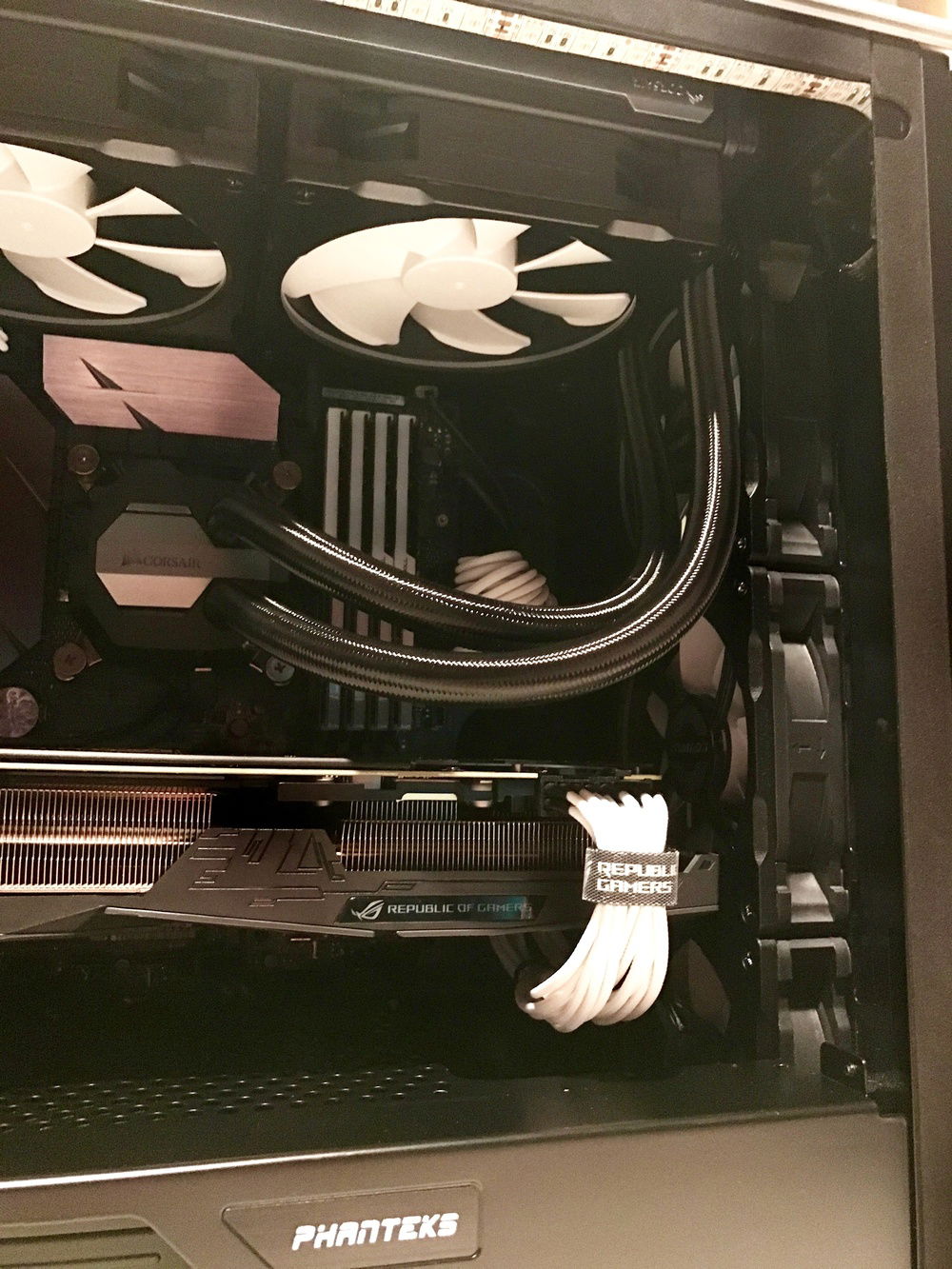 GPU: Its massive! Waited forever for this card. (And to post this build, as was still rocking my EVGA 980ti) Its fast, and surprisingly cool. Without the radiator in the front it gets fed plenty of cool air and with the core OC'd to 1775 MHz via EVGA's Precision X OC it will run at 120% and only 60C. Most games will run full speed on ultra settings @ 4K. ASUS' GPU tweak is a POS and I can't use it as it bugs out the entire OS unless I restart the DWM proccess. Its seems more focused on looks than actual function. GPU tweak is totally unusable for me.
