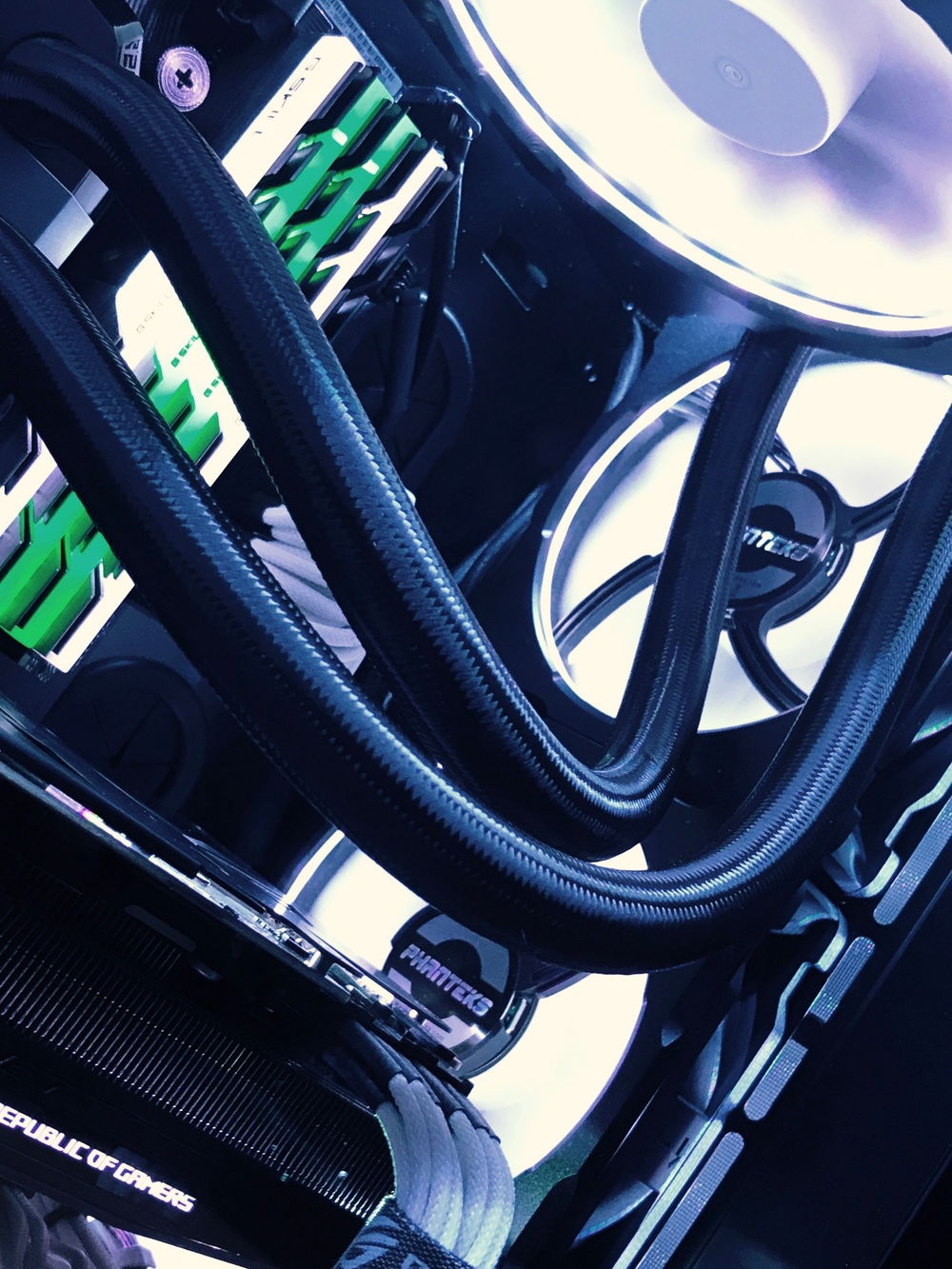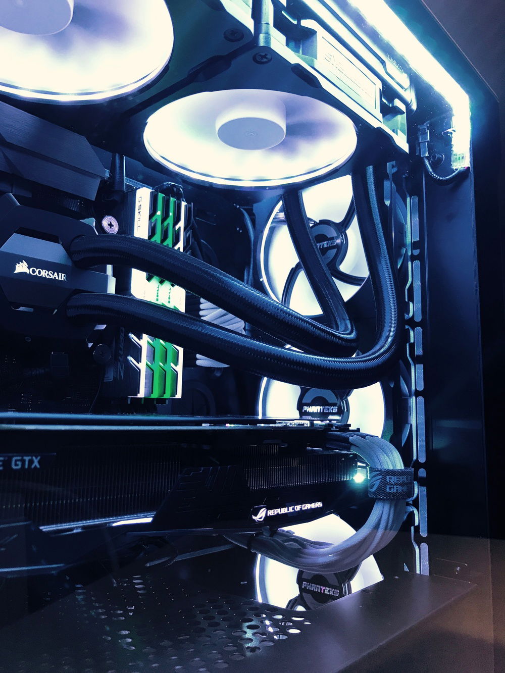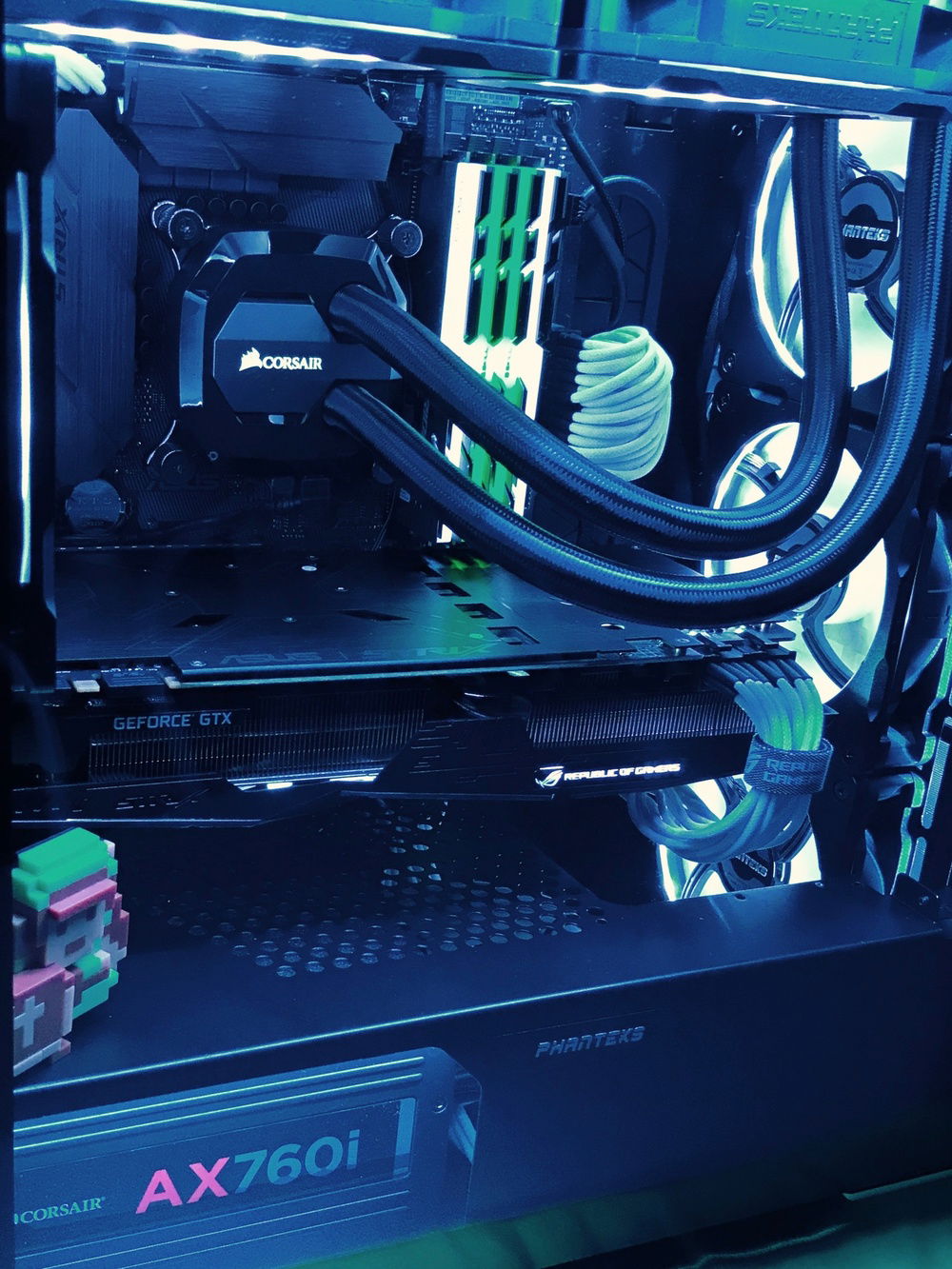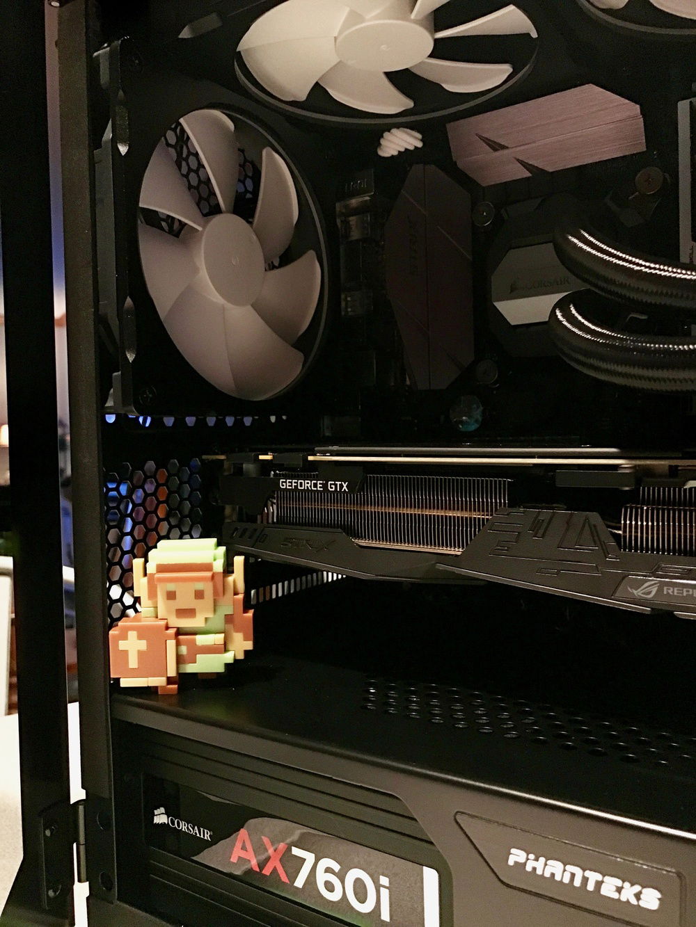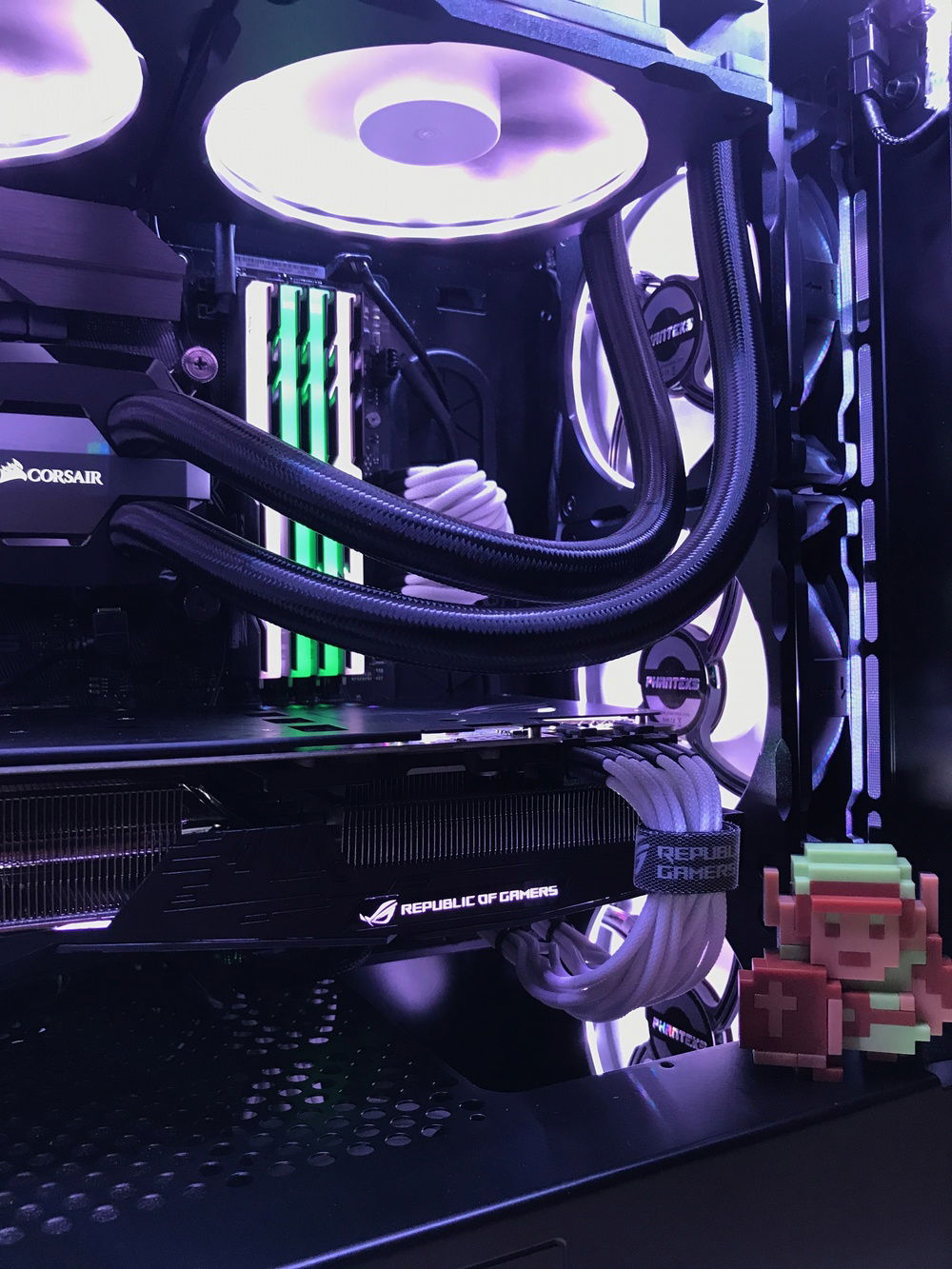 GPU: Its massive! Waited forever for this card. (And to post this build, as was still rocking my EVGA 980ti) Its fast, and surprisingly cool. Without the radiator in the front it gets fed plenty of cool air and with the core OC'd to 1775 MHz via EVGA's Precision X OC it will run at 120% and only 60C. Most games will run full speed on ultra settings @ 4K. ASUS' GPU tweak is a POS and I can't use it as it bugs out the entire OS unless I restart the DWM proccess. Its seems more focused on looks than actual function. GPU tweak is totally unusable for me.