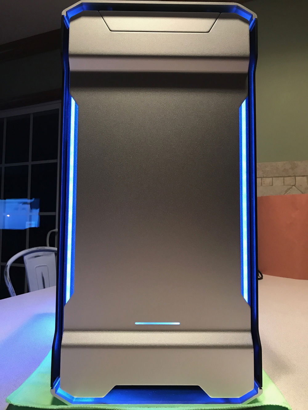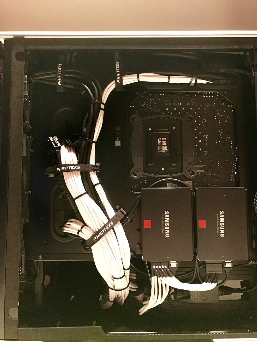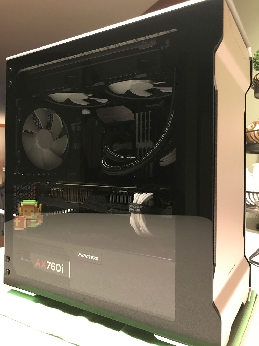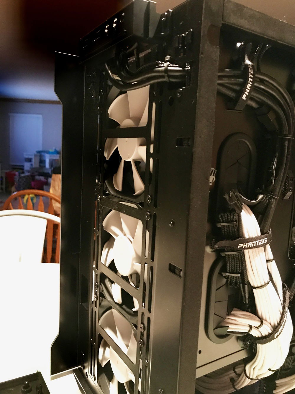 Case: This is what kicked off the re-imaging of this build. Killed off the Frosted clear Parvum S2.5 nightmare of a case and gave rise to this. After a friend sent me a link to a few cases, I started to snowball and came across this case. Its amazing. Best build quality I've seen of a case, the design is nearly impeccable, though it does have a few short comings in regards to airflow and space. It is an mATX case though and those things were to be expected. The airflow out of the top is tough and heavily restricted. The front is also restricted but doesn't seem nearly as bad. The only gripe i have with the case is the thickness restriction of items i can fit in the front caused by the overall depth of the case as well as the PSU cable shroud. They could have left a little more room available if they would have cut the shroud just a little more towards the back. Can't even fit a fan with a halo on it without taking off the removable portion of the shroud. I cannot fit a radiator in the front with the 1080ti and its stock cooler either, the damn thing is massive. If the stock GPU cooler was replaced though a small radiator should fit albeit very tightly. Still just enough room for just about everything else and the SSD and PSU windows are fun. Though, with my cable management I would probably prefer a full glass panel on the back side too so i could show it off. I only wished I had gotten the grey case instead as it would have matched the board perfectly. An oversight on my part. After building in this case, I would highly recommend Phanteks products to everyone, as the quality is top notch.