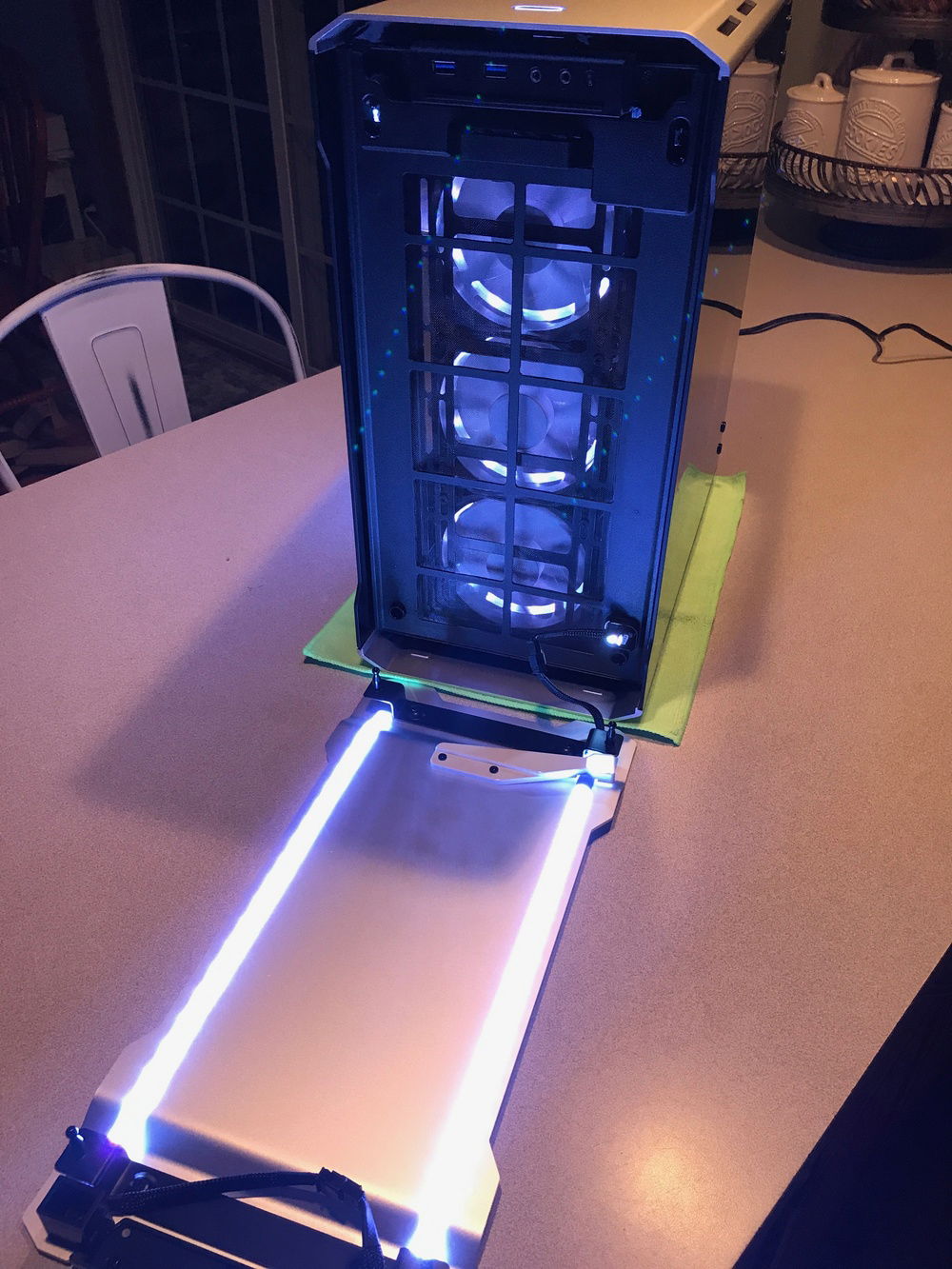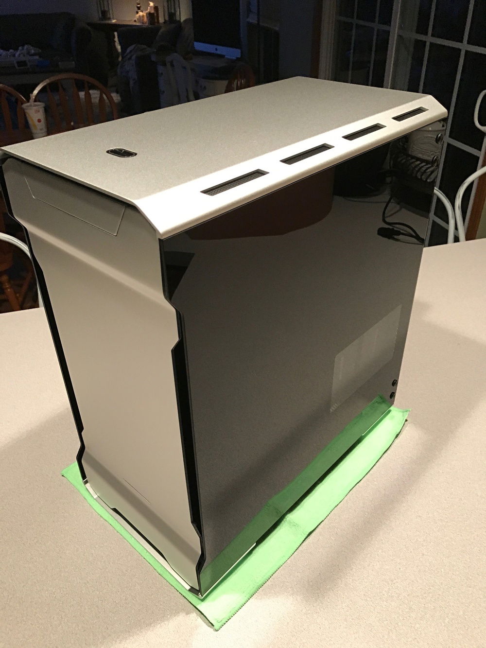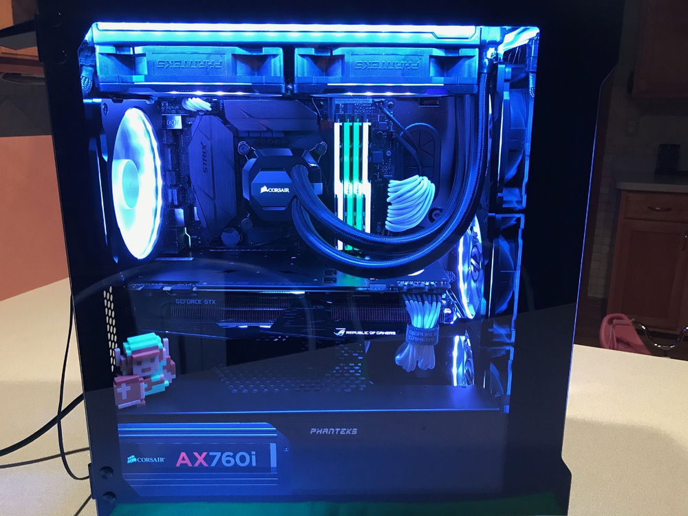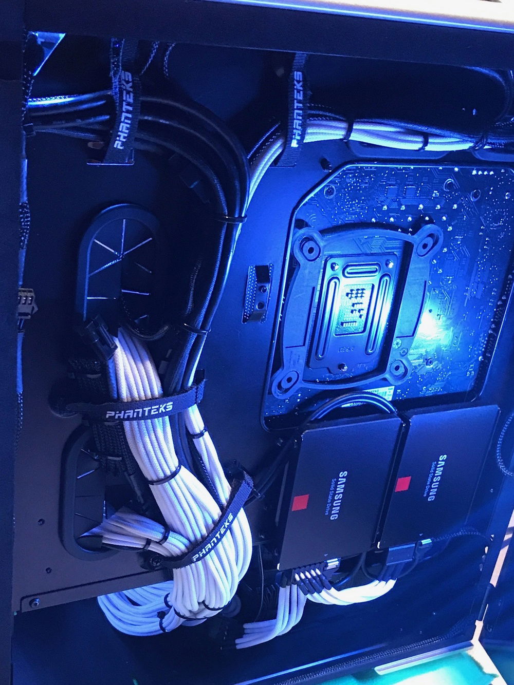 Case: This is what kicked off the re-imaging of this build. Killed off the Frosted clear Parvum S2.5 nightmare of a case and gave rise to this. After a friend sent me a link to a few cases, I started to snowball and came across this case. Its amazing. Best build quality I've seen of a case, the design is nearly impeccable, though it does have a few short comings in regards to airflow and space. It is an mATX case though and those things were to be expected. The airflow out of the top is tough and heavily restricted. The front is also restricted but doesn't seem nearly as bad. The only gripe i have with the case is the thickness restriction of items i can fit in the front caused by the overall depth of the case as well as the PSU cable shroud. They could have left a little more room available if they would have cut the shroud just a little more towards the back. Can't even fit a fan with a halo on it without taking off the removable portion of the shroud. I cannot fit a radiator in the front with the 1080ti and its stock cooler either, the damn thing is massive. If the stock GPU cooler was replaced though a small radiator should fit albeit very tightly. Still just enough room for just about everything else and the SSD and PSU windows are fun. Though, with my cable management I would probably prefer a full glass panel on the back side too so i could show it off. I only wished I had gotten the grey case instead as it would have matched the board perfectly. An oversight on my part. After building in this case, I would highly recommend Phanteks products to everyone, as the quality is top notch.