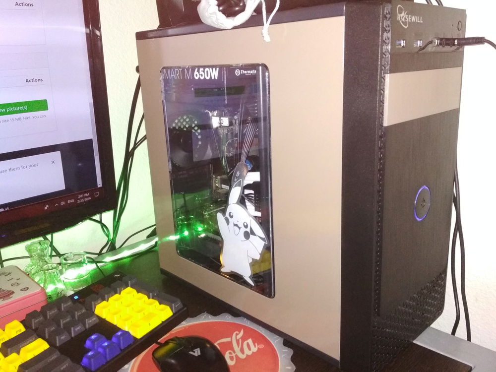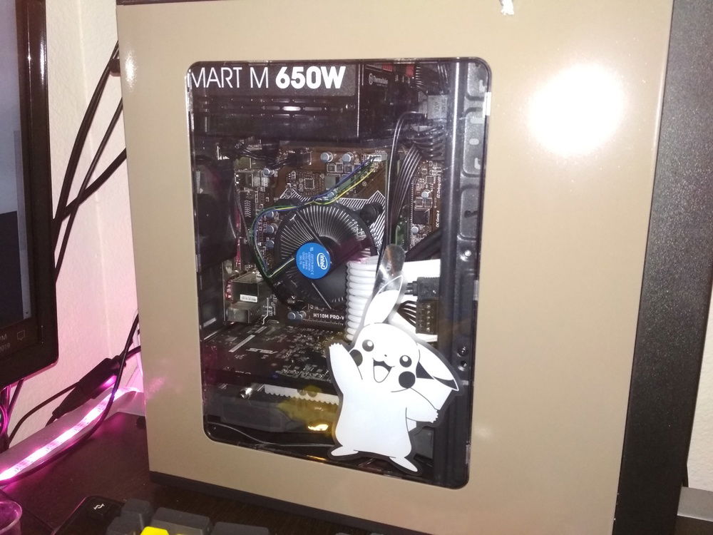 Pentium G4560 cpu, MSI H110M mATX motherboard, Asus Strix ROG Radeon 570, Thermaltake 650w semi-modular psu, Rosewill FBM-X1 mATX case (painted). Asus aura sync set to yellow blinker reminiscent of older status indicators. Two-toned dark gray and beige color-scheme reminds me of older pc peripherals that get a darker beige as time goes on.