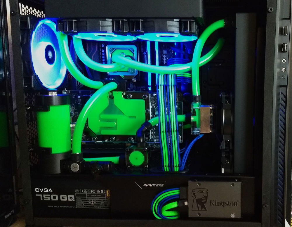 This is my first build. Started out with just an AIO but was instantly bit by the bug and went full custom loop as soon as I could get the parts in the mail. Do need to get around to removing the flow indicator since I didn't think it would become invisible with the green coolant. All in all had a lot of fun with this build. I have the CPU OC'd to 4.2 all cores and it maxes out at about 60c. The GPU is OC'd to 2050 core and 11gbs memory and runs 63c max.