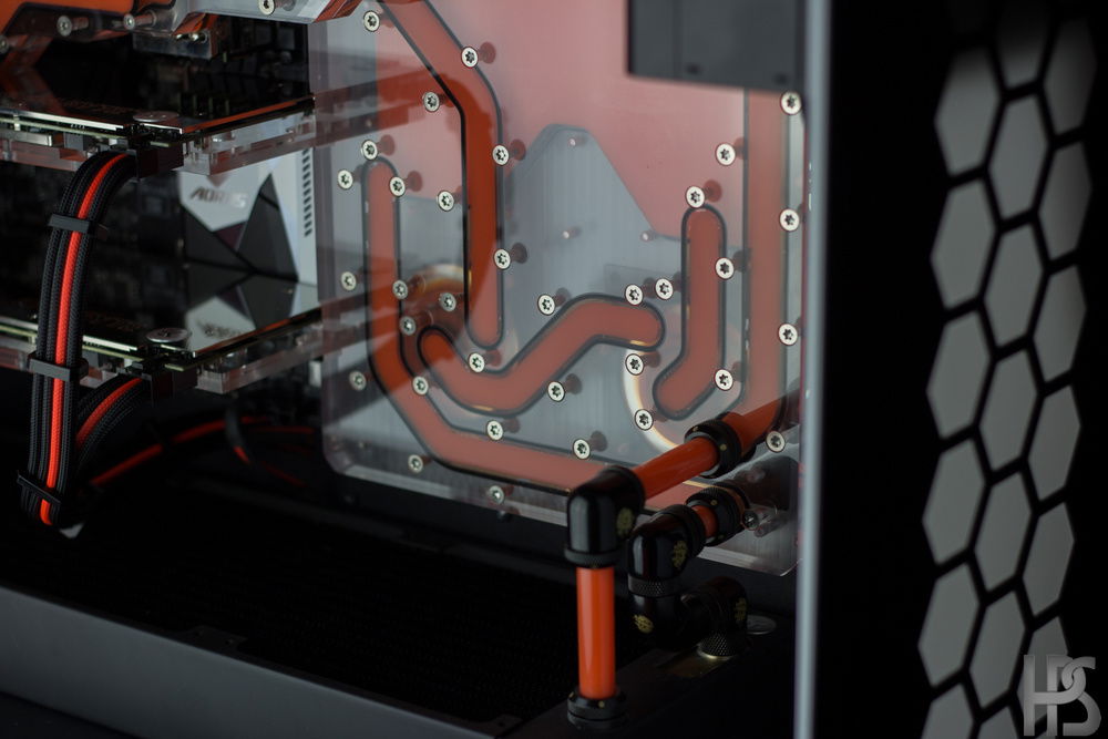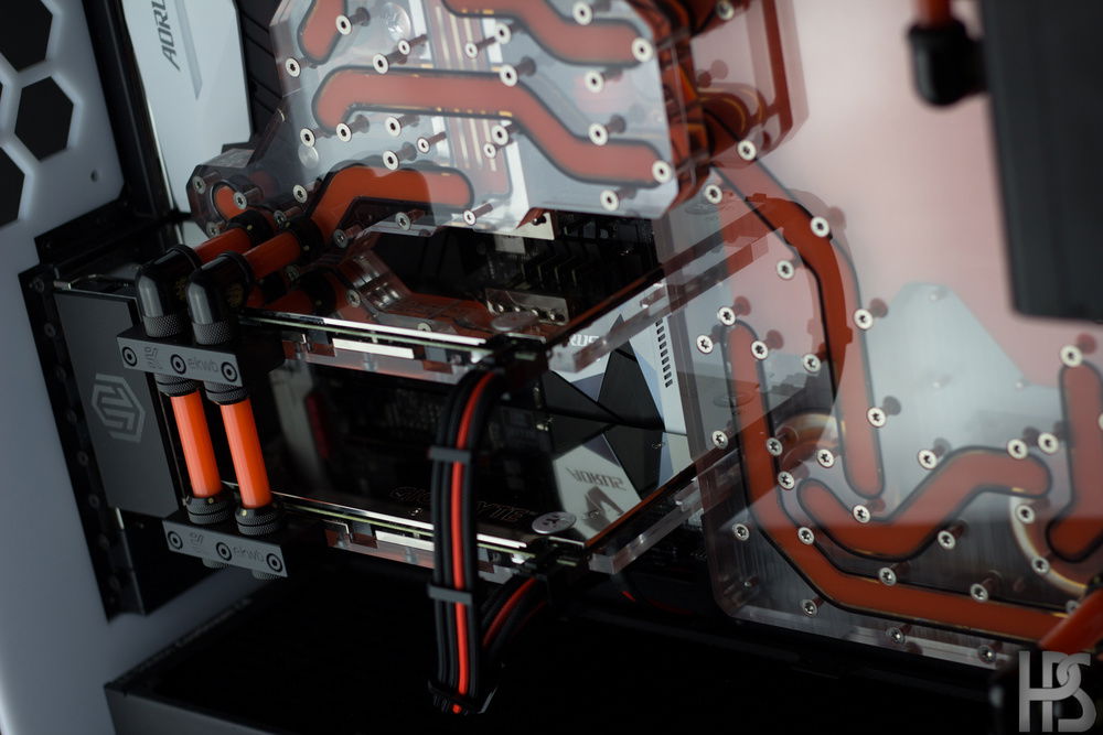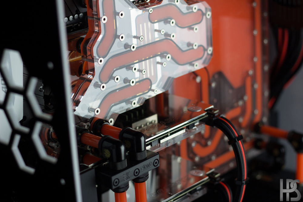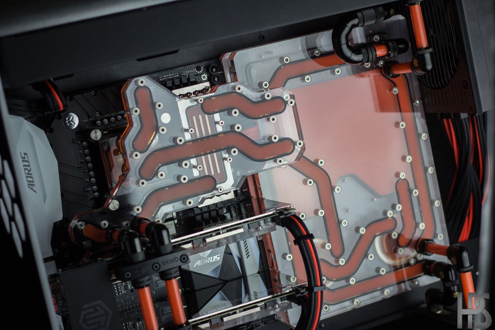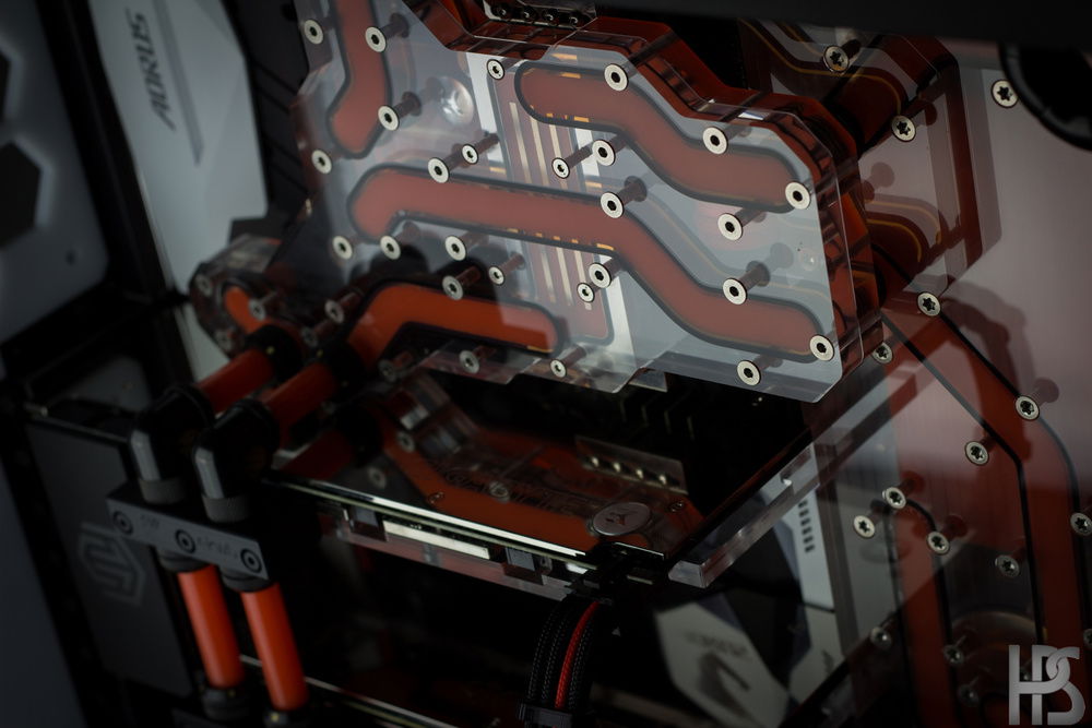 Plate one that sits on the motherboard connects all the major components such as GPU, CPU, motherboard and RAM into one big distributing plate. The second plate houses the reservoir as well as two D5 pumps and routes the fluid into the radiators in top and bottom as well.