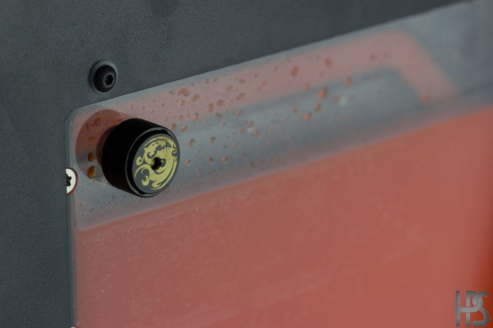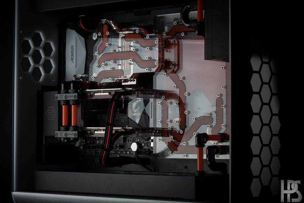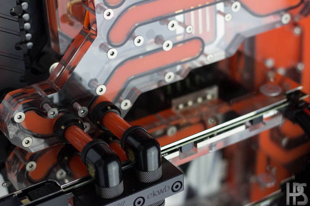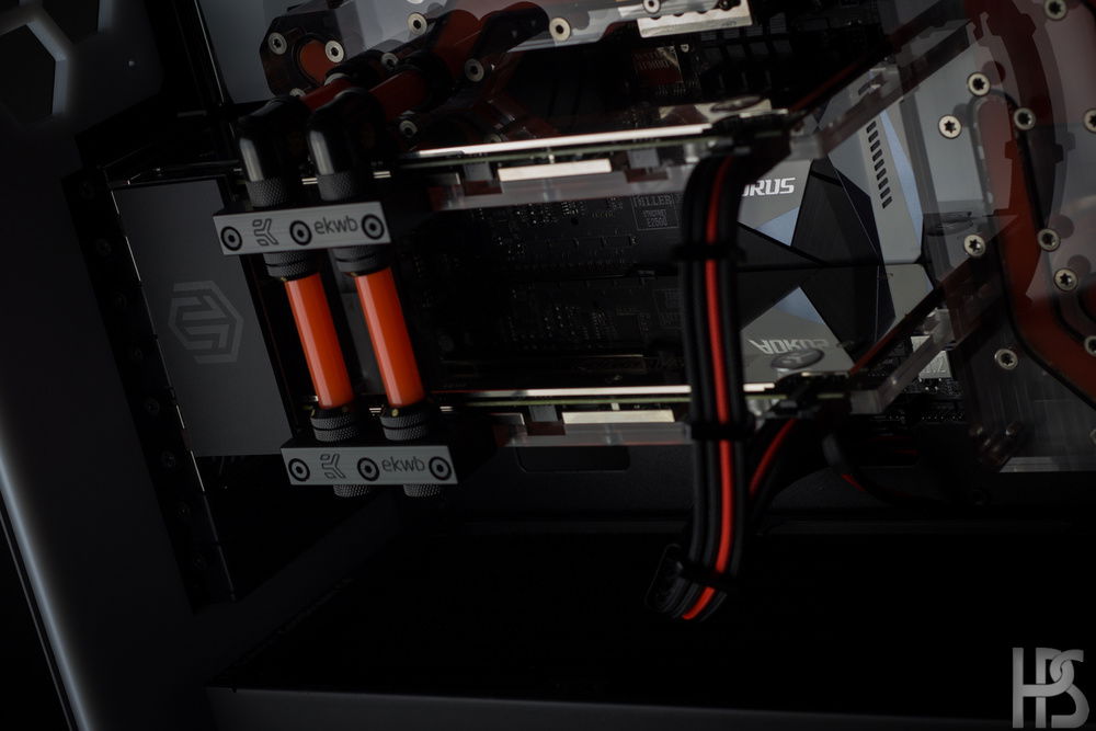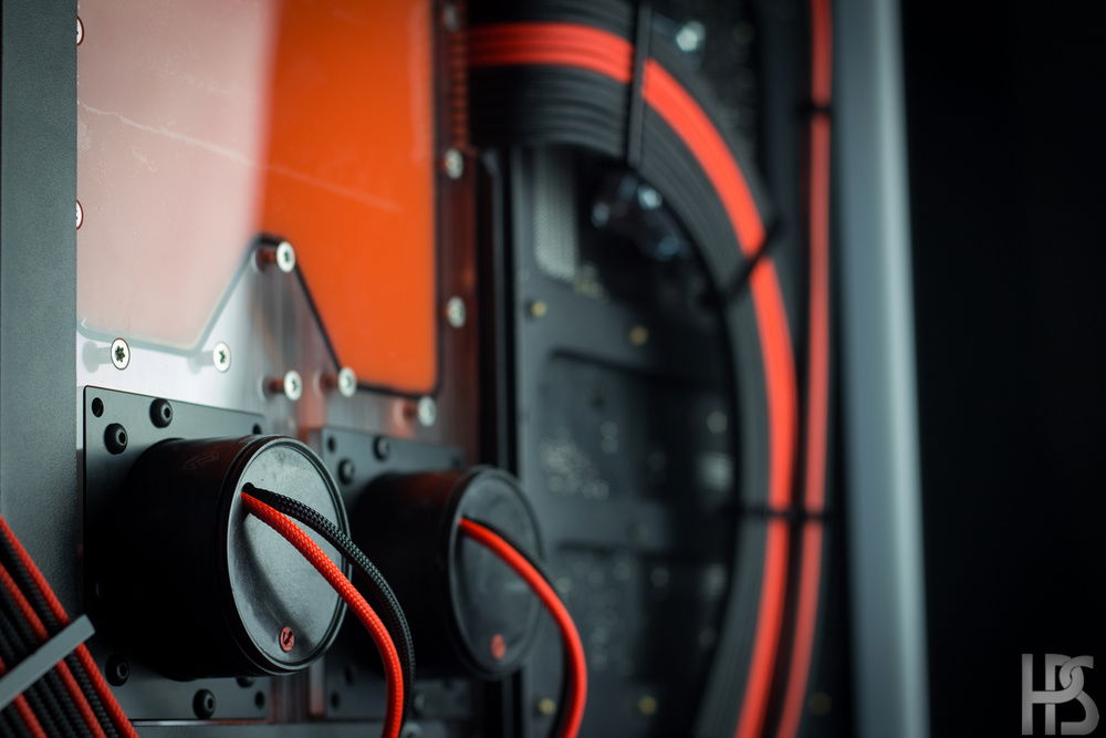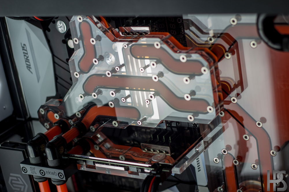 Plate one that sits on the motherboard connects all the major components such as GPU, CPU, motherboard and RAM into one big distributing plate. The second plate houses the reservoir as well as two D5 pumps and routes the fluid into the radiators in top and bottom as well.