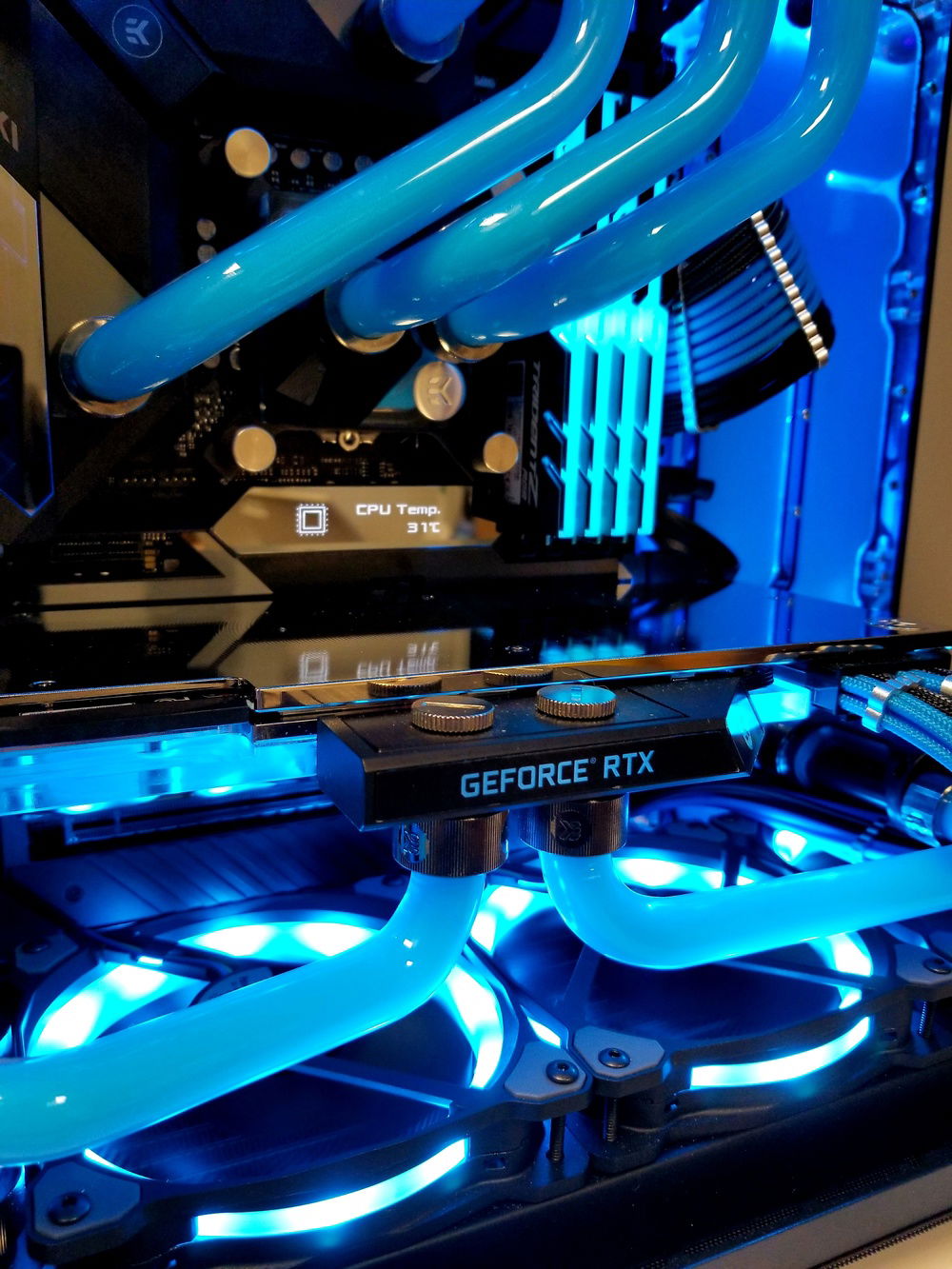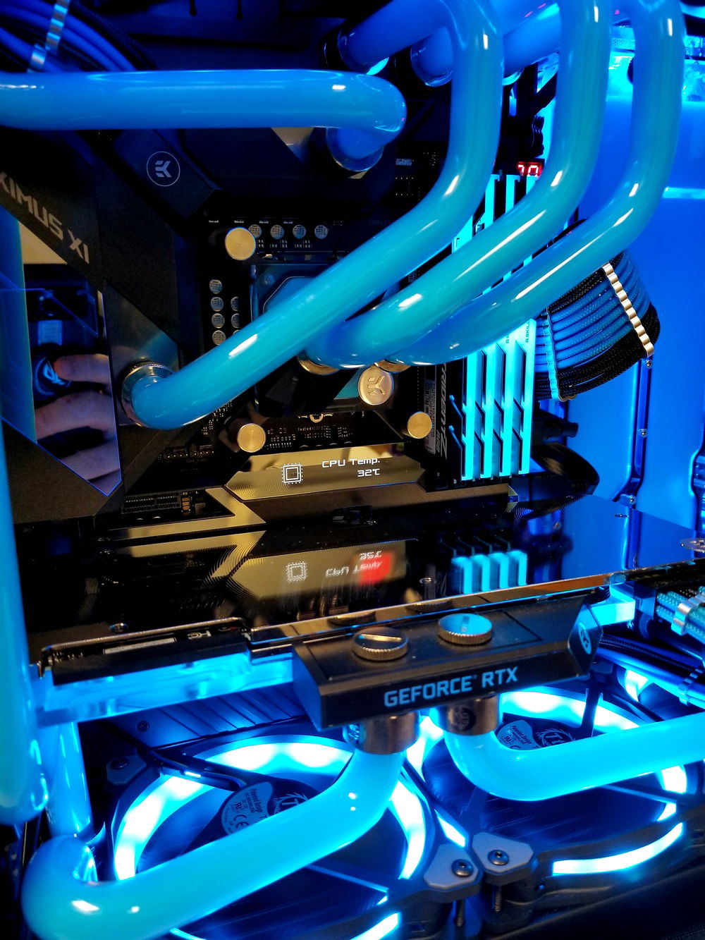 Intel i9-9900k Gigabyte Windforce OC 2080Ti Lian Li O11 Dynamic Case Asus Maximus XI Formula Motherboard EVGA P2 1200w Platinum PSU Samsung 970 Evo 1TB NVMe boot drive 32 GB G.Skill TridentZ RGB 3600MHz RAM Radikult Customs 360mm Acryllic Waterway EKWB Supremacy Edge CPU Waterblock EKWB EK-Vector 2080Ti Waterblock EK D5 Pump EK Coolstream SE 360mm Rads x2 Thermaltake Riing Plus RGB 120mm Fans Thermaltake Sync Module EKWB Black Nickel HDC Fittings CableMod Pro Modflex Custom Sleeved Cables