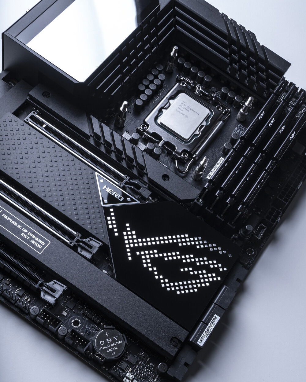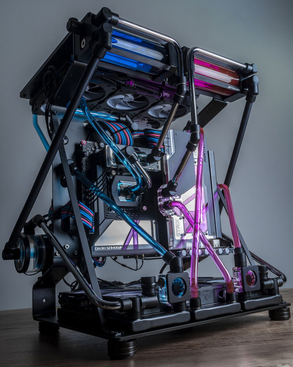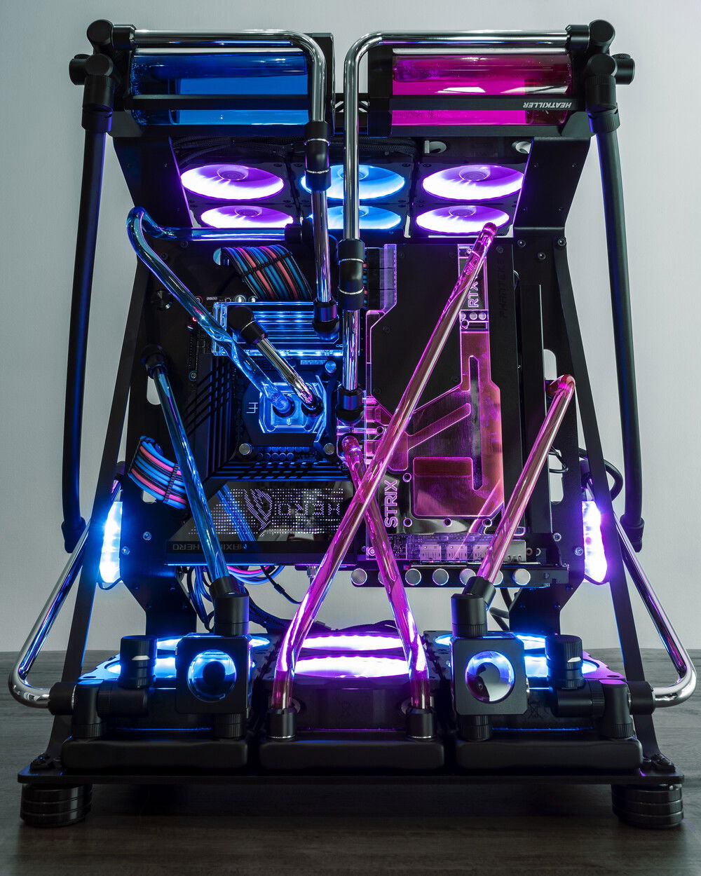 I used the new Intel Core i9 12900k, Asus' new Maximus Z690 Hero, and Kingston's Fury DDR5 5200mhz, which I happened to waterblock as well since the ECC chip does get quite warm! The streamer I was paired with is a Roblox developer, on top of content creator so he needed some solid storage. I chose two 10TB WD_Black HDD's in Raid 10 for some redundancy and a 2TB NVMe. The GPU is of course the Strix 3080Ti with a Phanteks block, which was a perfect fit for the build aesthetic!