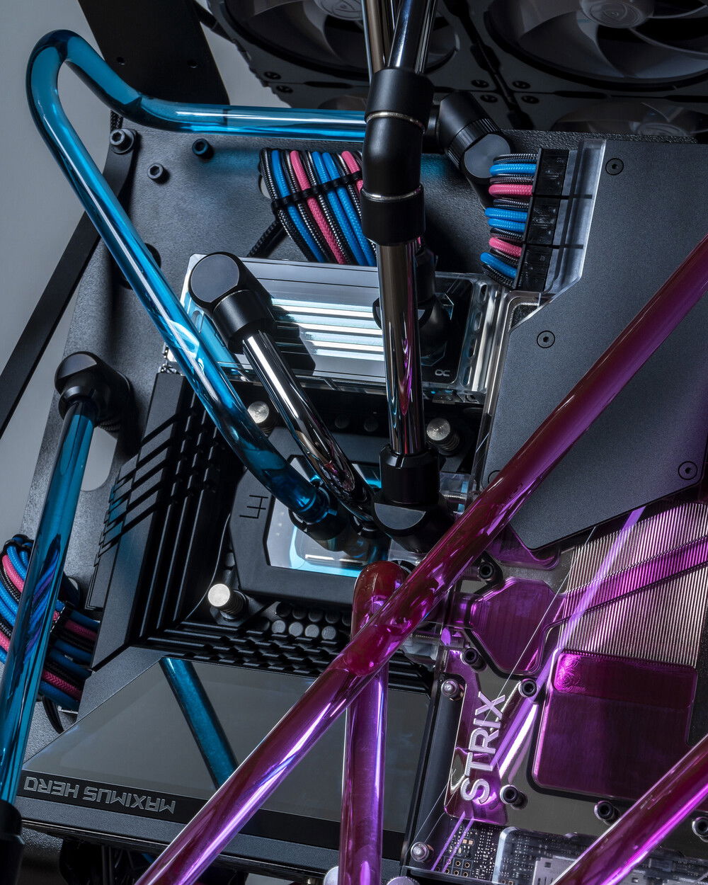 Noiseblocker came in clutch for the fans with their eLoop's, and XSPC's TX line radiators were perfect. You think 6 of them were enough? Ha! Watercool came in a provided some Heatkiller Tube reservoirs and the Heatkiller IV Pro which mated up quite nicely to the 12900k. The Maximus Hero has dual LGA 1200/1700 mounting so I didn't have to modify the block mounting bracket. Utilized EK's D5 pumps which do indeed flow a bit more than other D5 tops, and EK Torque rotary fittings paired up with Monsoon EV2 compression fittings.